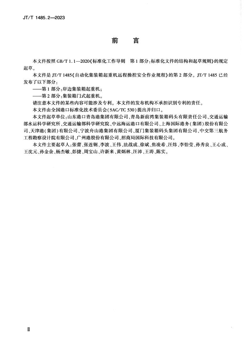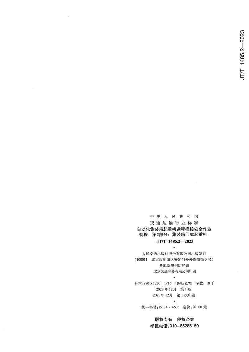 书名:自动化集装箱起重机远程操控安全作业规程 第2部分:集装箱门式起重机(JT/T 1485.2—2023)