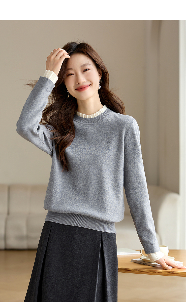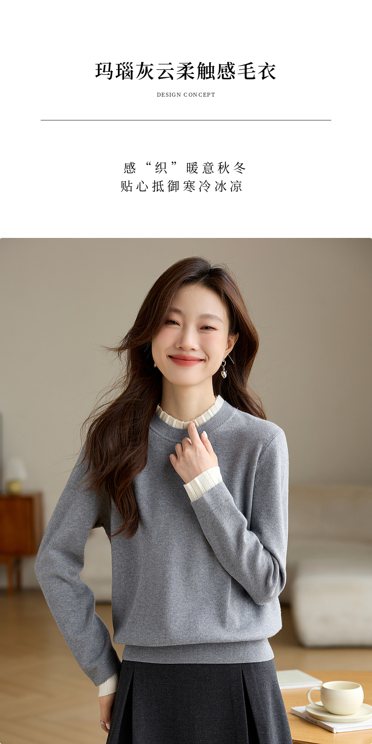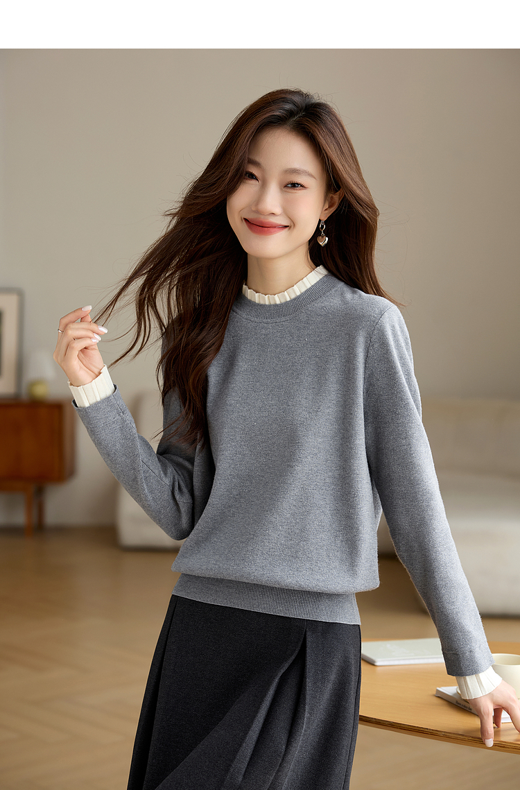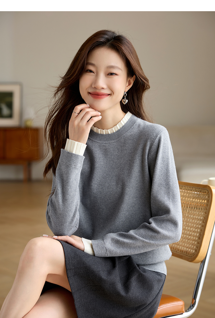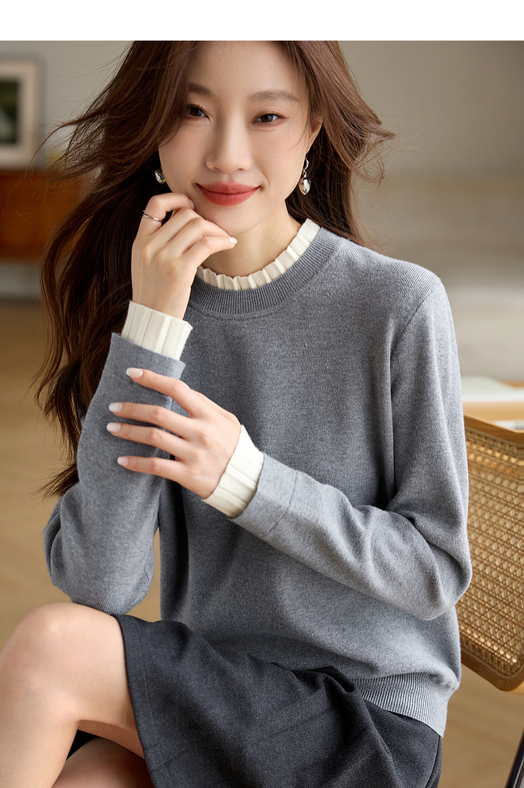 【专属特价】熙世界2025秋冬新款撞色木耳边圆领打底针织衫女长袖灰色软糯毛衣