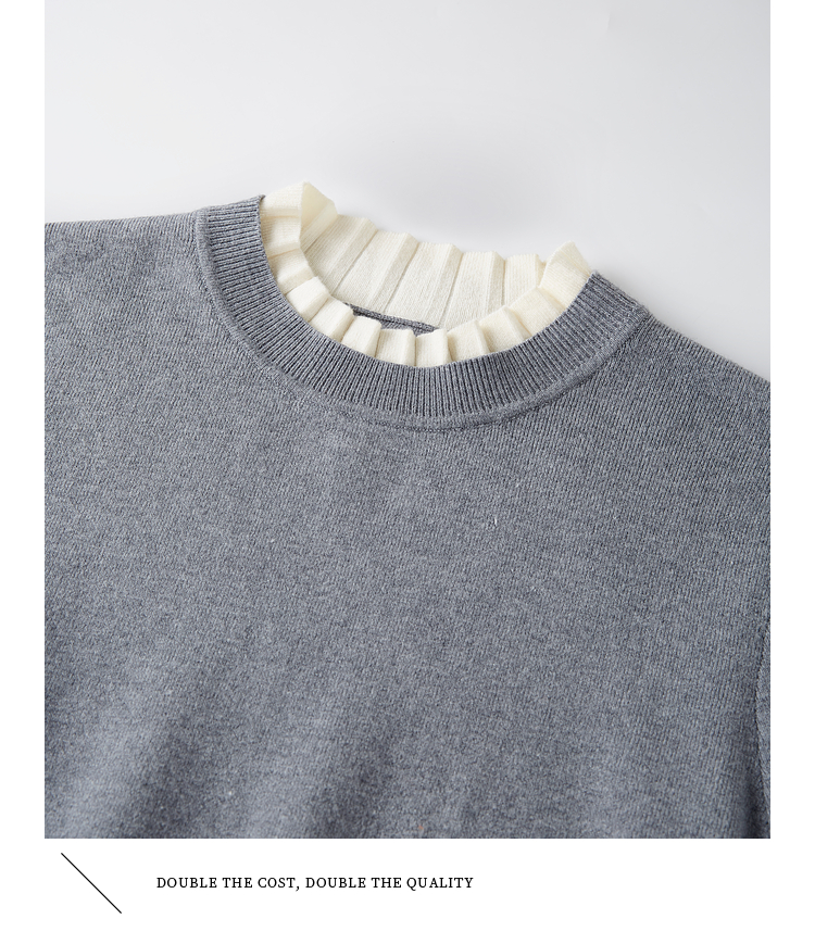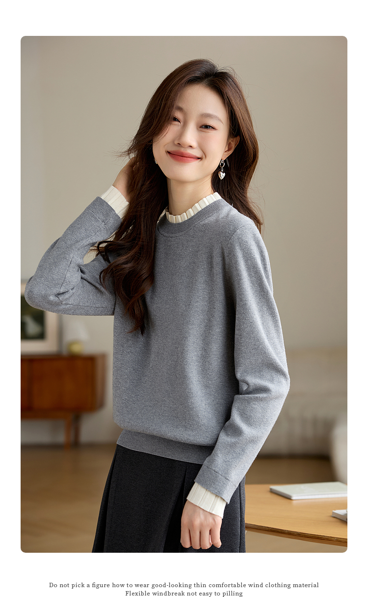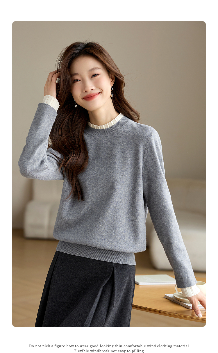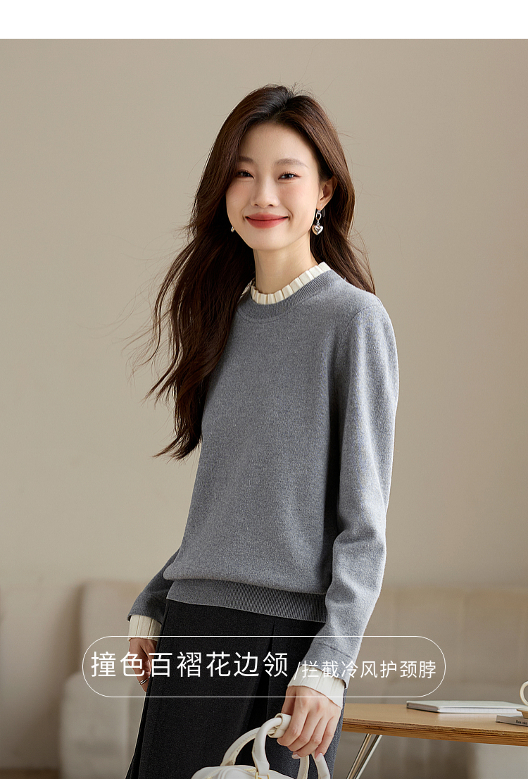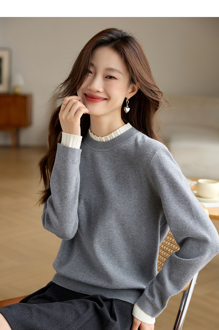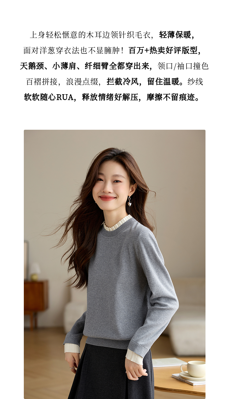 【专属特价】熙世界2025秋冬新款撞色木耳边圆领打底针织衫女长袖灰色软糯毛衣