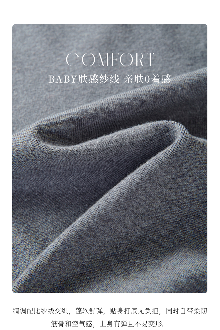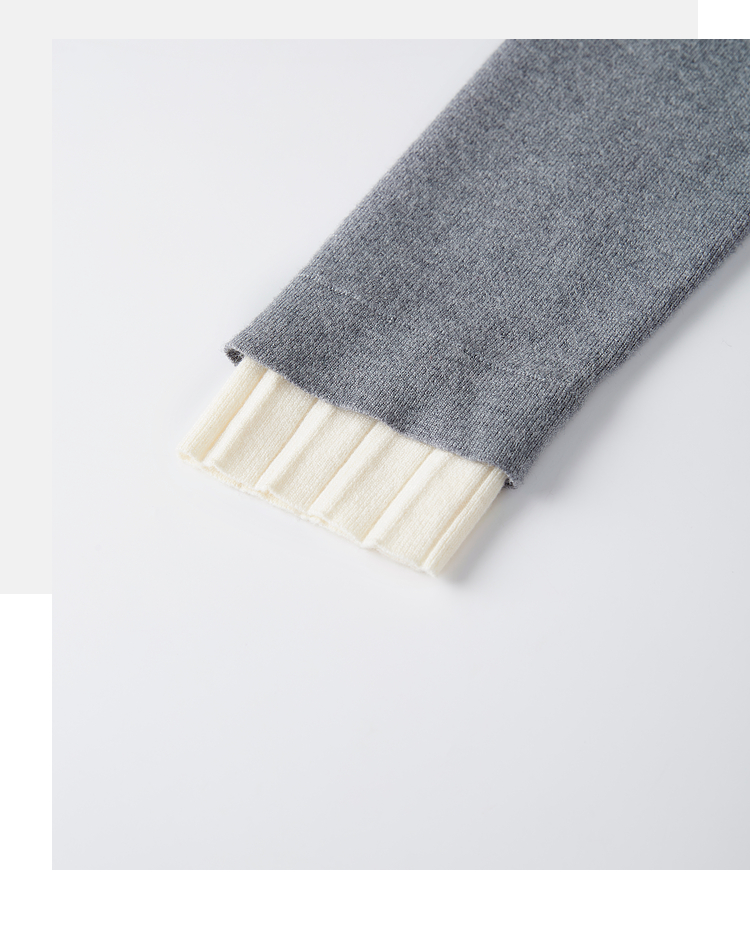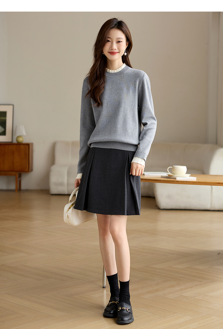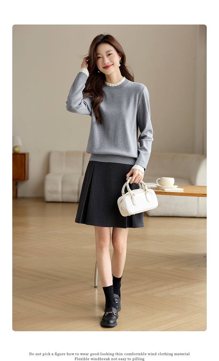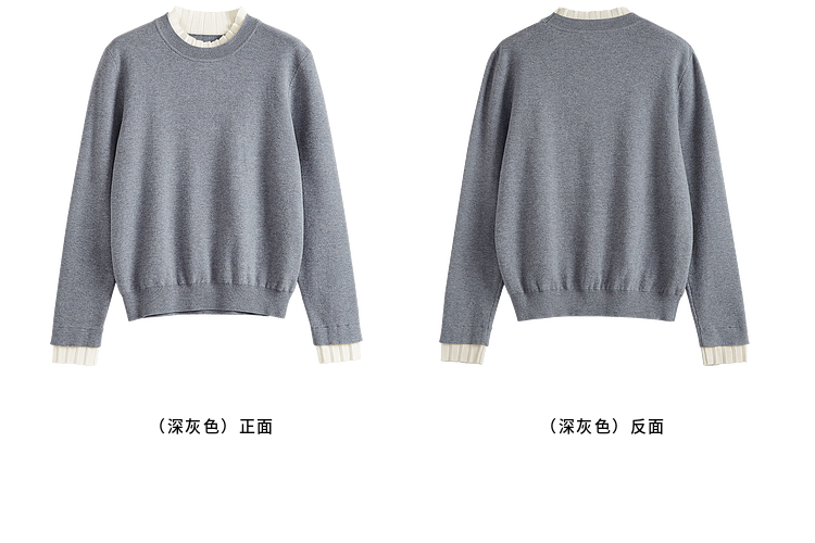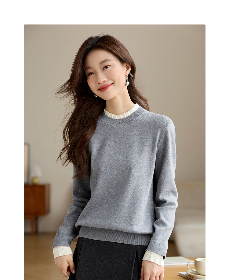 【专属特价】熙世界2025秋冬新款撞色木耳边圆领打底针织衫女长袖灰色软糯毛衣
