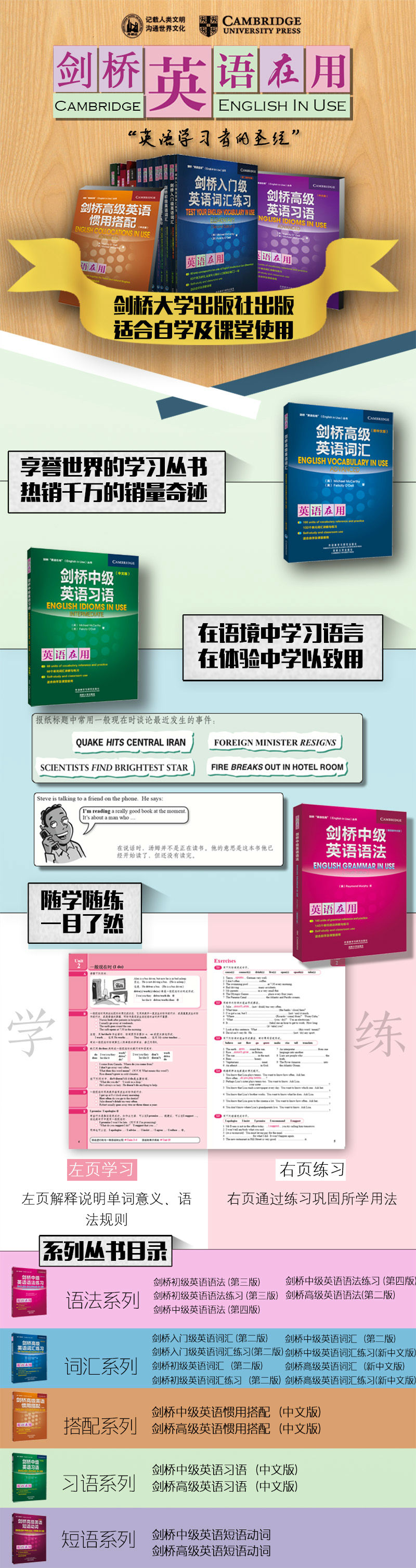 剑桥“英语在用”(English in Use)丛书是一套享誉全球的英语学习用书,自出版以来,销量已逾册。丛书专为英语国家的学习者编写,结构明晰,形式简约,重点突出,注重实用。鉴于剑桥“英语在用”丛书在学习者中的良好口碑,外语教学与研究出版社新引进了这套丛书的词汇、语法系列的修订新版,以及短语、习语等系列。希望读者朋友们通过这套高品质的学习用书,真正提高自己的英语水平。 《剑桥初级英语语法(第三版中文版)》属于该丛书的语法系列,适合初级英语学习者学习。全书共括115个单元,每个单元括两页,左页是对语法项目的讲解和例句,右页是相应的练习。每个单元讲解一个特定的语法项目,个别较难的语法项目用两个或更多单元讲解。书后附有练习答案。