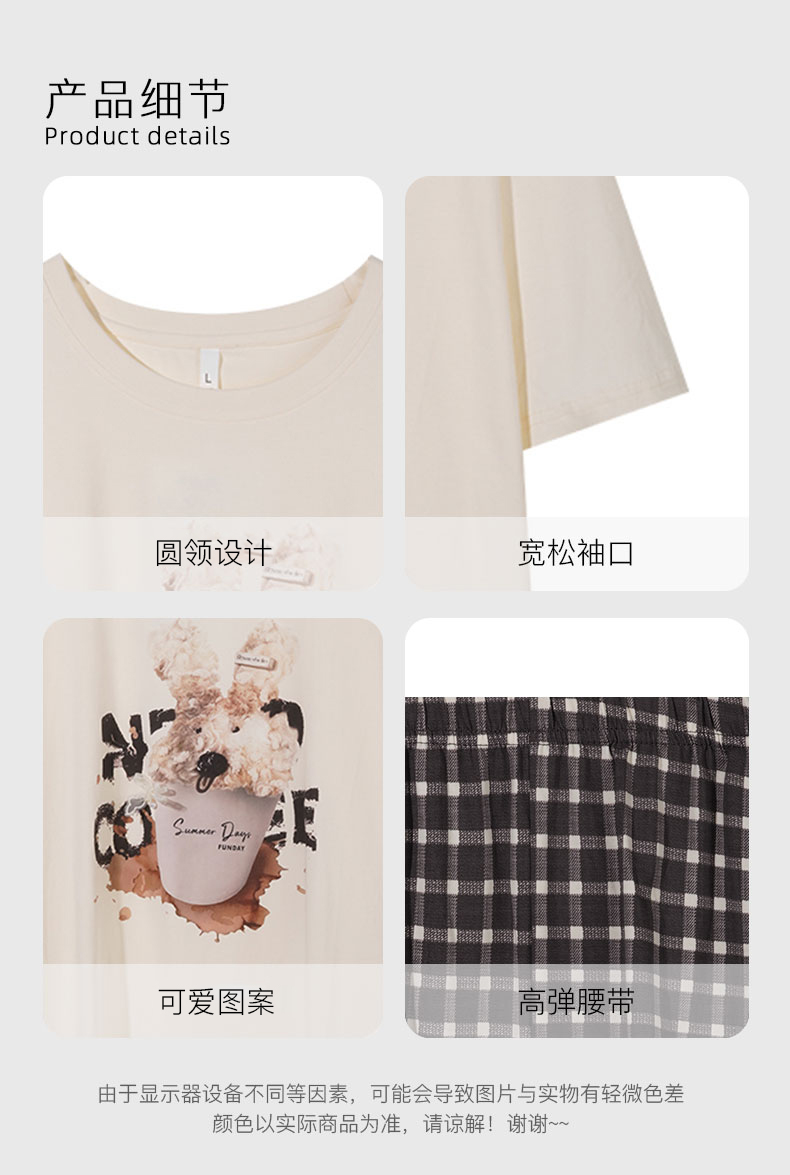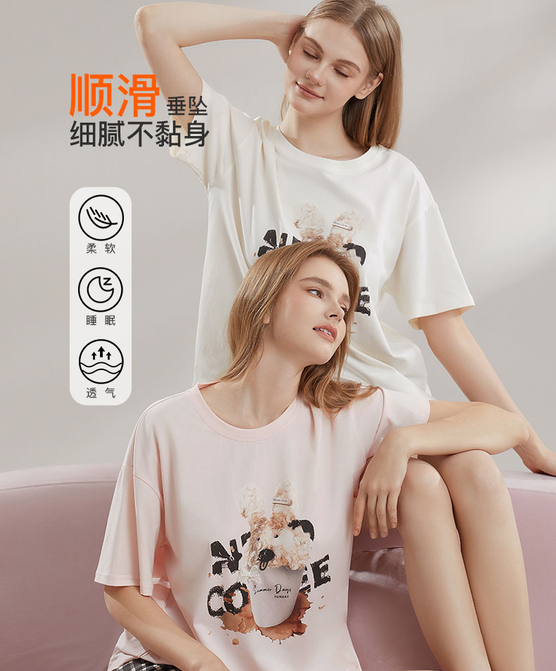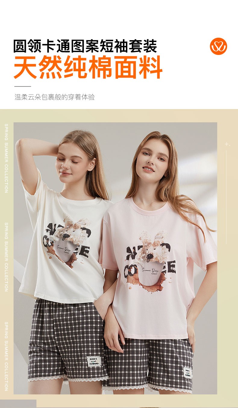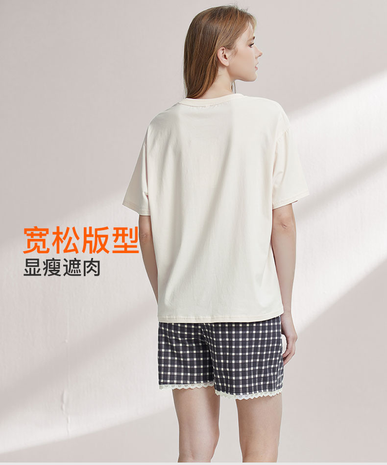 【7.5折限时特惠】【主推款】【秀黛】女圆领卡通图案短袖套装棉软糯垂坠蕾丝甜美女士夏季短袖睡衣家居服套装W2551063T【门店同款】
