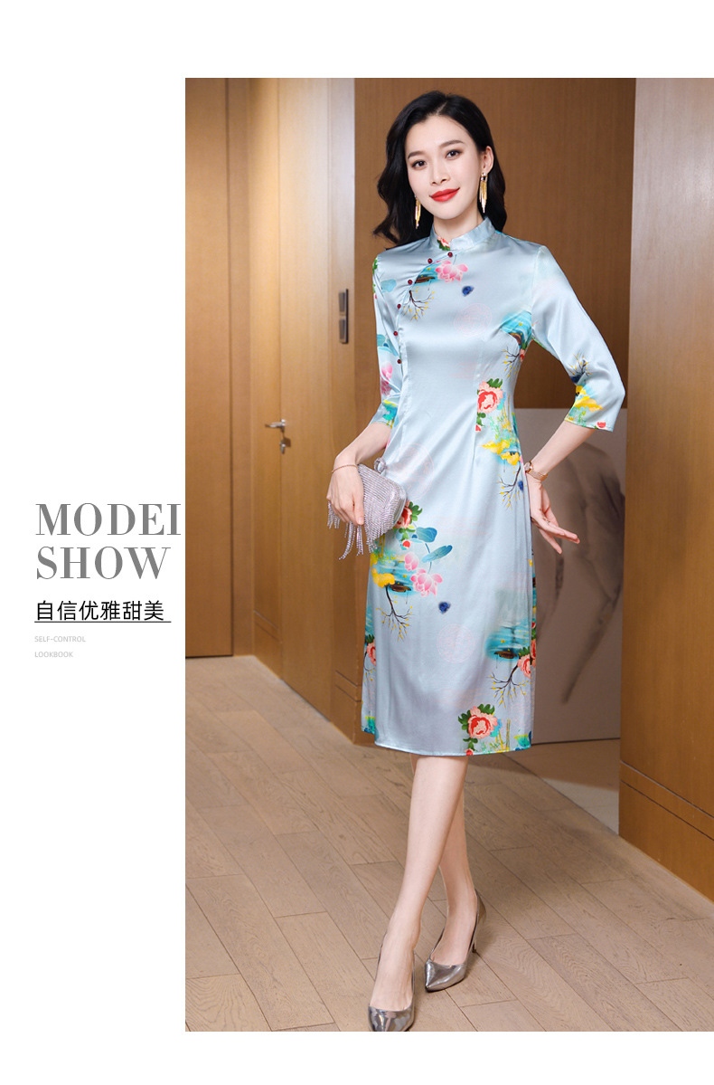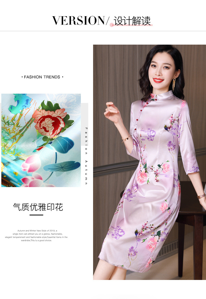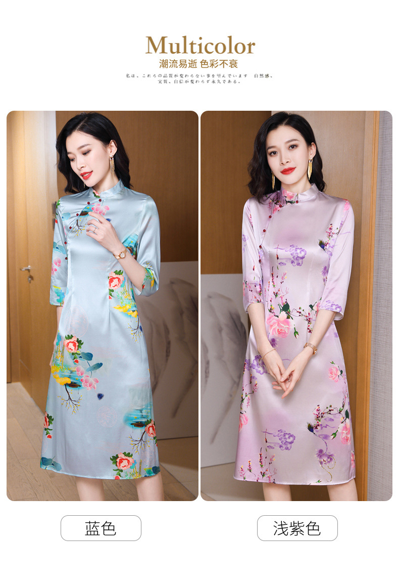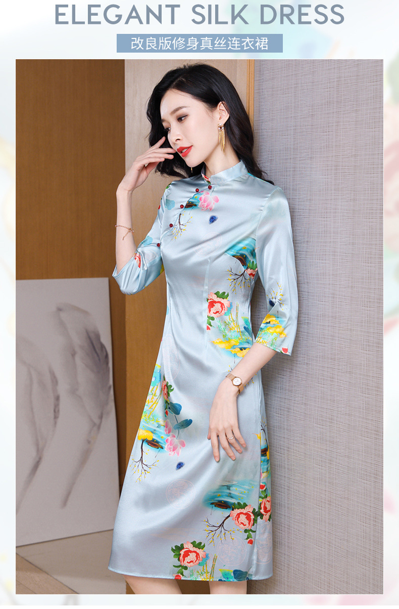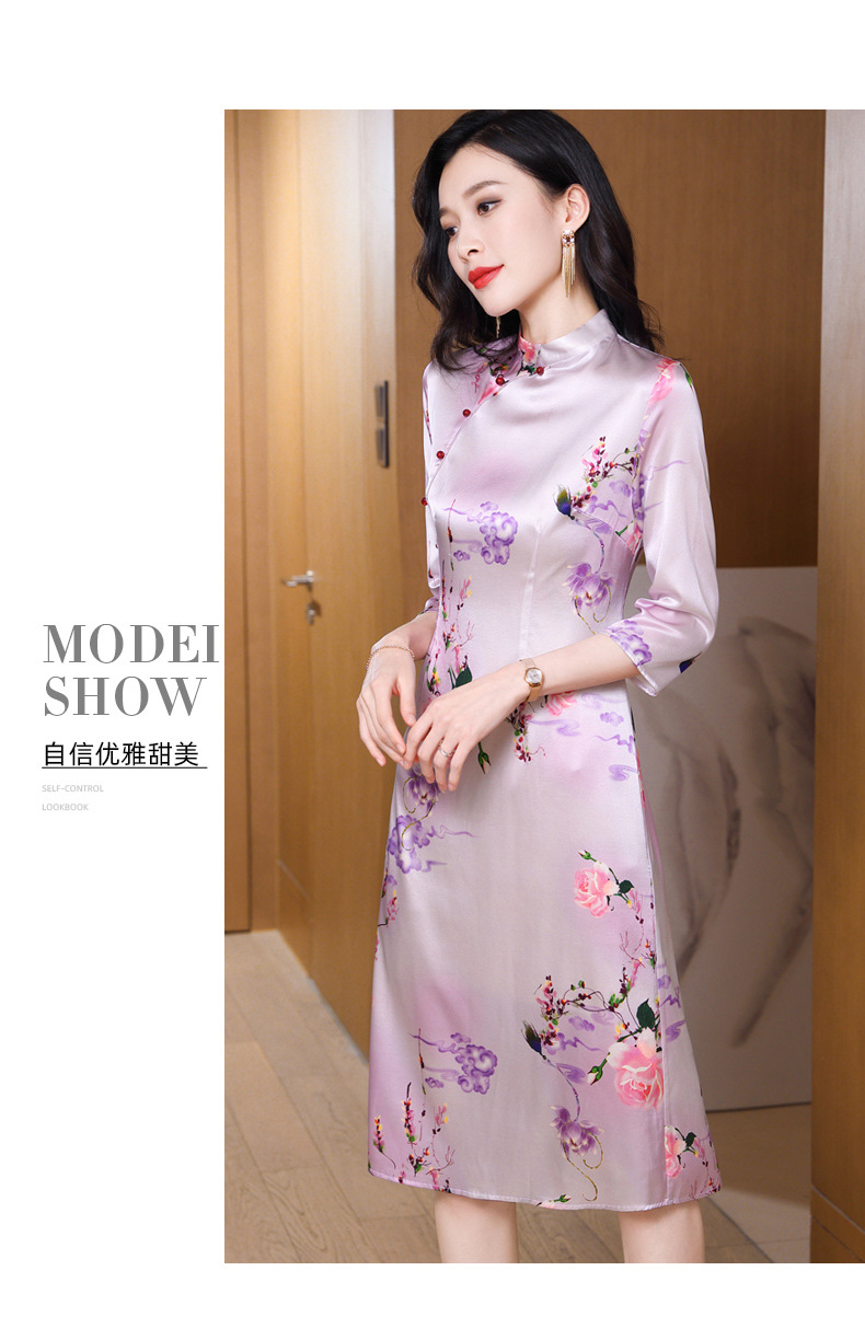 真丝改良旗袍,桑蚕丝年轻气质七分袖印花复古连衣裙KQN-27362