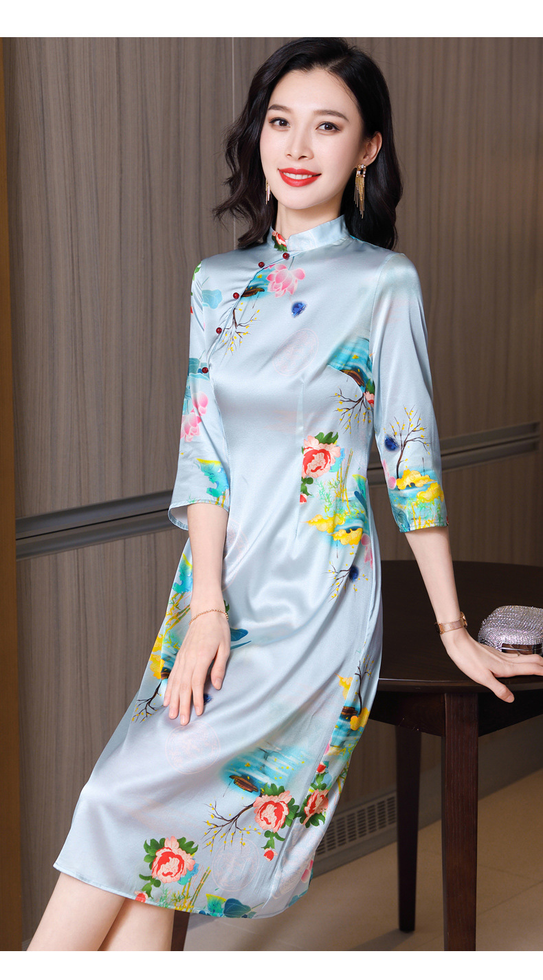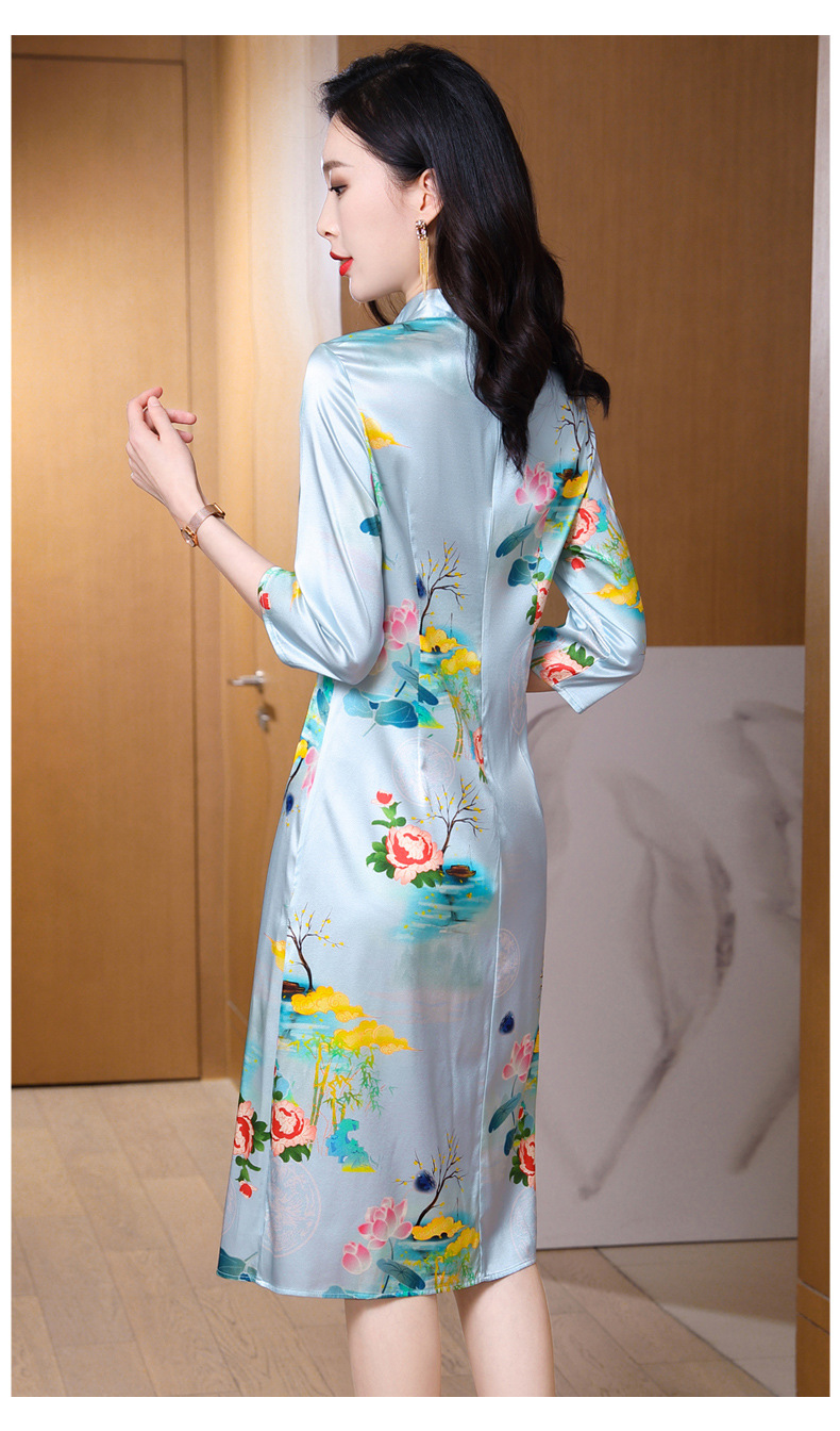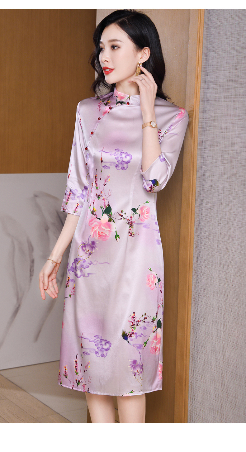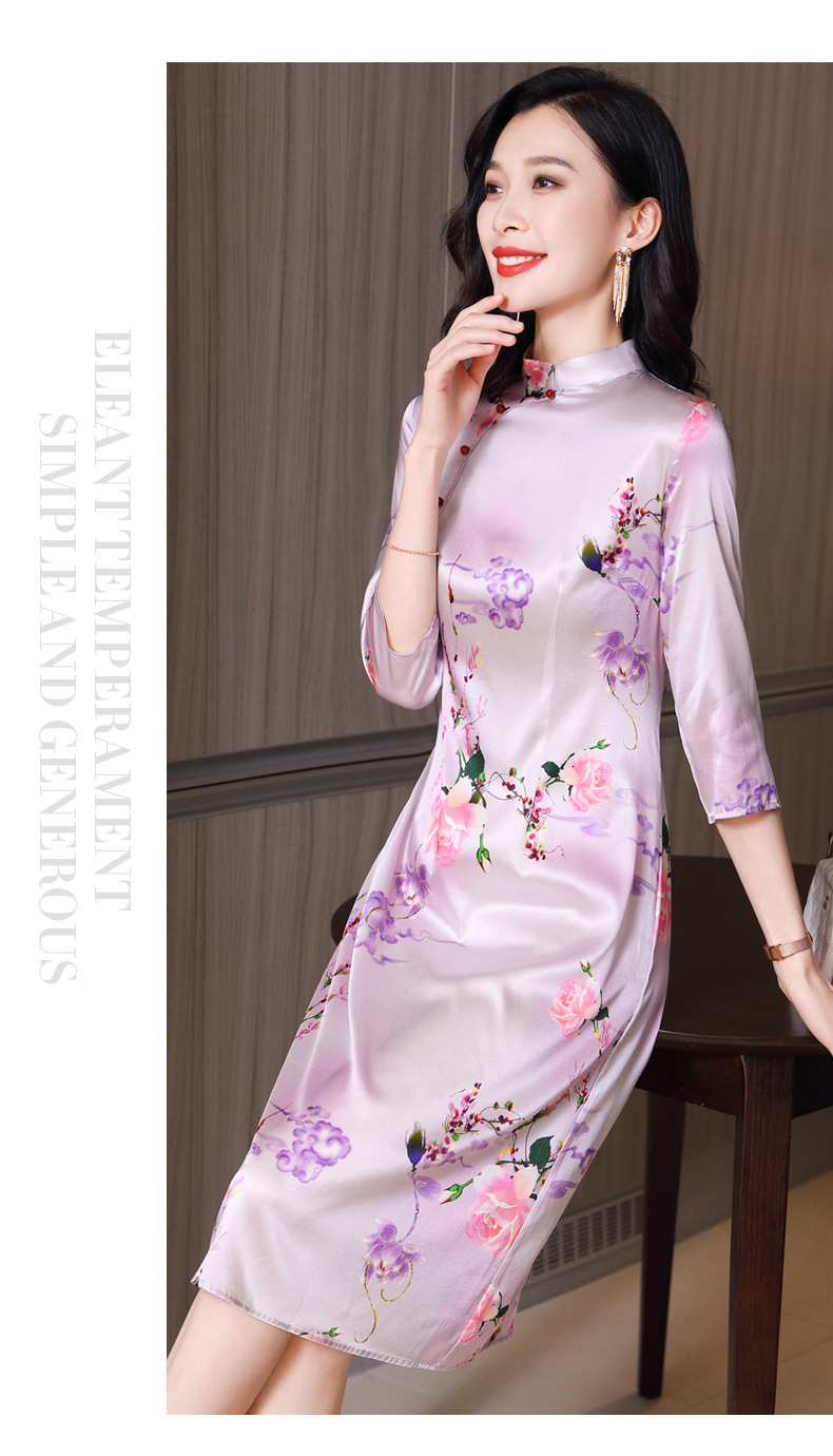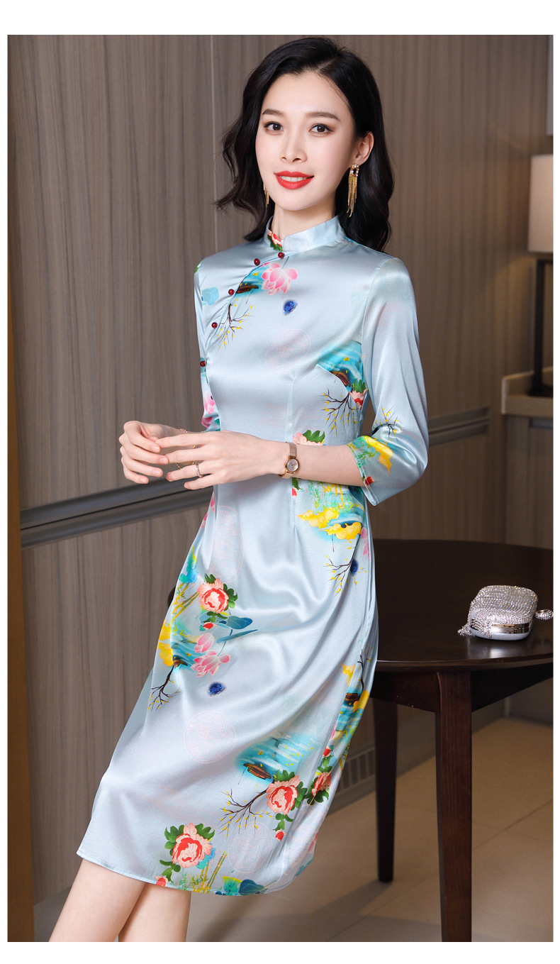 真丝改良旗袍,桑蚕丝年轻气质七分袖印花复古连衣裙KQN-27362