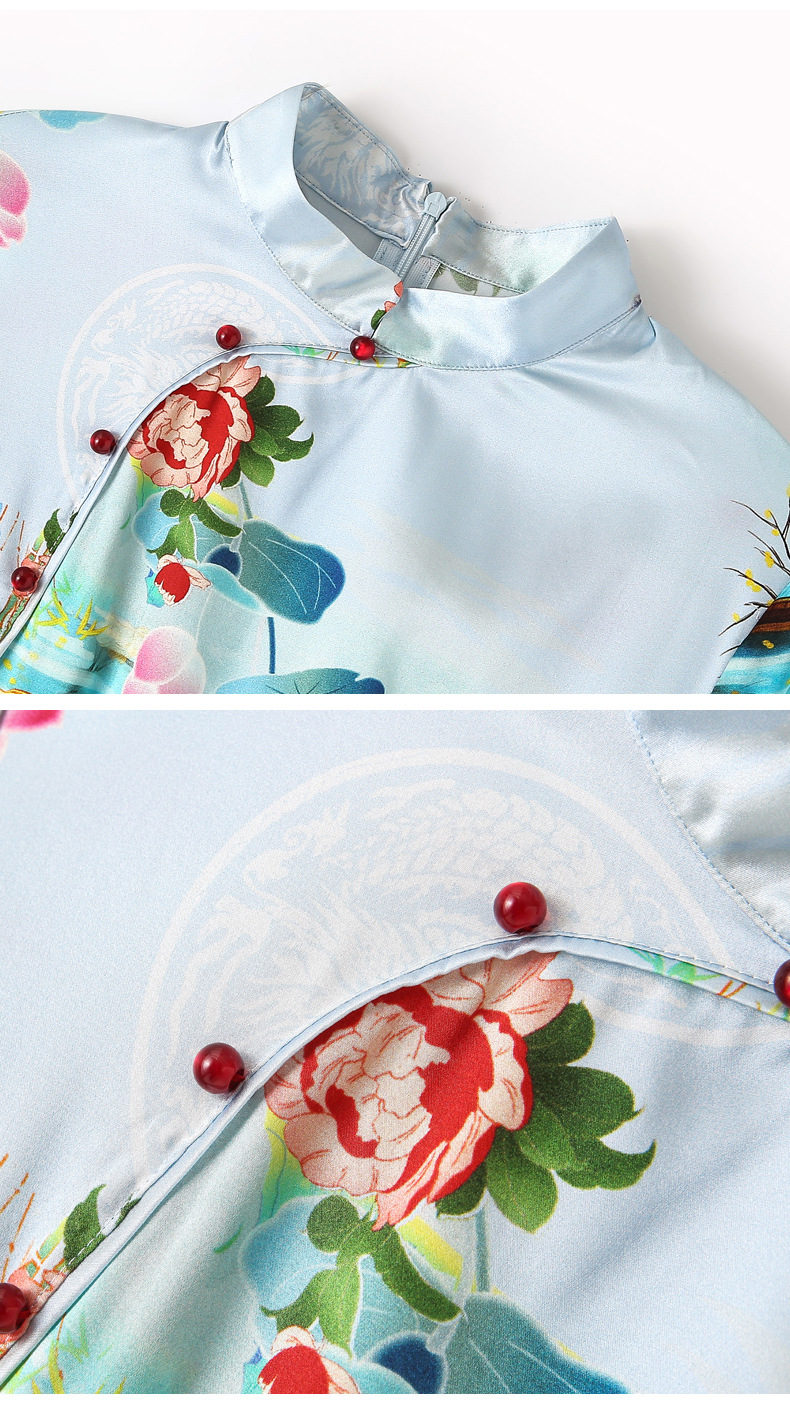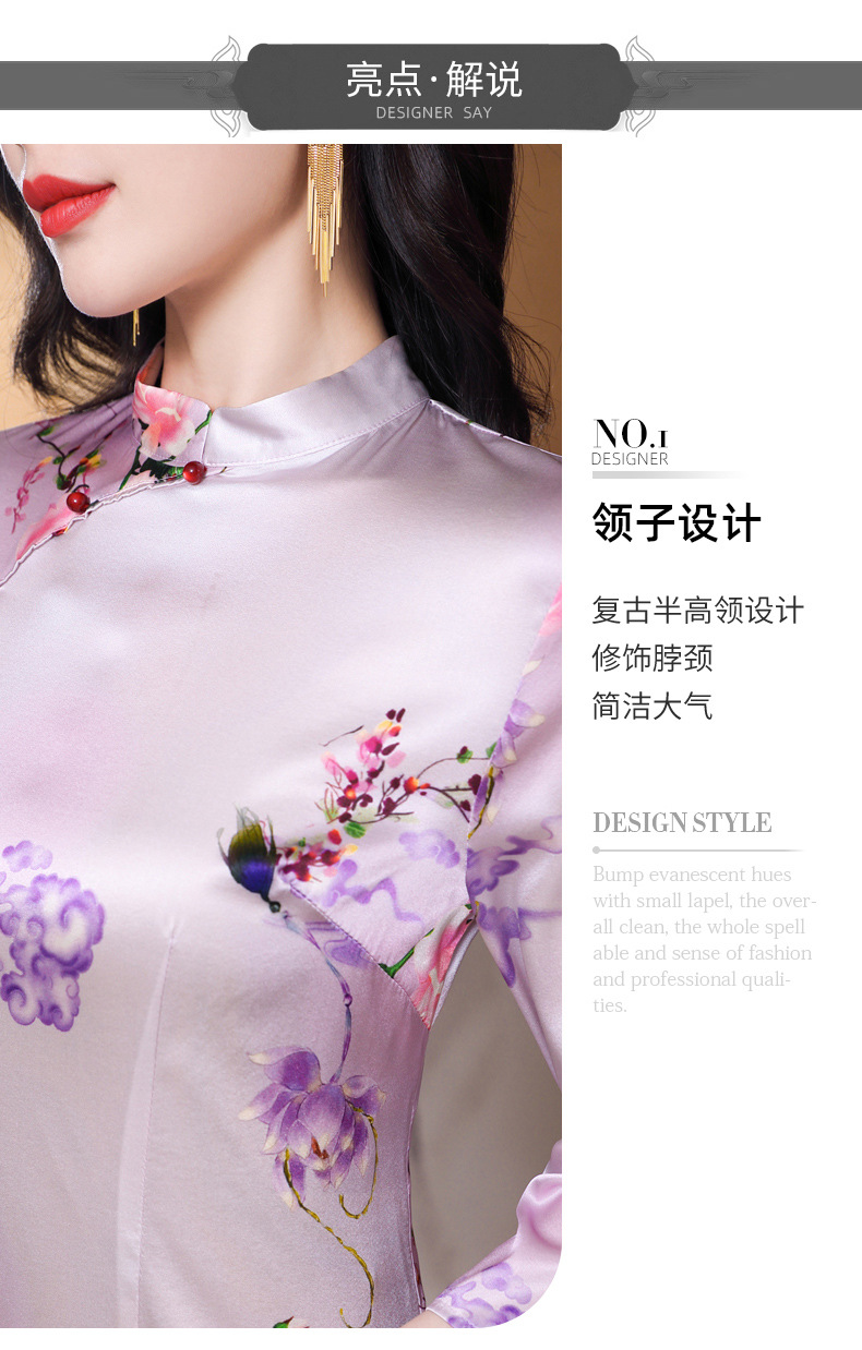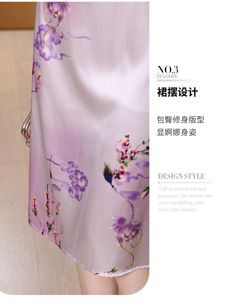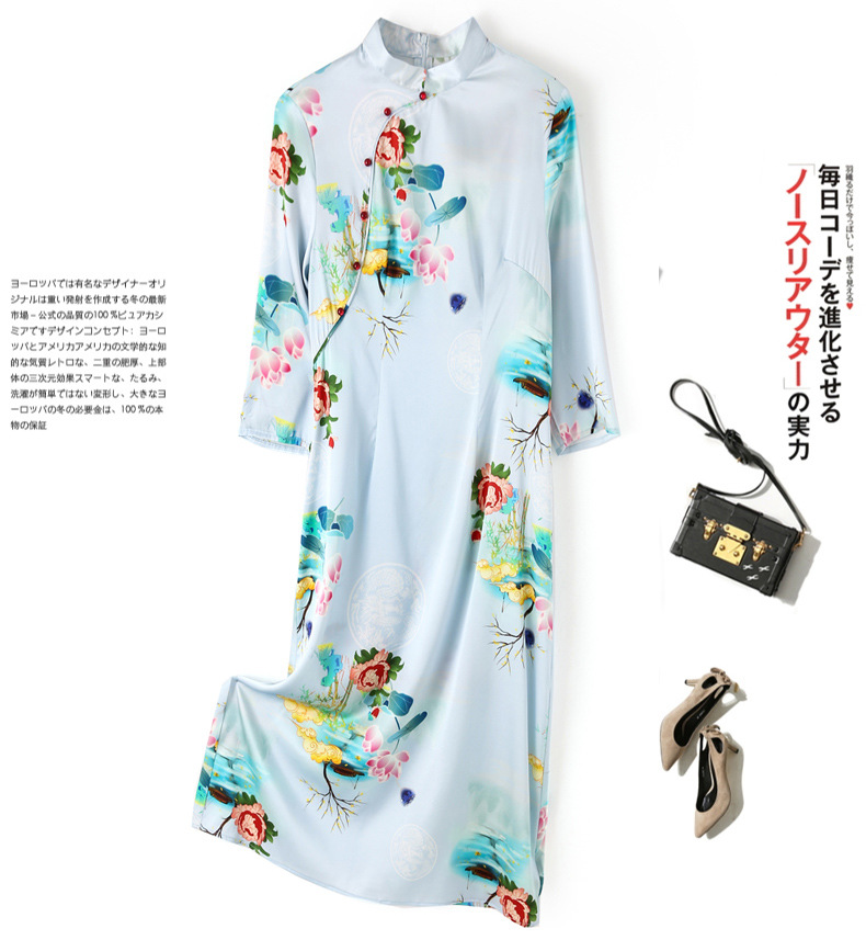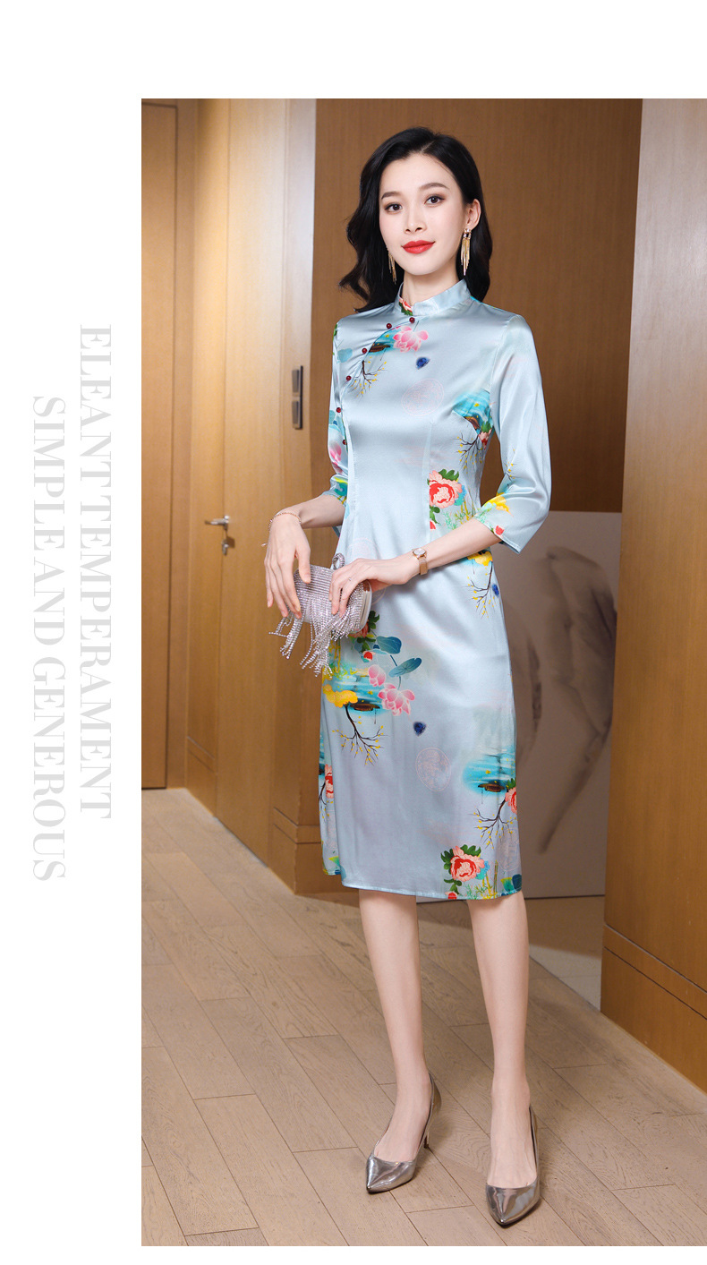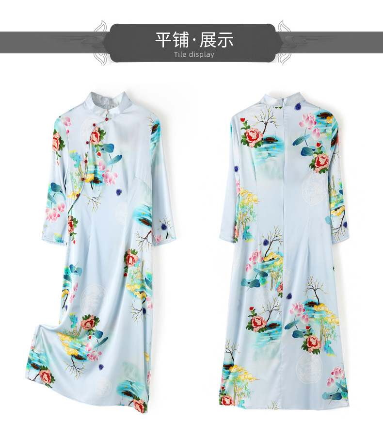 真丝改良旗袍,桑蚕丝年轻气质七分袖印花复古连衣裙KQN-27362