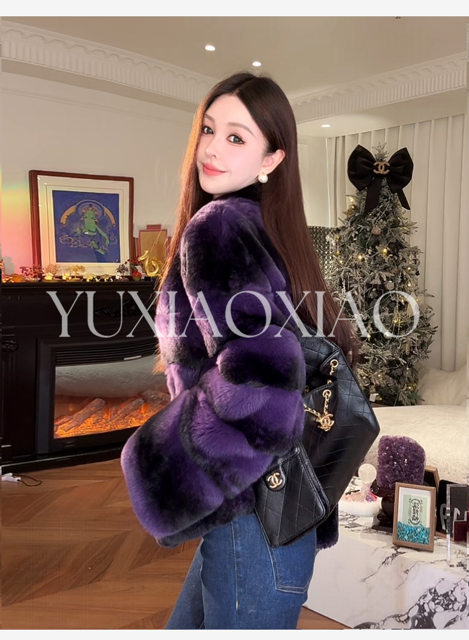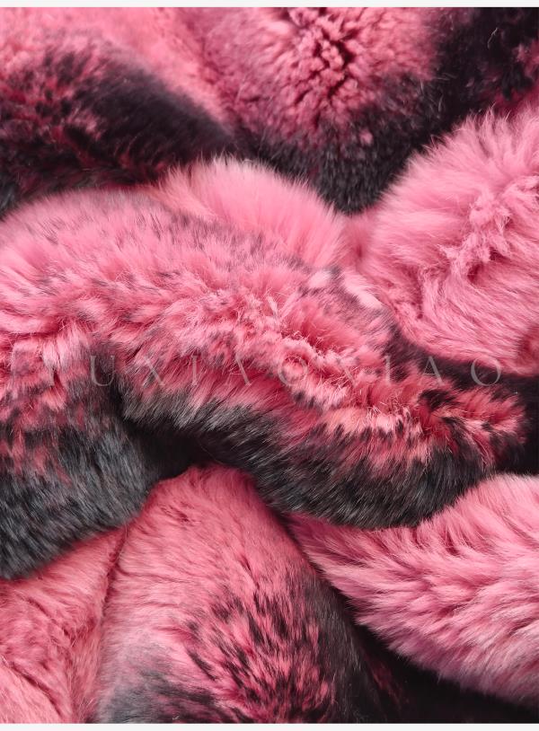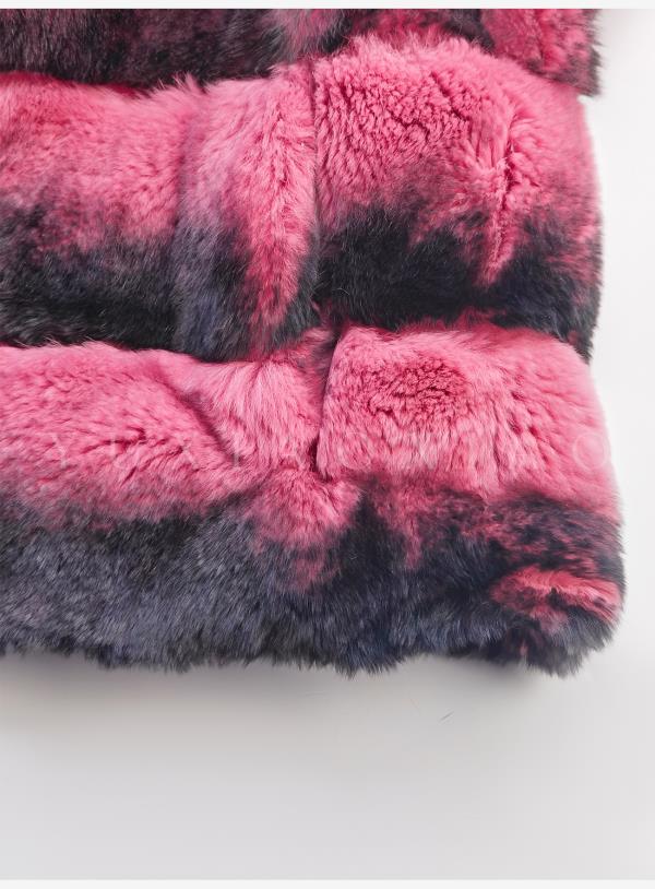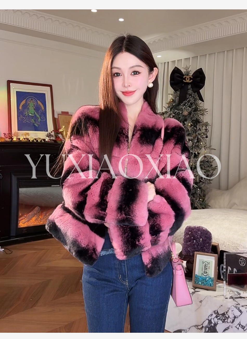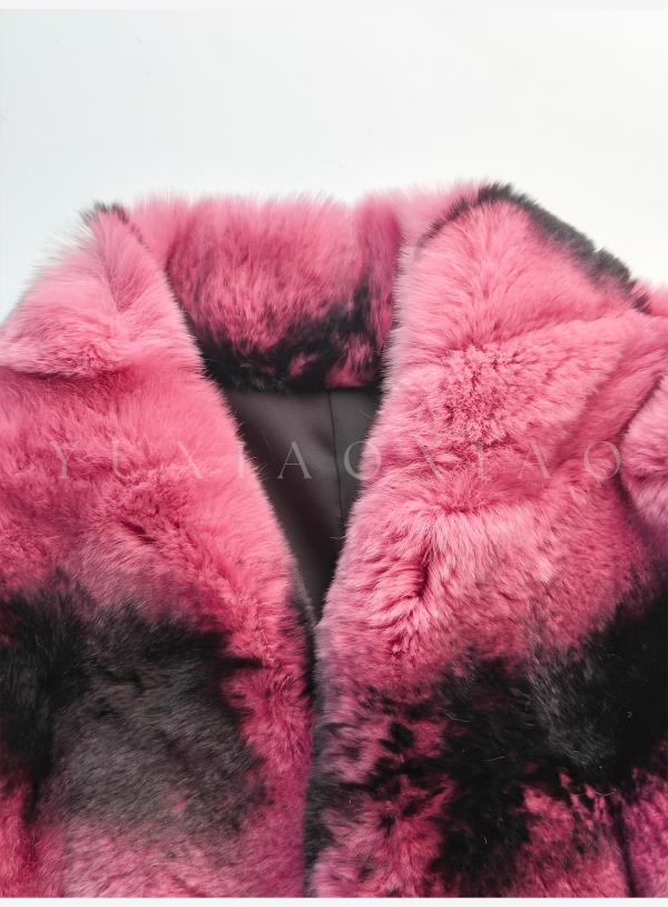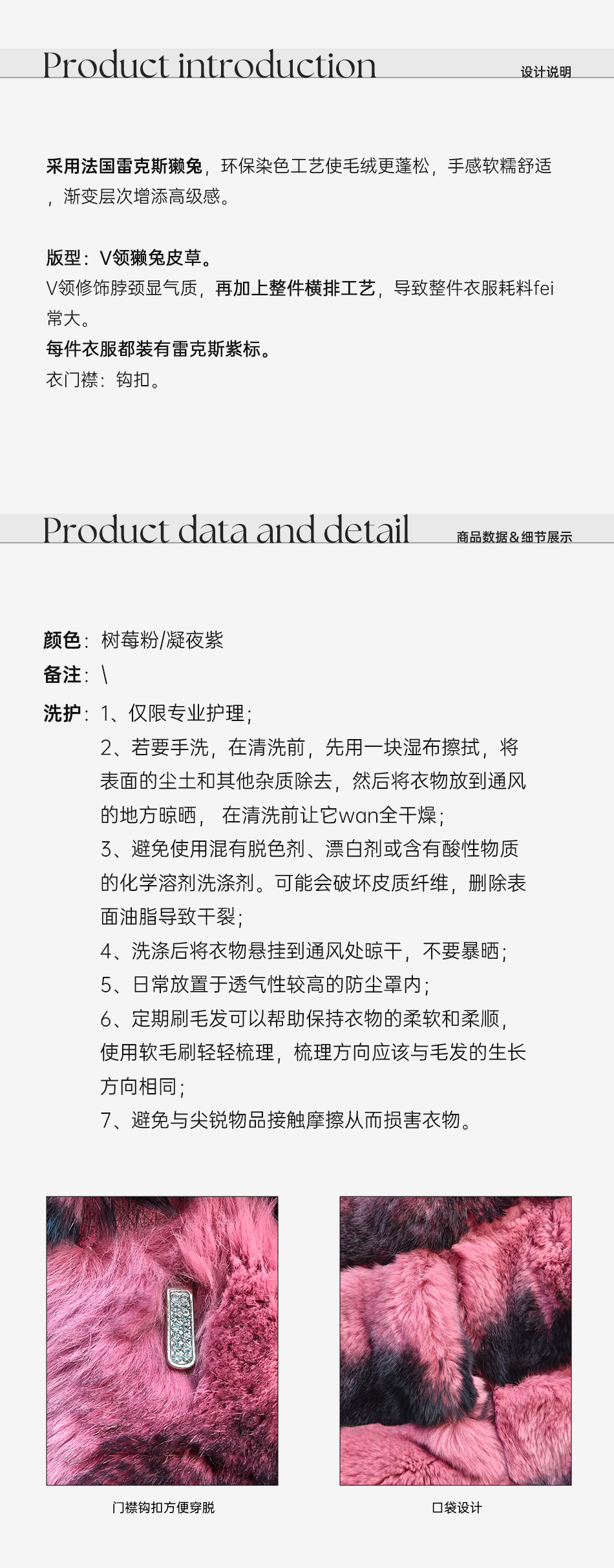 余潇潇【女星周刊】渐变层次整件横排雷克斯獭兔蓬松V领皮草外套