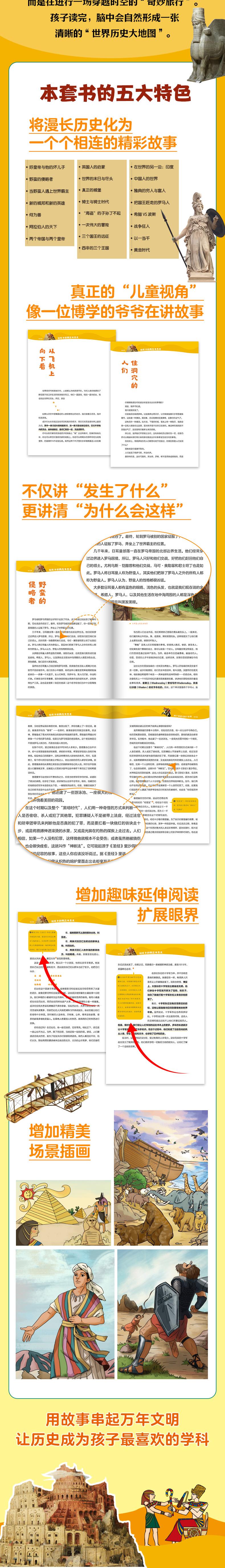 一本让历史“活”起来的故事书。它巧妙地从孩子熟悉的日常事物切入,将一个个精彩篇章编织成连贯的“纸上连环画”,把原本遥远的重要历史人物与关键事件,生动地呈现在孩子眼前。翻开它,孩子能见证万物起源的奥秘、先民钻木取火的智慧,探寻古埃及文明的璀璨、特洛伊战争的传奇;能聆听君王们的人生故事,了解世界文明进程中改变时代的重大发明,在字里行间触摸人类文明一步步走向辉煌的伟大足迹。