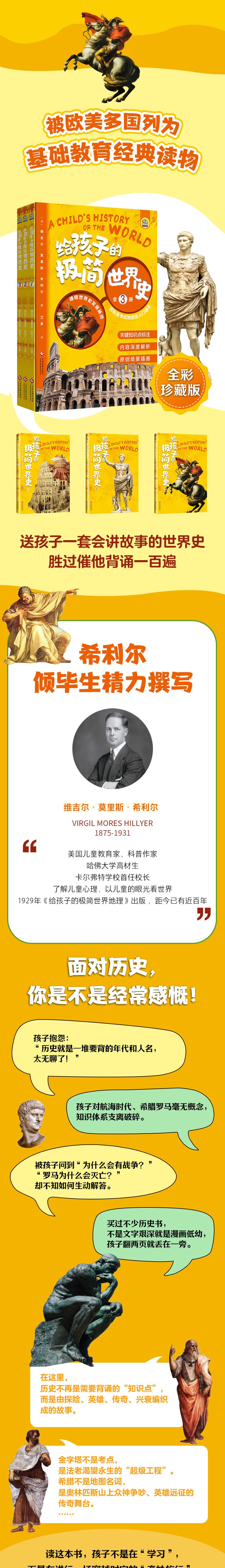 ·不背年代,不记人名,给孩子一张清晰的“世界地图” 告别枯燥的编年史和复杂的人物关系!本书以“极简”为核心,提炼出人类历史发展的核心事件。读完后,脑中会形成一张清晰的“历史大地图”,理解文明如何演变、世界如何连接,而非零散的知识碎片。 ·故事化叙事,让孩子像追剧一样“追”历史 将宏大的历史转化为一个个生动有趣的故事。关于阿拉伯数字、金字塔的建造、大航海时代的奇遇……本书用孩子听得懂、喜欢听的语言,把历史演变成引人入胜的故事, ·跨学科思维,培养孩子的“大历史观” 历史不仅是过去的事,它更与地理、科技、艺术、文化紧密相连。本书巧妙融合多学科知识,让孩子明白“为什么欧洲人喜欢航海”、“印刷术如何改变了欧洲?”,从小建立跨学科思考能力,以更宽广的视角理解世界。 ·丰富的插图与图解,让抽象历史“看得见” 大量精心设计的插图,将抽象的历史概念和复杂的文明变迁可视化。让历史知识过目不忘。 ·连接现实,回答孩子的“为什么” 为什么要建造金字塔?马拉松最早起源于哪里?解答孩子心中对世界起源的种种疑问。