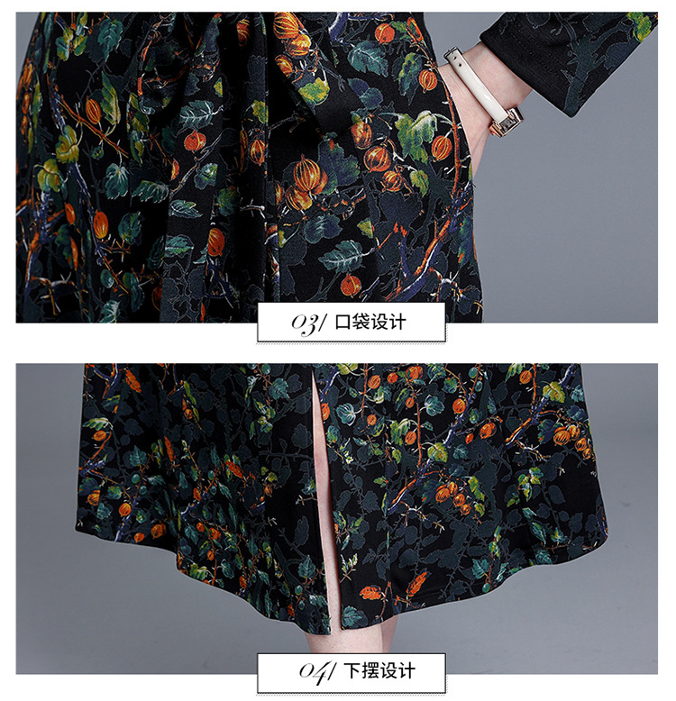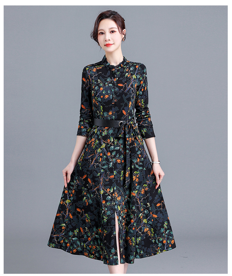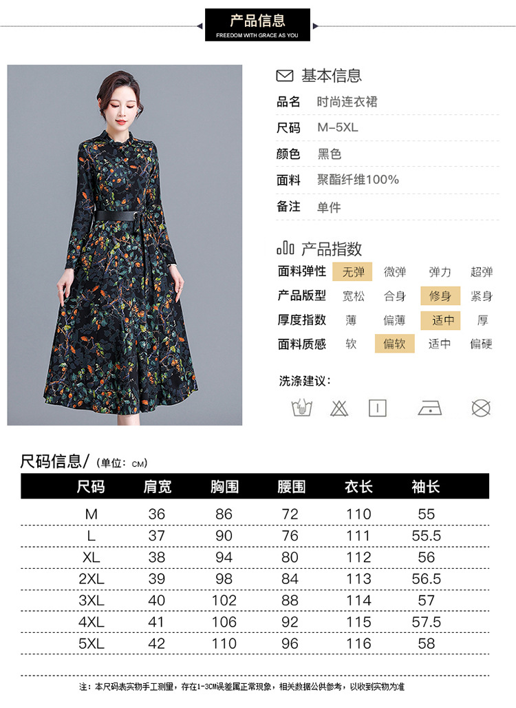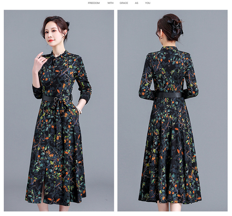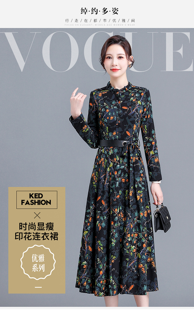 优雅修身,印花收腰腰带圆领花边连衣裙QYM-KED-8301-Y