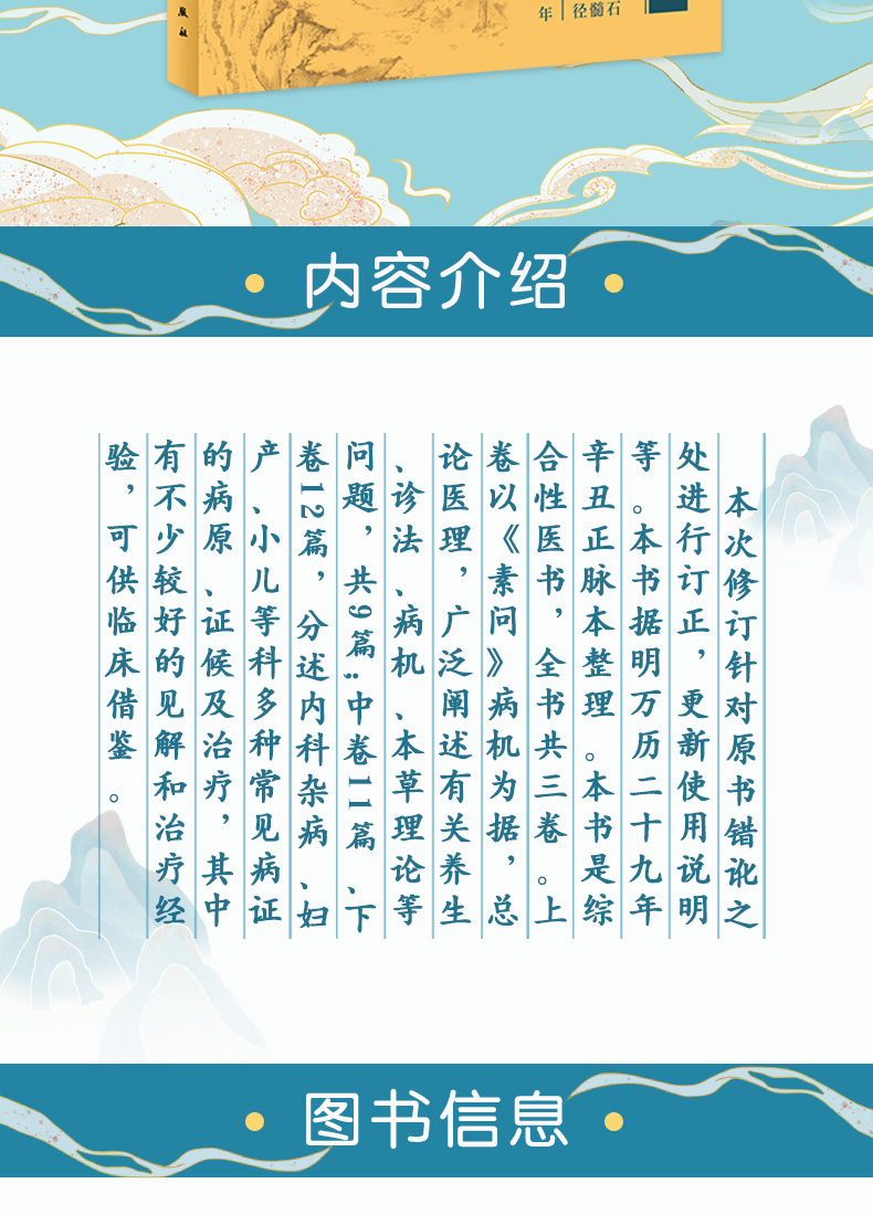 本书系中医临床必读丛书之一。该丛书畅销十余年,累计数百万销量,久居图书畅销榜前列。所选医籍均为精善底本,为读者提供精确的原文。本次修订针对原书错讹之处进行订正,更新使用说明等。本书据明万历二十九年辛丑正脉本整理。本书是综合性医书,全书共三卷。上卷以《素问》病机为据,总论医理,广泛阐述有关养生、诊法、病机、本草理论等问题,共9篇;中卷11篇、下卷12篇,分述内科杂病、妇产、小儿等科多种常见病证的病原、证候及治疗,其中有不少较好的见解和治疗经验,可供临床借鉴。