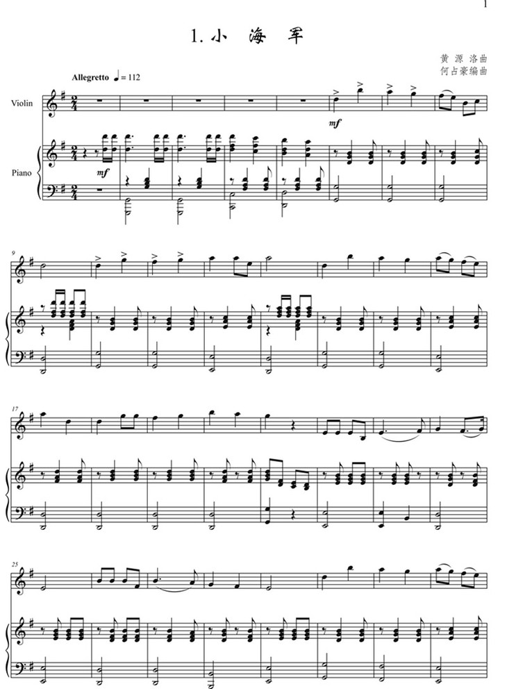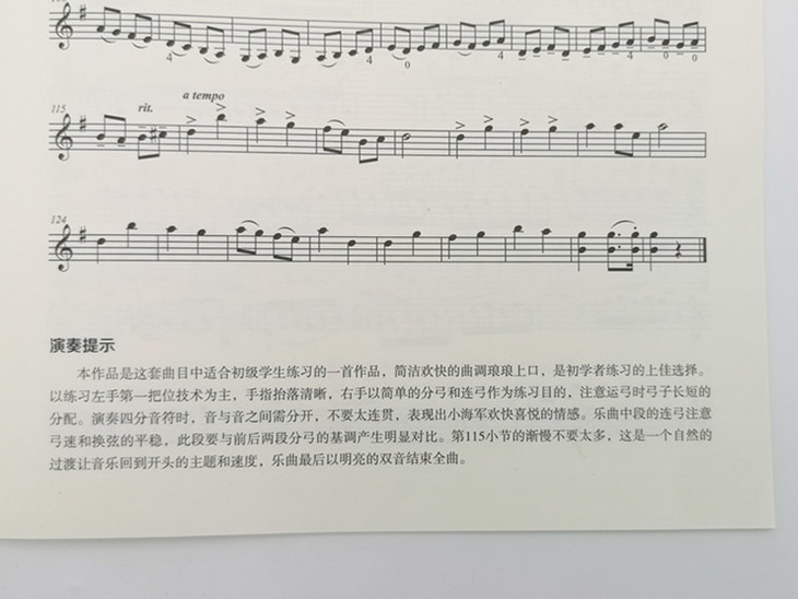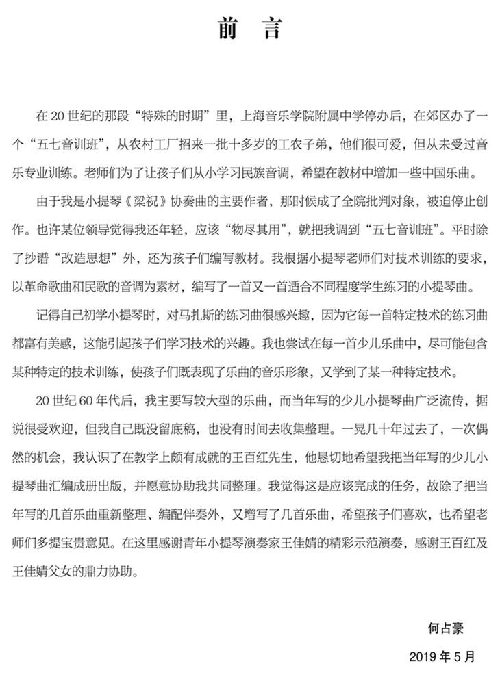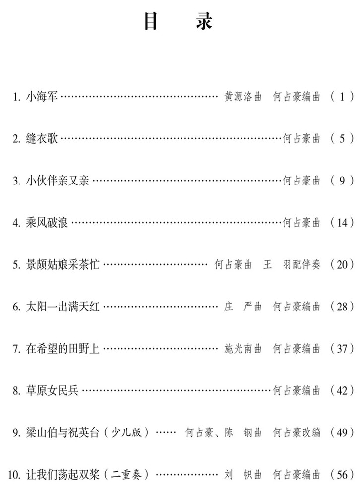 由何占豪先生编写的这本少儿小提琴曲精选包含十首乐曲,何占豪将经典中国民谣如《小海军》《太阳一出满天红》《在希望的田野上》《让我们荡起双桨》编写为适合琴童学习演奏的练习曲目,让孩子们在享受耳熟能详的旋律中提高演奏技术,另外六首则是何占豪亲自编写的曲子,由简入难,最后加以二重奏版本,不仅让学童提高个人演奏水平,同时也学会如何与他人合作。