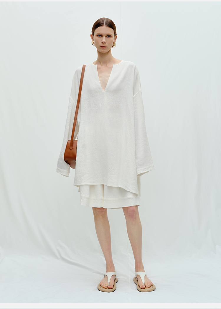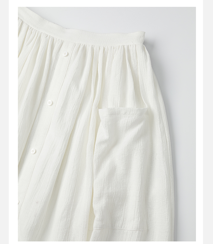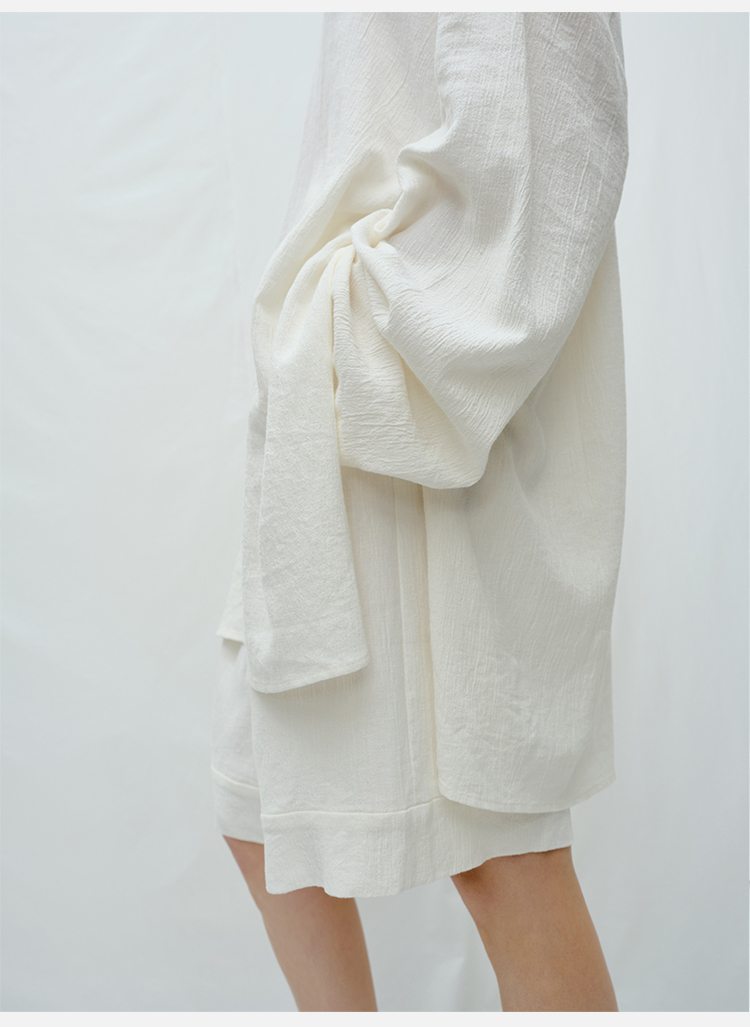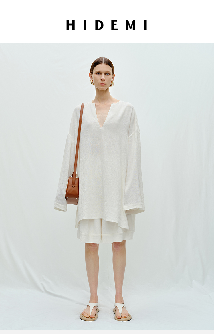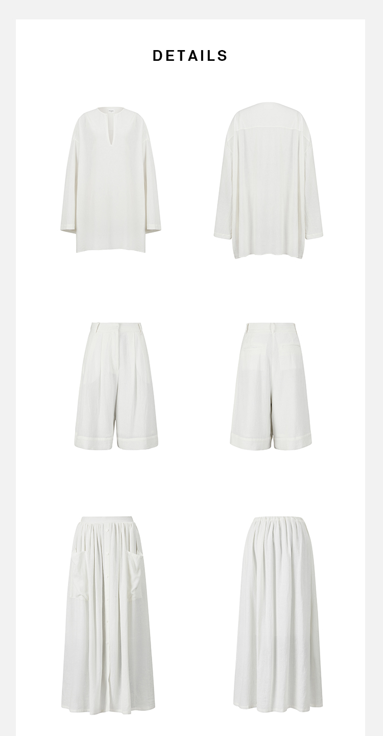 HIDEMI度假系列白色艺术感水洗亚麻阔型慵懒伞状三件套 衬衫/半身裙/中短裤