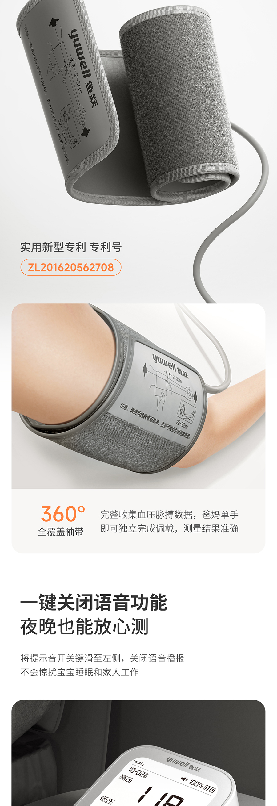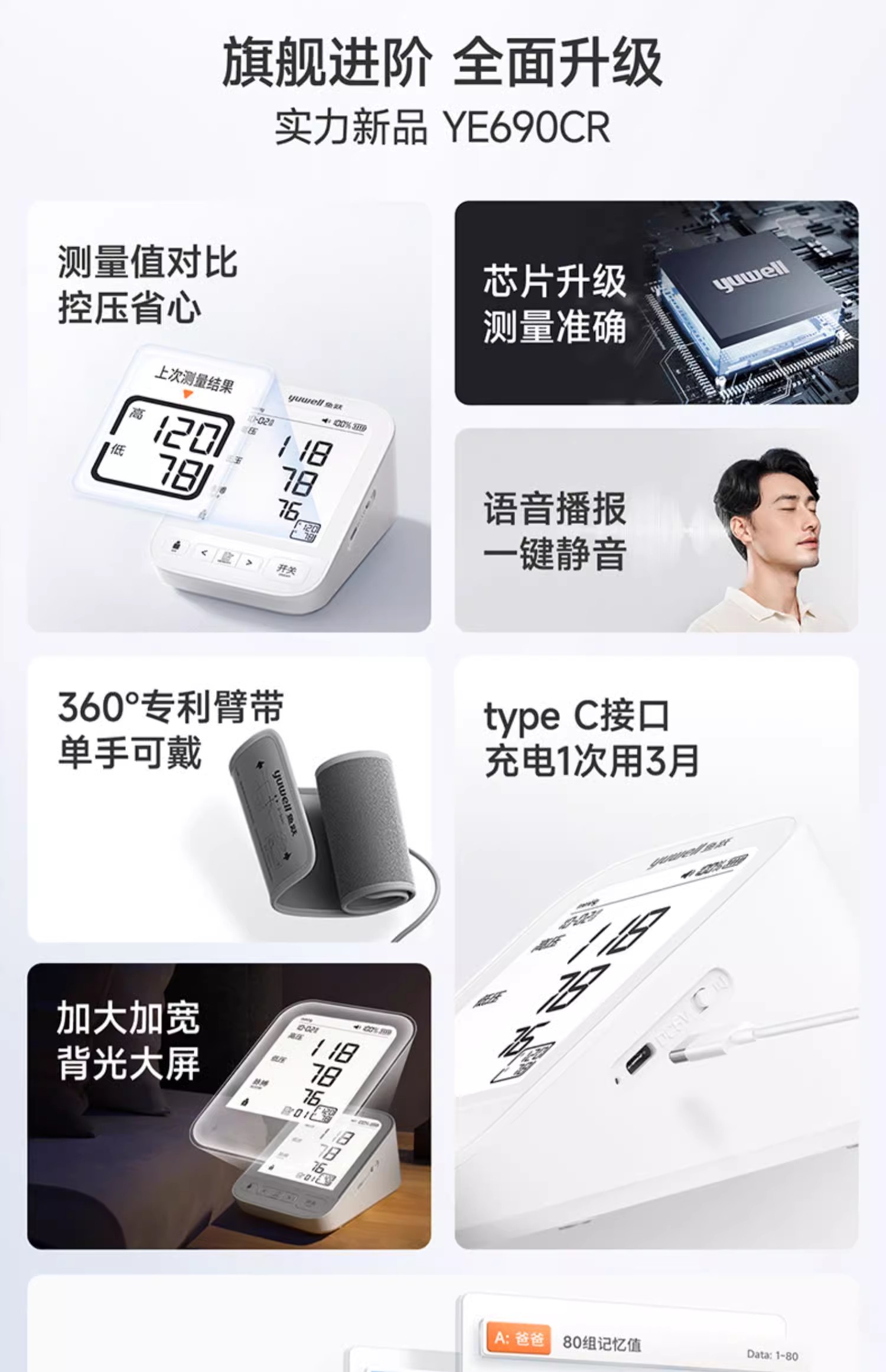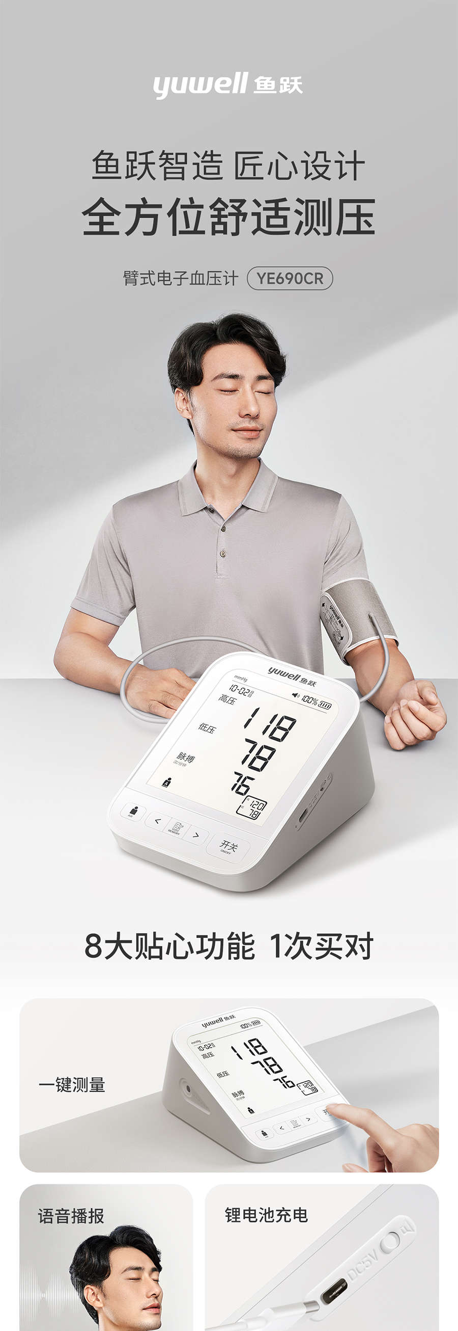 鱼跃YE690CR电子血压计上臂式大屏语音旗舰充电款