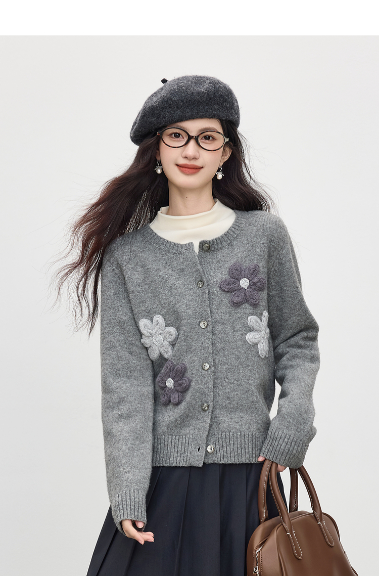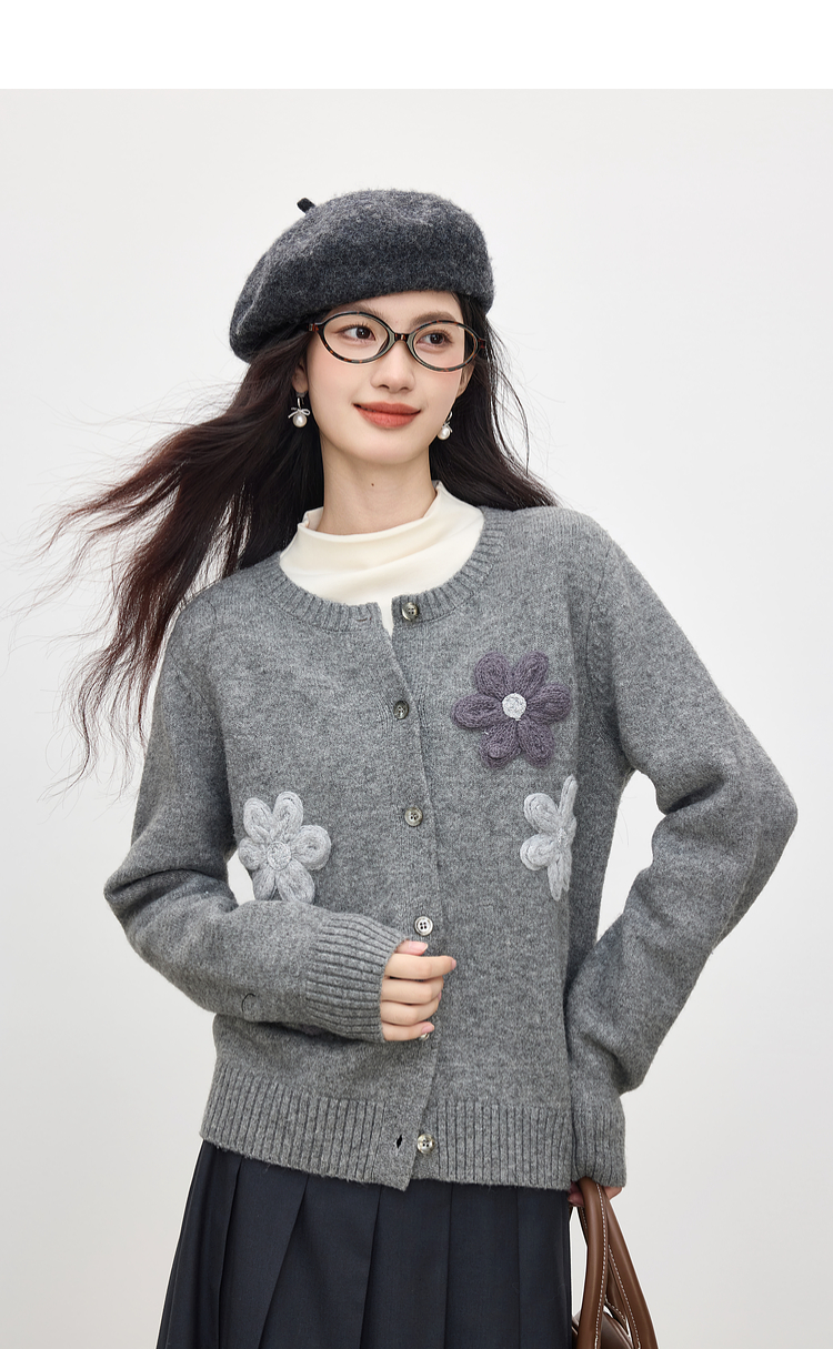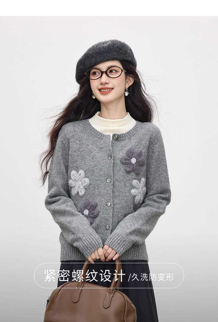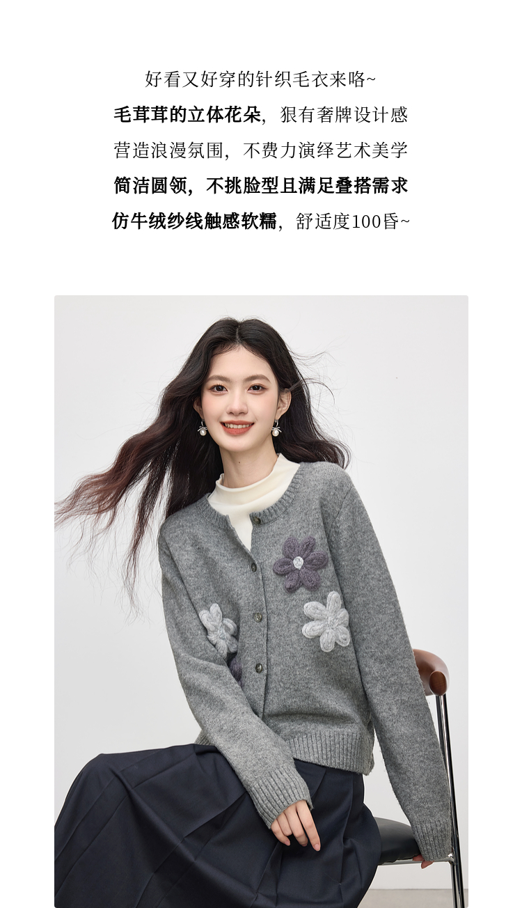 【周四狂欢价】熙世界仿牛绒立体花朵毛衣开衫女2025秋冬新款软糯灰色针织短外套