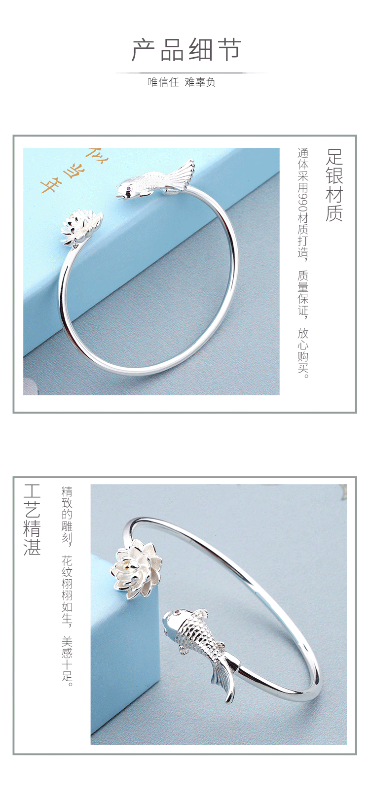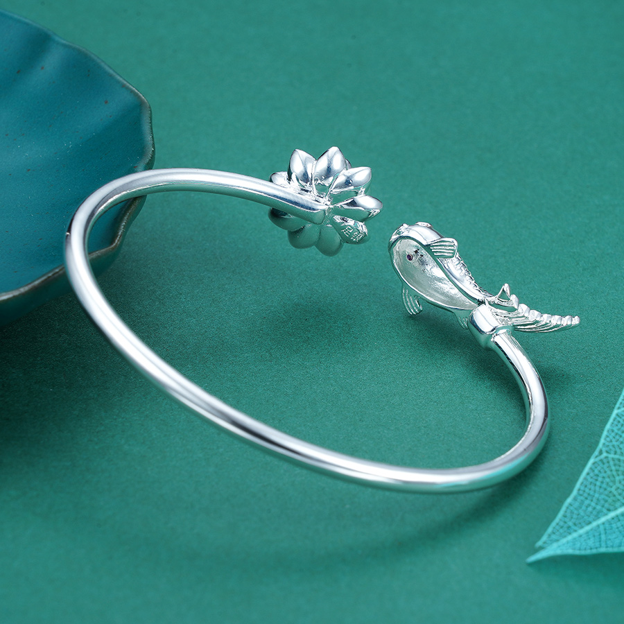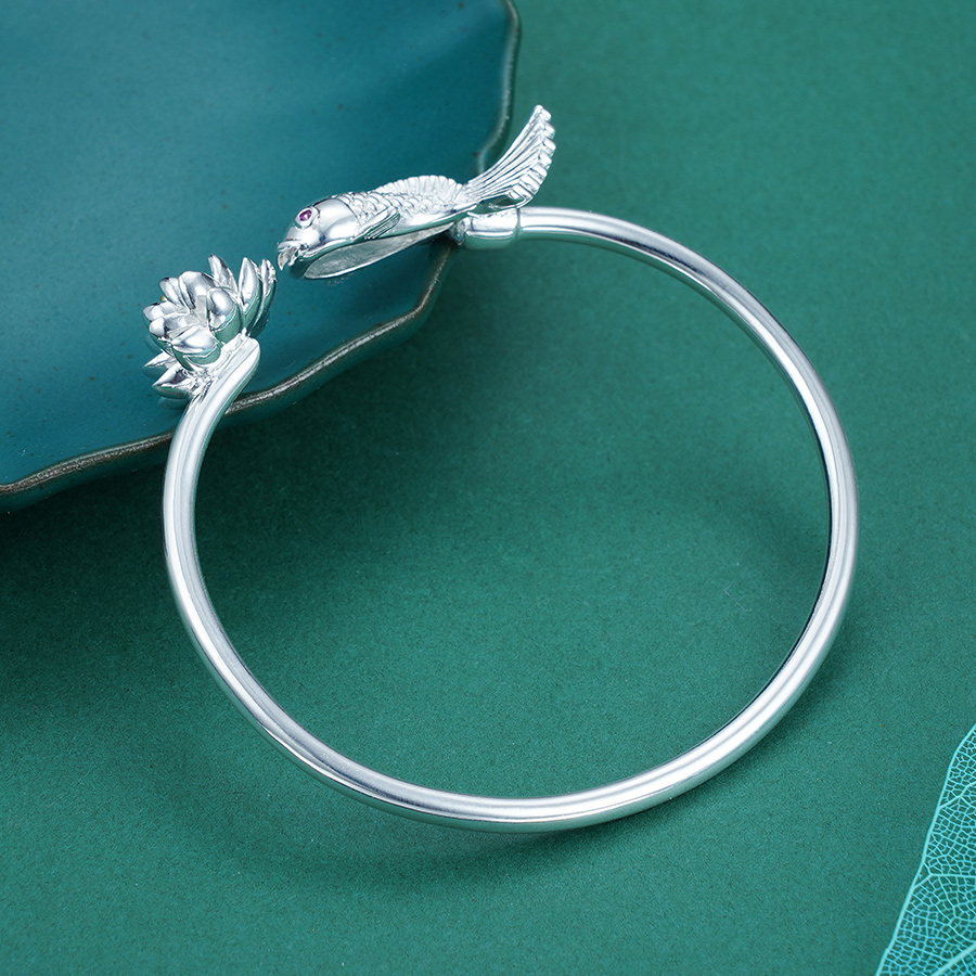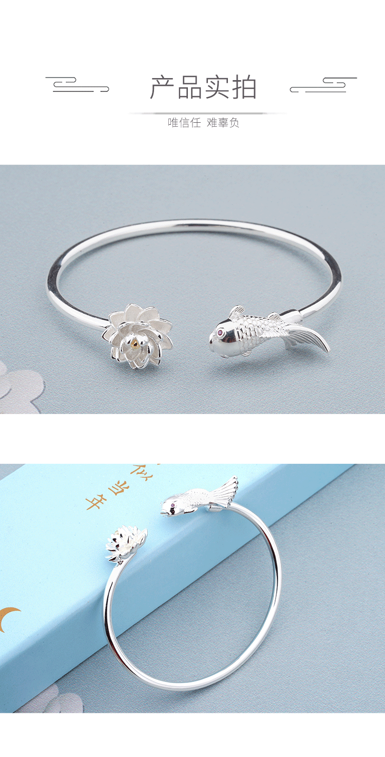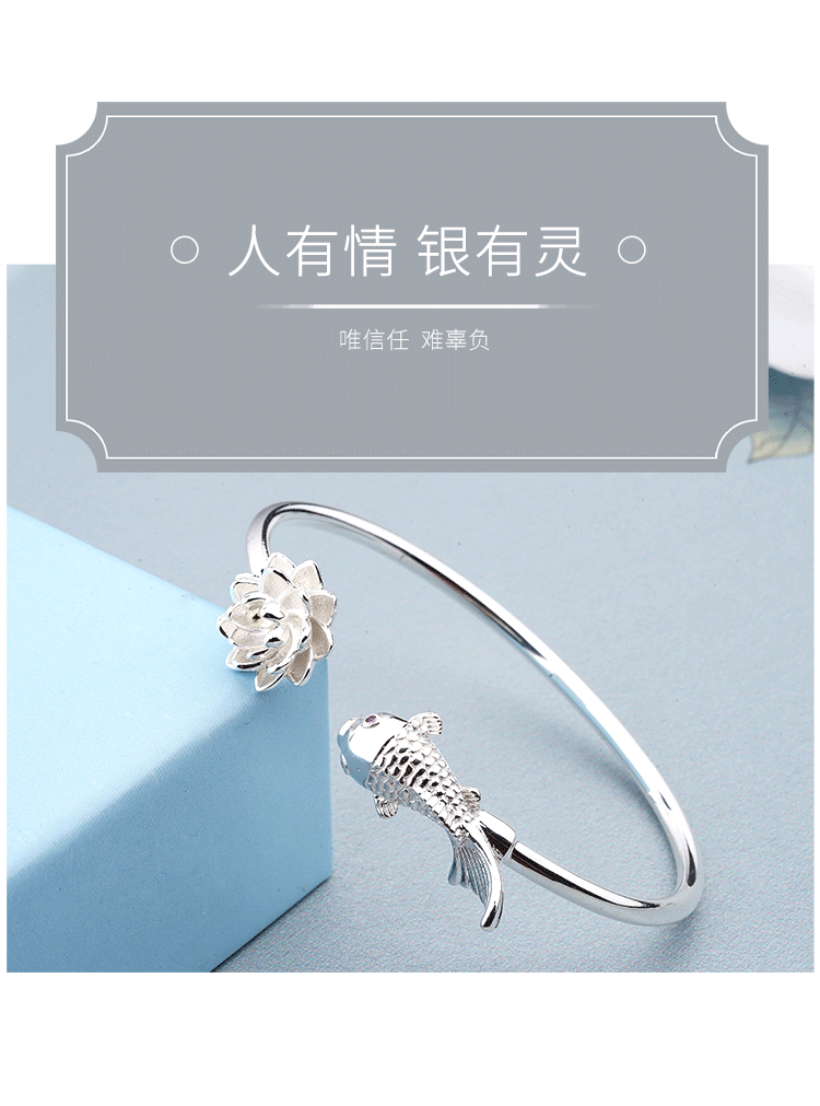 【寓意】:纯银手镯,精铸莲花鲤鱼元素,二者巧妙互动,栩栩如生,不仅在腕间形成流动光景,更寄托着生活华美的期许。