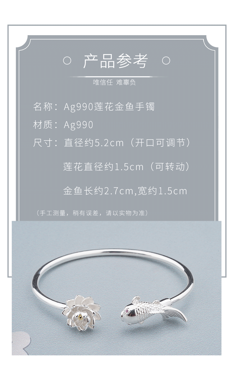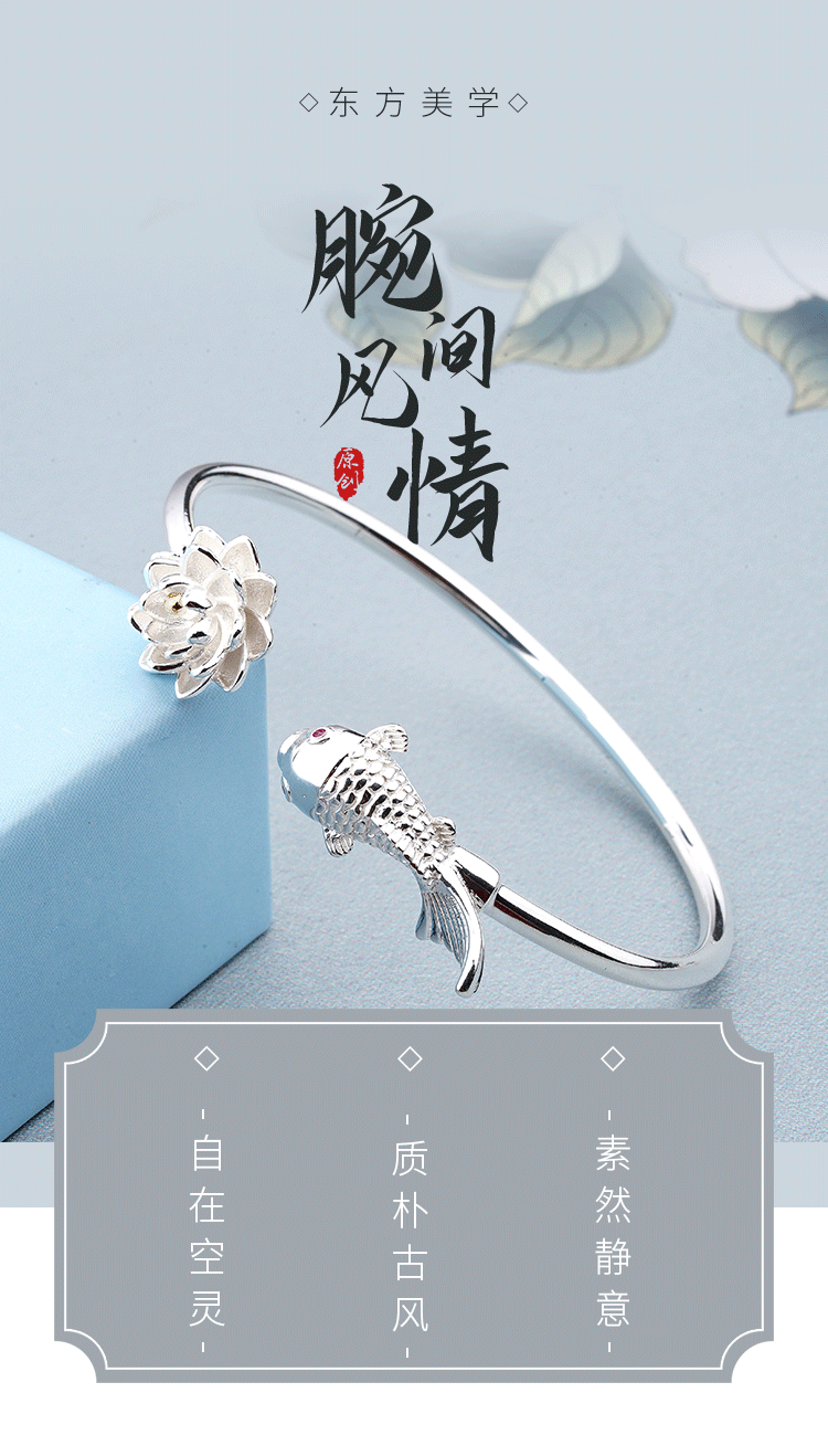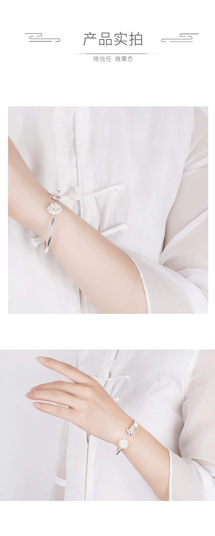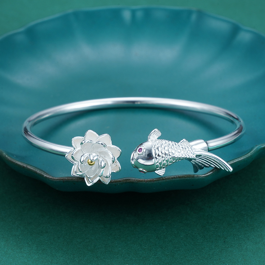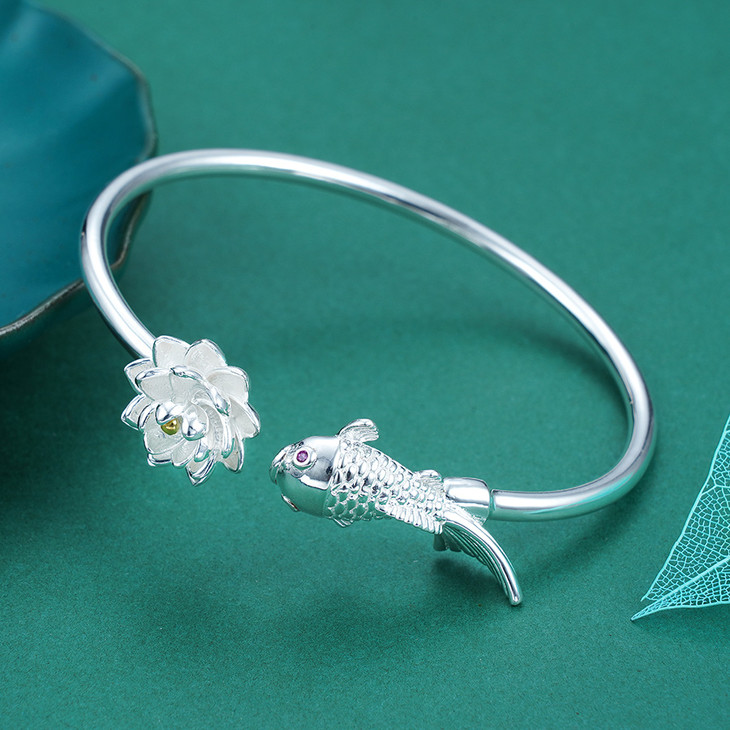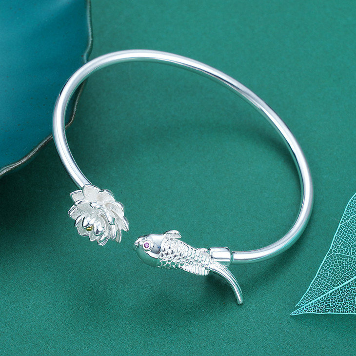 【寓意】:纯银手镯,精铸莲花鲤鱼元素,二者巧妙互动,栩栩如生,不仅在腕间形成流动光景,更寄托着生活华美的期许。