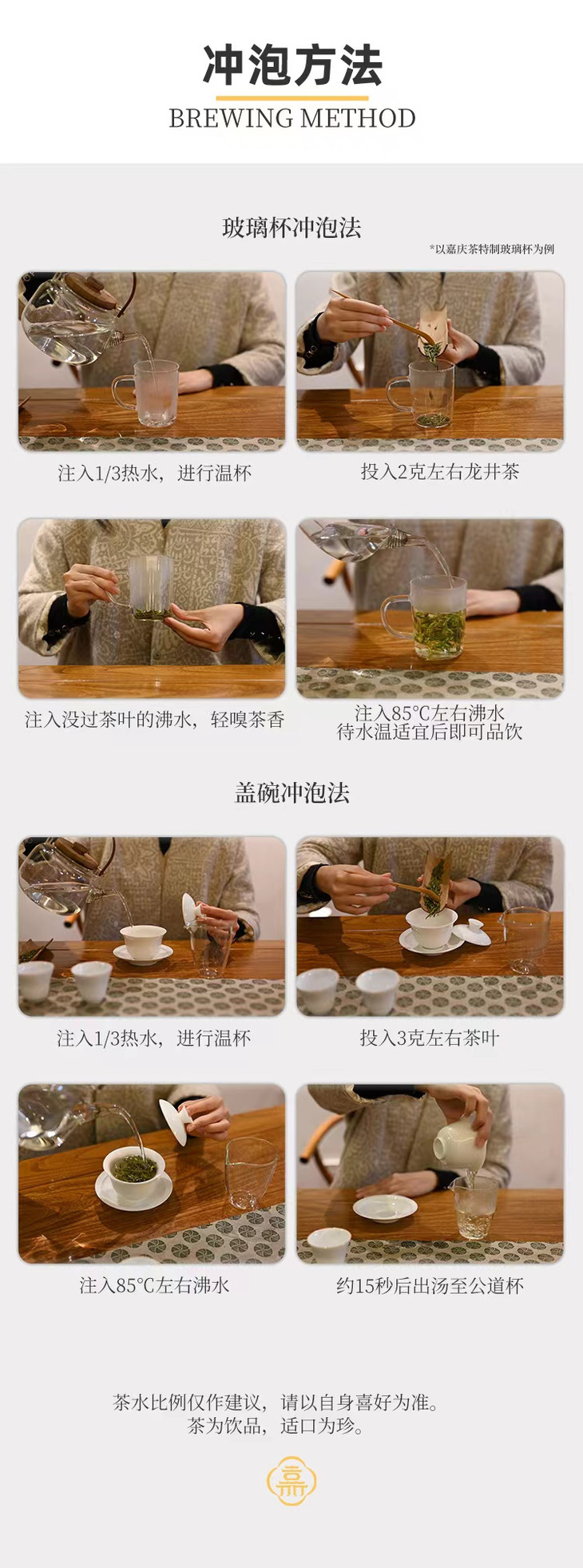 关于冲泡 观其干茶外形,扁平光滑挺直,色泽嫩绿光润。 在器皿中注入85℃-90℃的水,茶香气馥郁如兰,品其滋味细腻鲜活。过喉之后口中嫩栗香、豆香弥久不散,回味甘冽温柔,这正是杭州/西湖/狮峰龙井独到的魅力。