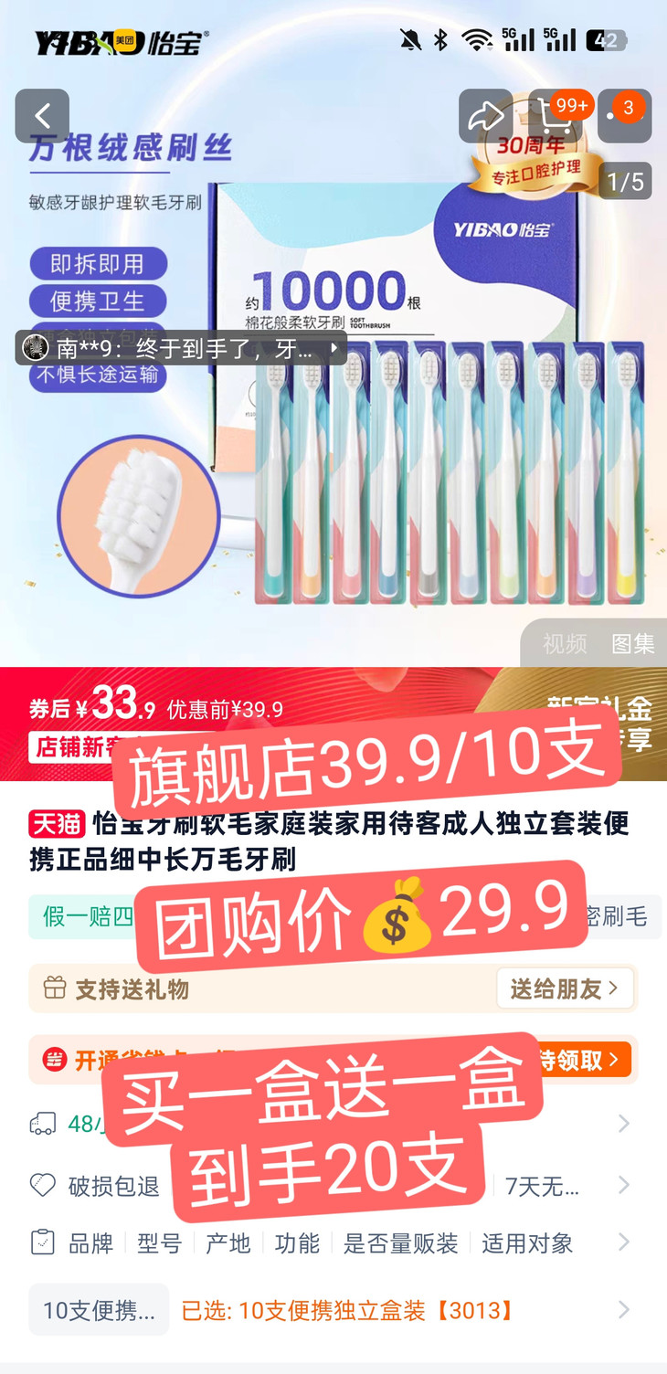 🌈【YIBAO怡宝万根绒感牙刷】买1盒送1盒到手20支💰29.9,💖世界冠军力荐❗专为牙齿抗敏研发,💗胖东来&永辉在售品牌,品牌直发!