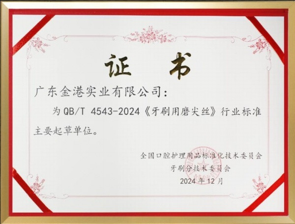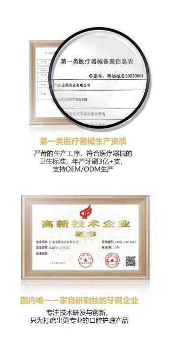 为了确保每一支万毛牙刷都品质上乘 金港实业组建了一支由高素质管理人才 和专业技术骨干构成的精英团队 从原材料采购到生产加工,再到成品出厂 每一个环节都严格遵循国际 ISO 质量体系标准进行管理和检测 先后斩获 “中国好品牌”“中国牙刷十大好品牌”“中国饭店业优秀品牌供应商” 等诸多荣誉 🔻ISO9001 质量认证 🔻ISO45001 职业健康安全管理体系认证 🔻ISO14001 环境管理体系认证证书 🔻SGS 认证证书,高新技术企业证书 🔻以及化妆品生产许可证 同时也是国内唯一一家自研刷丝的牙刷企业 在牙刷及口腔护理产品领域极具权威性 是多项行业及国家标准的重要起草单位之一