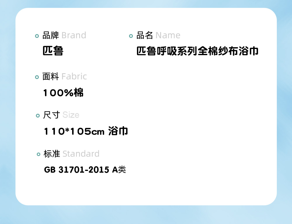 匹鲁呼吸系列全棉纱布单浴巾110*105cm