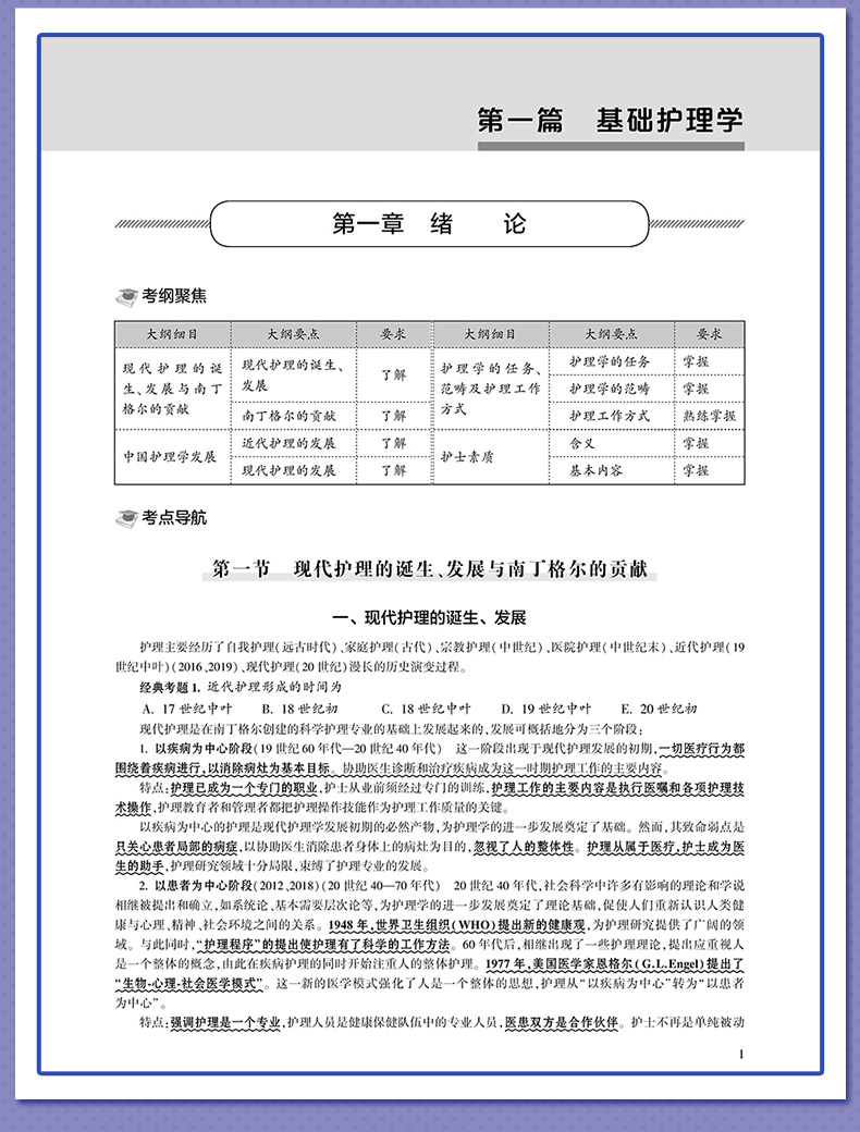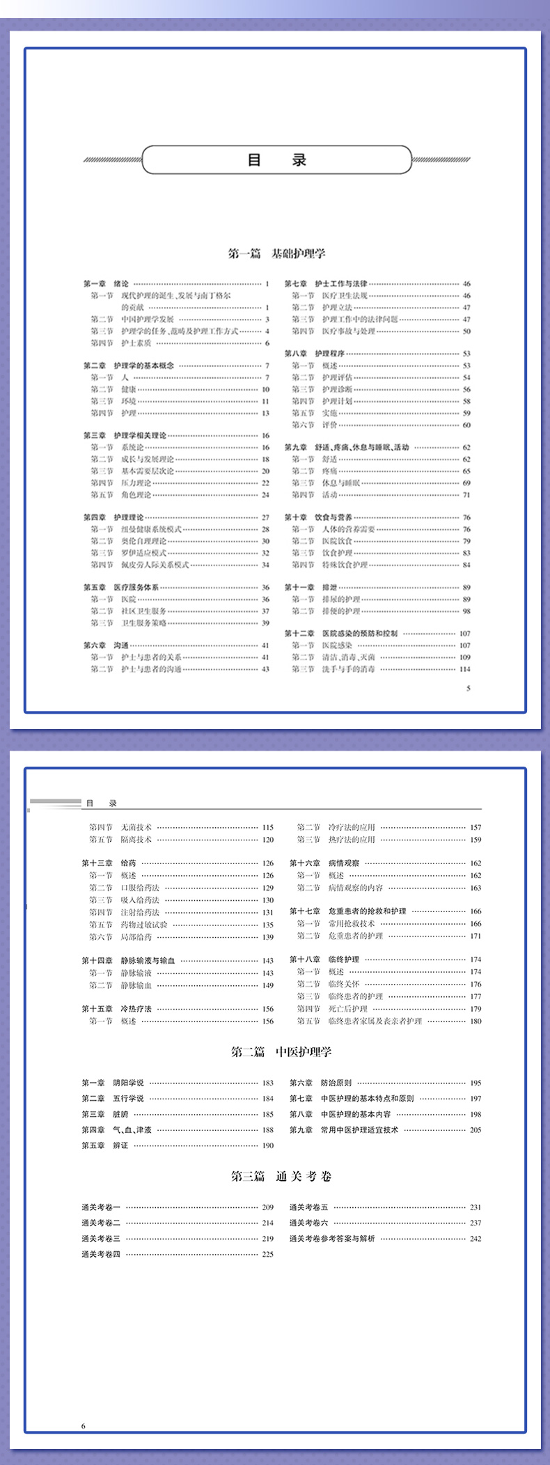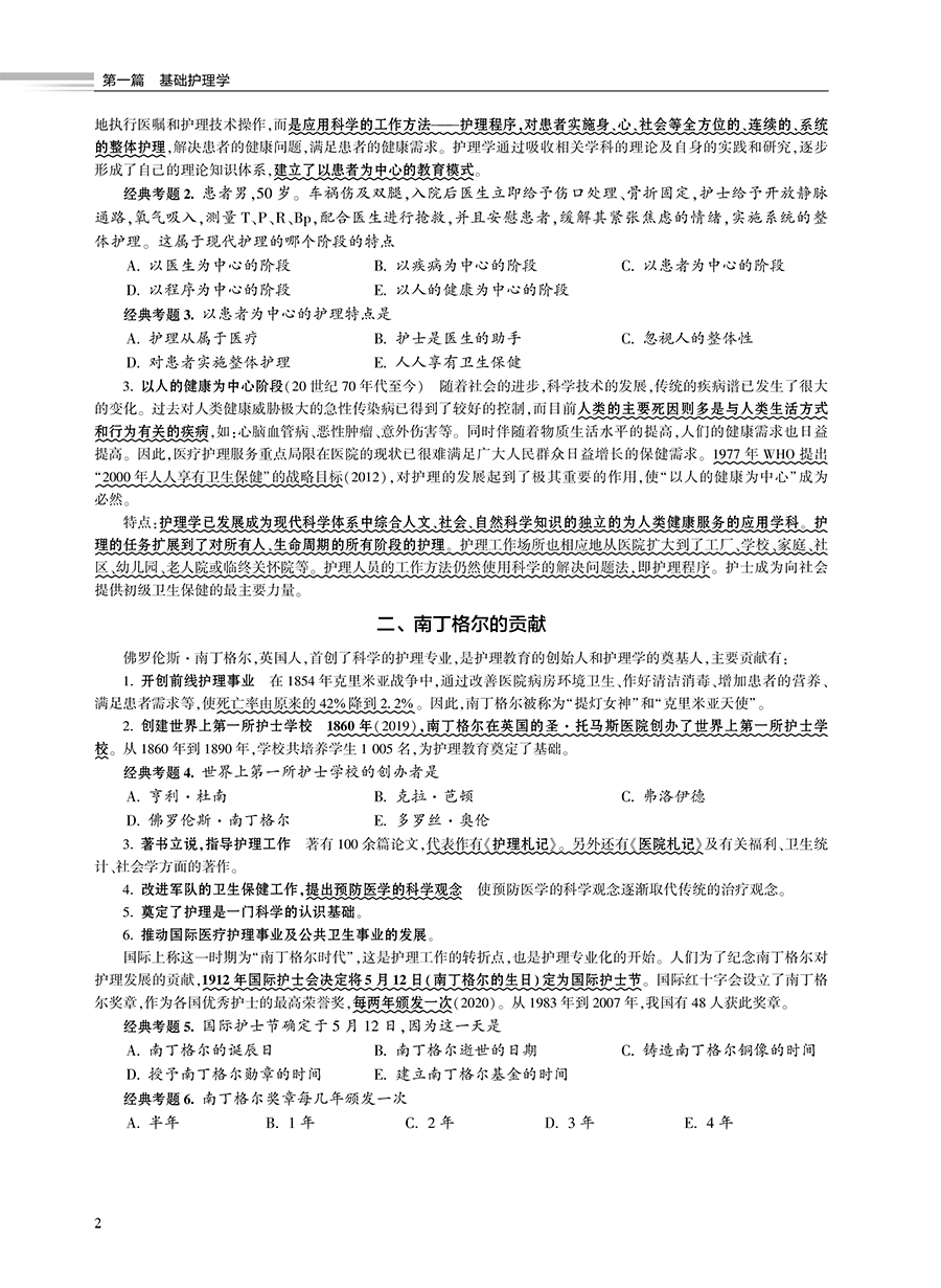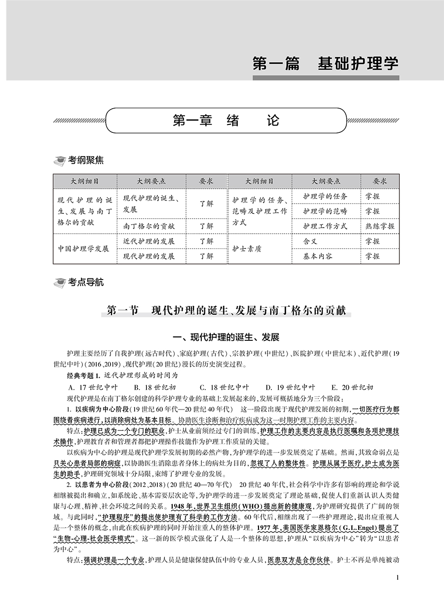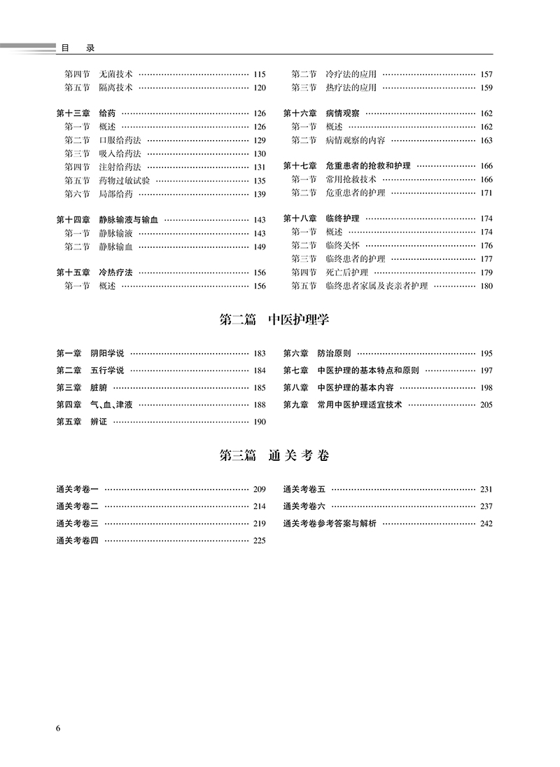第一篇 基础护理学 第一章 绪论 / 1 第一节 现代护理的诞生、发展与南丁格尔的贡献 / 1 第二节 中国护理学发展 / 3 第三节 护理学的任务、范畴及护理工作方式/ 4 第四节 护士素质 / 6 第二章 护理学的基本概念 / 7 第一节 人 / 7 第二节 健康/ 10 第三节 环境/ 11 第四节 护理/ 13 第三章 护理学相关理论/ 16 第一节 系统论/ 16 第二节 成长与发展理论/ 18 第三节 基本需要层次论/ 20 第四节 压力理论/ 22 第五节 角色理论/ 24 第四章 护理理论/ 27 第一节 纽曼健康系统模式/ 28 第二节 奥伦自理理论/ 30 第三节 罗伊适应模式/ 32 第四节 佩皮劳人际关系模式/ 34 第五章 医疗服务体系/ 36 第一节 医院/ 36 第二节 社区卫生服务/ 37 第三节 卫生服务策略/ 39 第六章 沟通/ 41 第一节 护士与患者的关系/ 41 第二节 护士与患者的沟通/ 43 第七章 护士工作与法律/ 46 第一节 医疗卫生法规/ 46 第二节 护理立法/ 47 第三节 护理工作中的法律问题/ 47 第四节 医疗事故与处理/ 50 第八章 护理程序/ 53 第一节 概述/ 53 第二节 护理评估/ 54 第三节 护理诊断/ 56 第四节 护理计划/ 58 第五节 实施/ 59 第六节 评价/ 60 第九章 舒适、疼痛、休息与睡眠、活动 / 62 第一节 舒适/ 62 第二节 疼痛/ 65 第三节 休息与睡眠/ 69 第四节 活动/ 71 第十章 饮食与营养/ 76 第一节 人体的营养需要/ 76 第二节 医院饮食/ 79 第三节 饮食护理/ 83 第四节 特殊饮食护理/ 84 第十一章 排泄/ 89 第一节 排尿的护理/ 89 第二节 排便的护理/ 98 第十二章 医院感染的预防和控制 / 107 第一节 医院感染 / 107 第二节 清洁、消毒、灭菌 / 109 第三节 洗手与手的消毒 / 114 第四节 无菌技术 / 115 第五节 隔离技术 / 120 第十三章 给药 / 126 第一节 概述 / 126 第二节 口服给药法 / 129 第三节 吸入给药法 / 130 第四节 注射给药法 / 131 第五节 药物过敏试验 / 135 第六节 局部给药 / 139 第十四章 静脉输液与输血 / 143 第一节 静脉输液 / 143 第二节 静脉输血 / 149 第十五章 冷热疗法 / 156 第一节 概述 / 156 第二节 冷疗法的应用 / 157 第三节 热疗法的应用 / 159 第十六章 病情观察 / 162 第一节 概述 / 162 第二节 病情观察的内容 / 163 第十七章 危重患者的抢救和护理 / 166 第一节 常用抢救技术 / 166 第二节 危重患者的护理 / 171 第十八章 临终护理 / 174 第一节 概述 / 174 第二节 临终关怀 / 176 第三节 临终患者的护理 / 177 第四节 死亡后护理 / 179 第五节 临终患者家属及丧亲者护理 / 180 第二篇 中医护理学 第一章 阴阳学说 / 183 第二章 五行学说 / 184 第三章 脏腑 / 185 第四章 气、血、津液 / 188 第五章 辨证 / 190 第六章 防治原则 / 195 第七章 中医护理的基本特点和原则 / 197 第八章 中医护理的基本内容 / 198 第九章 常用中医护理适宜技术 / 205 第三篇 通关考卷 通关考卷一 / 209 通关考卷二 / 214 通关考卷三 / 219 通关考卷四 / 225 通关考卷五 / 231 通关考卷六 / 237 通关考卷参考答案与解析 / 242