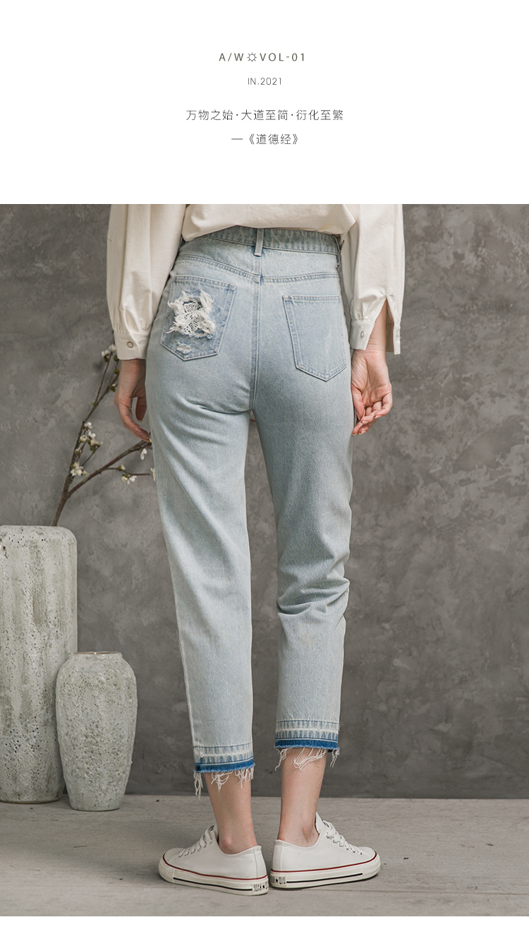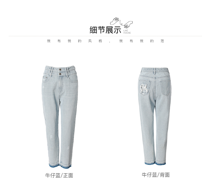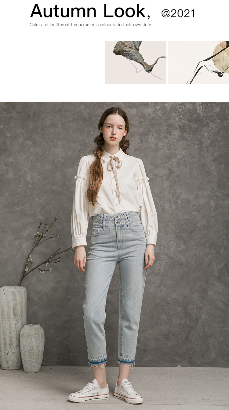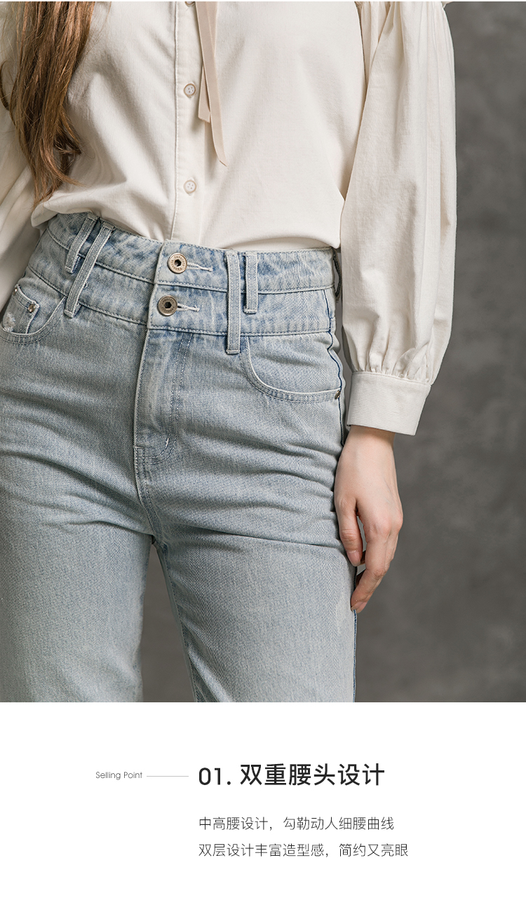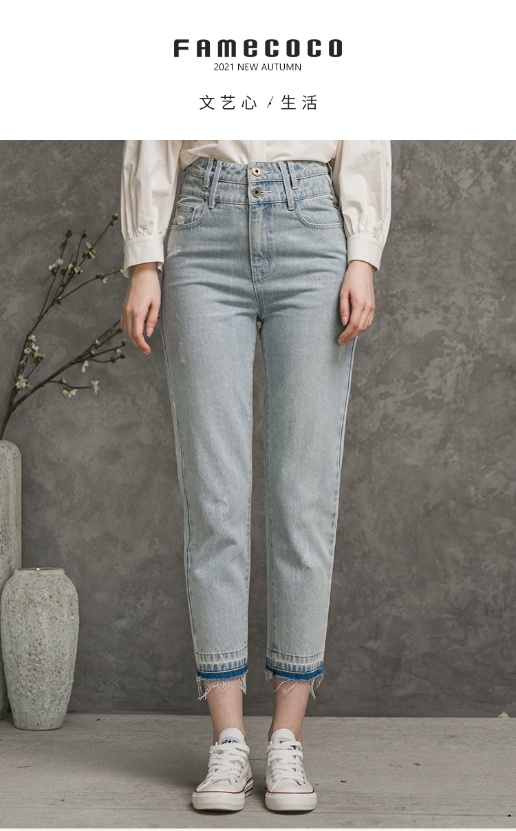 Famecoco范可儿全棉牛仔裤女秋浅色设计感裤子F216GA010