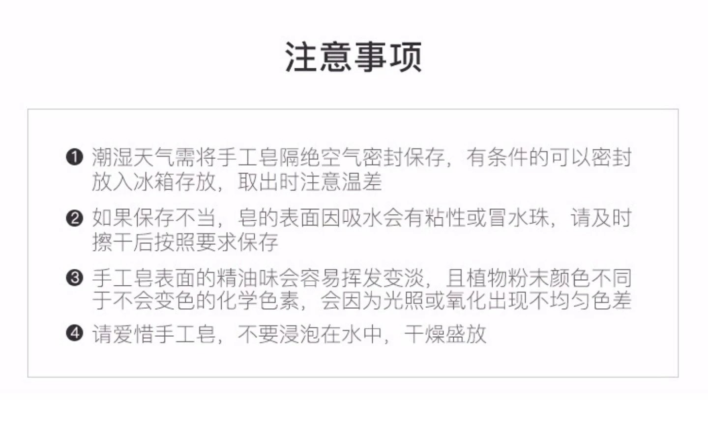 坚持纯手工天然冷制皂的方法,自然晾干四十天后成熟方可使用。