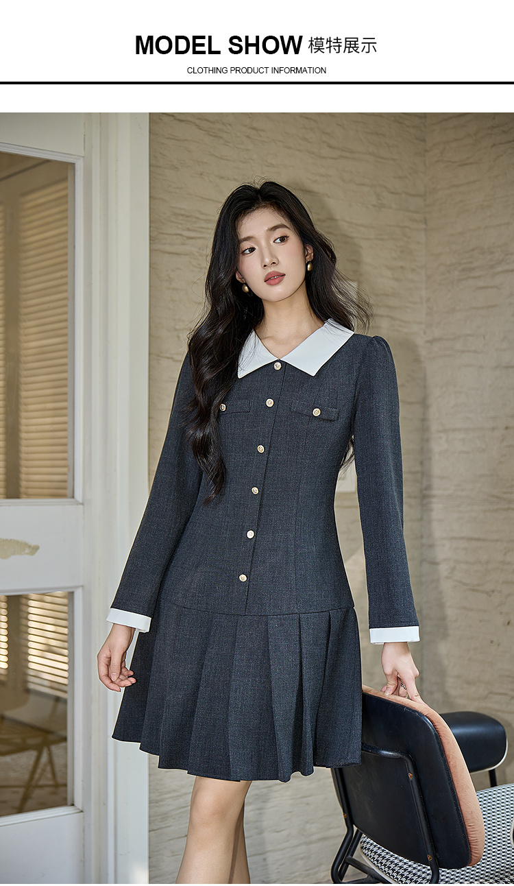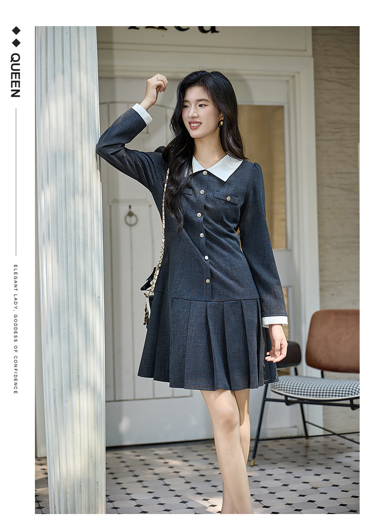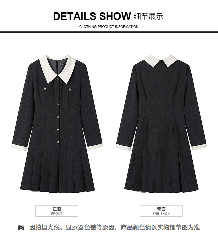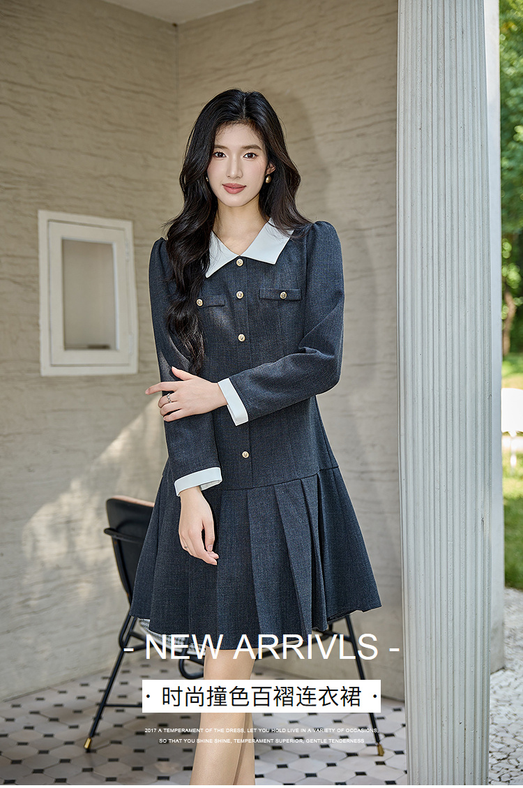 奢姿大码女装2025秋季胖妹妹时尚减龄撞色领金属扣百褶设计连衣裙9953894249