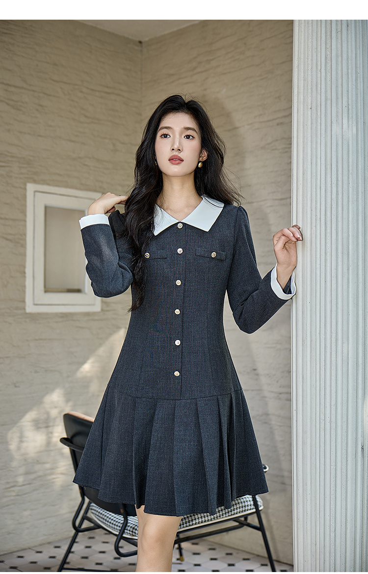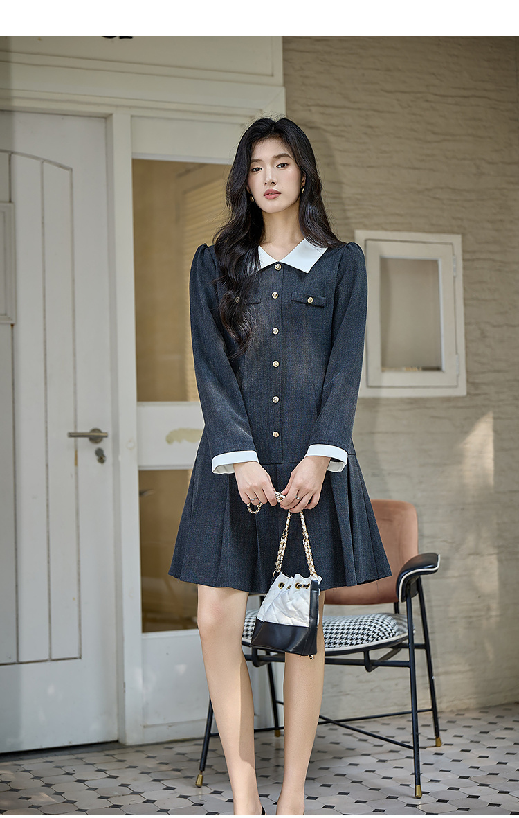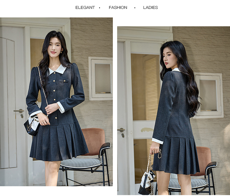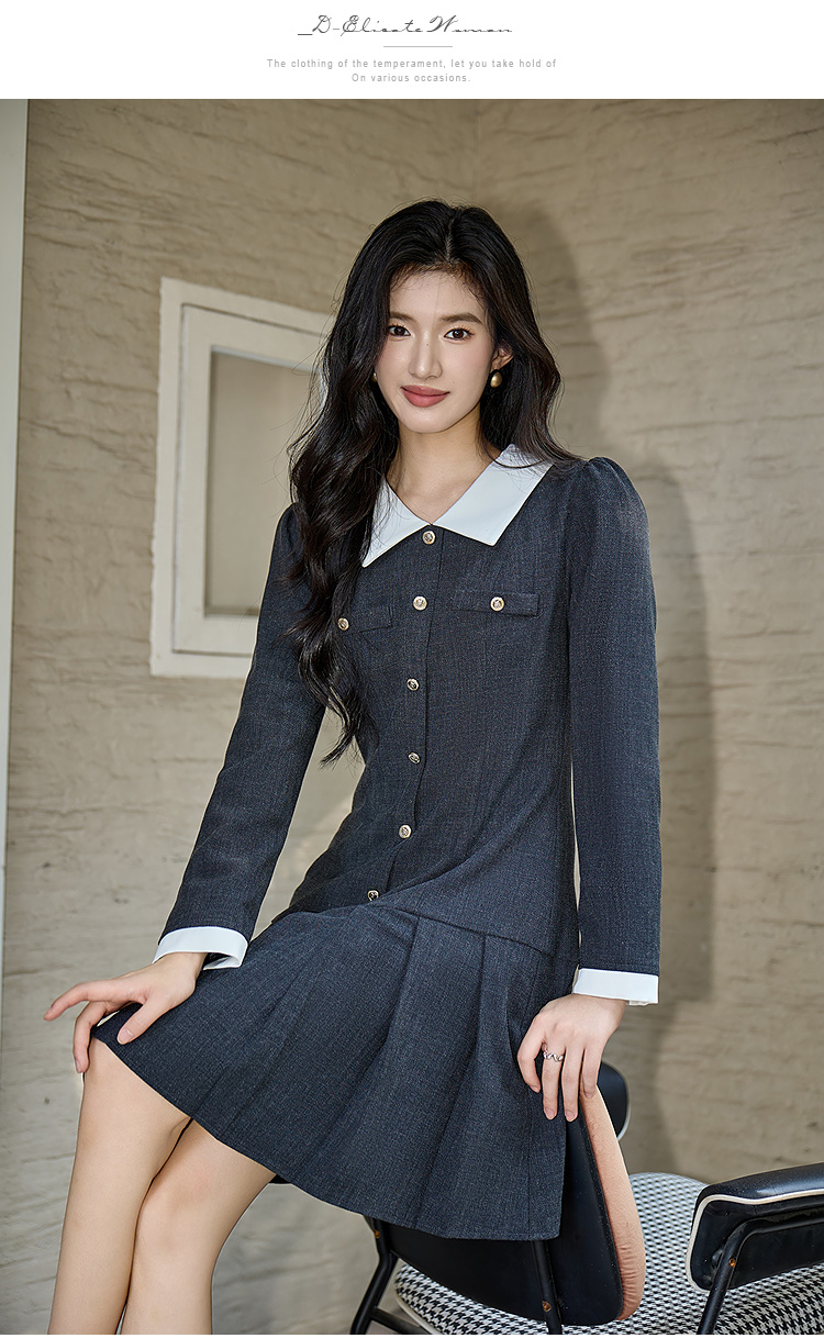 奢姿大码女装2025秋季胖妹妹时尚减龄撞色领金属扣百褶设计连衣裙9953894249