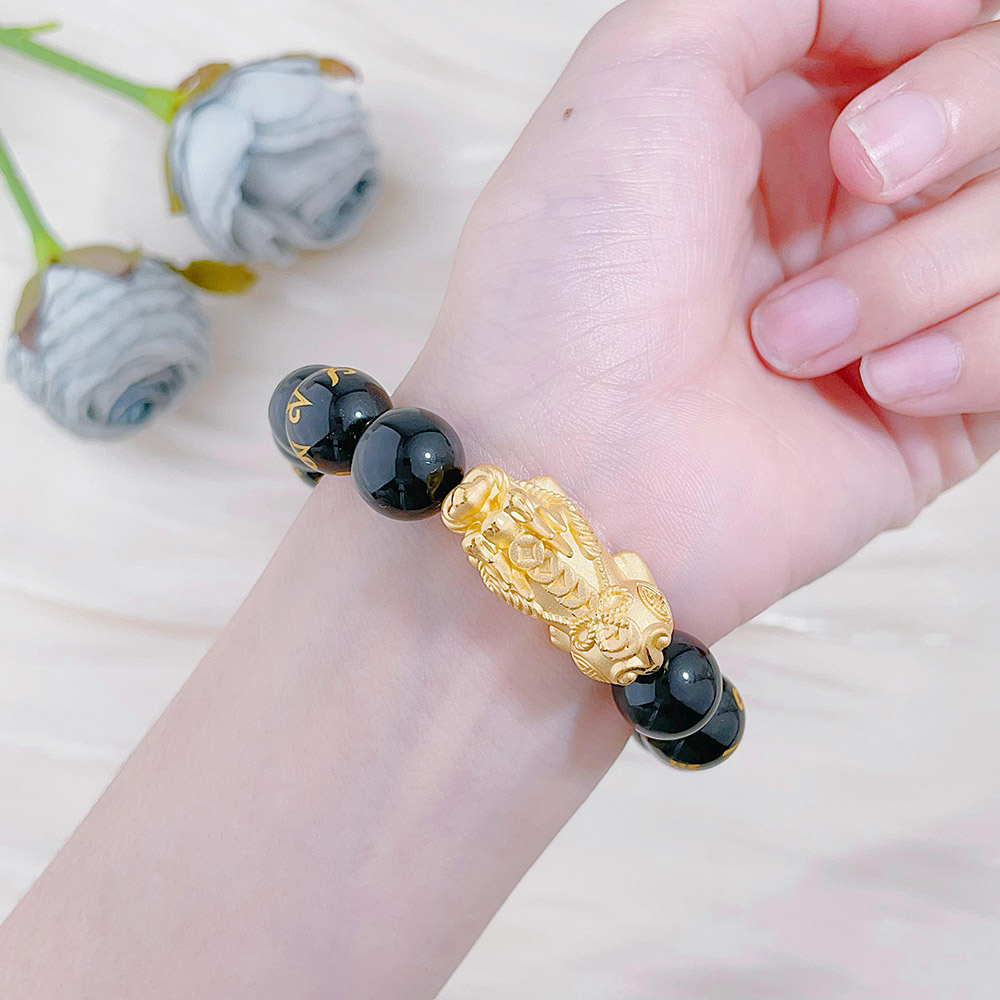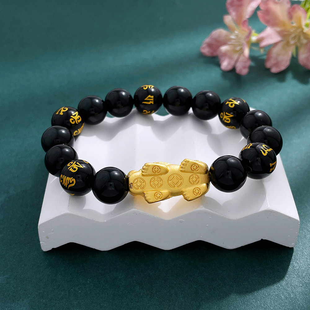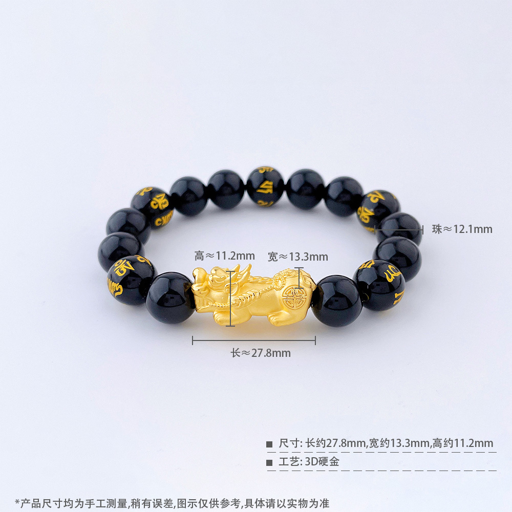 【限时克减150元】足金 #祈福 #招财进宝 3D硬金黑曜石圆珠手链铜钱图案招财貔貅六字真言圆珠间款弹力绳手串(RFXJB0174-12012.6)(预售产品下单后不退款不退货不换货不补差价)