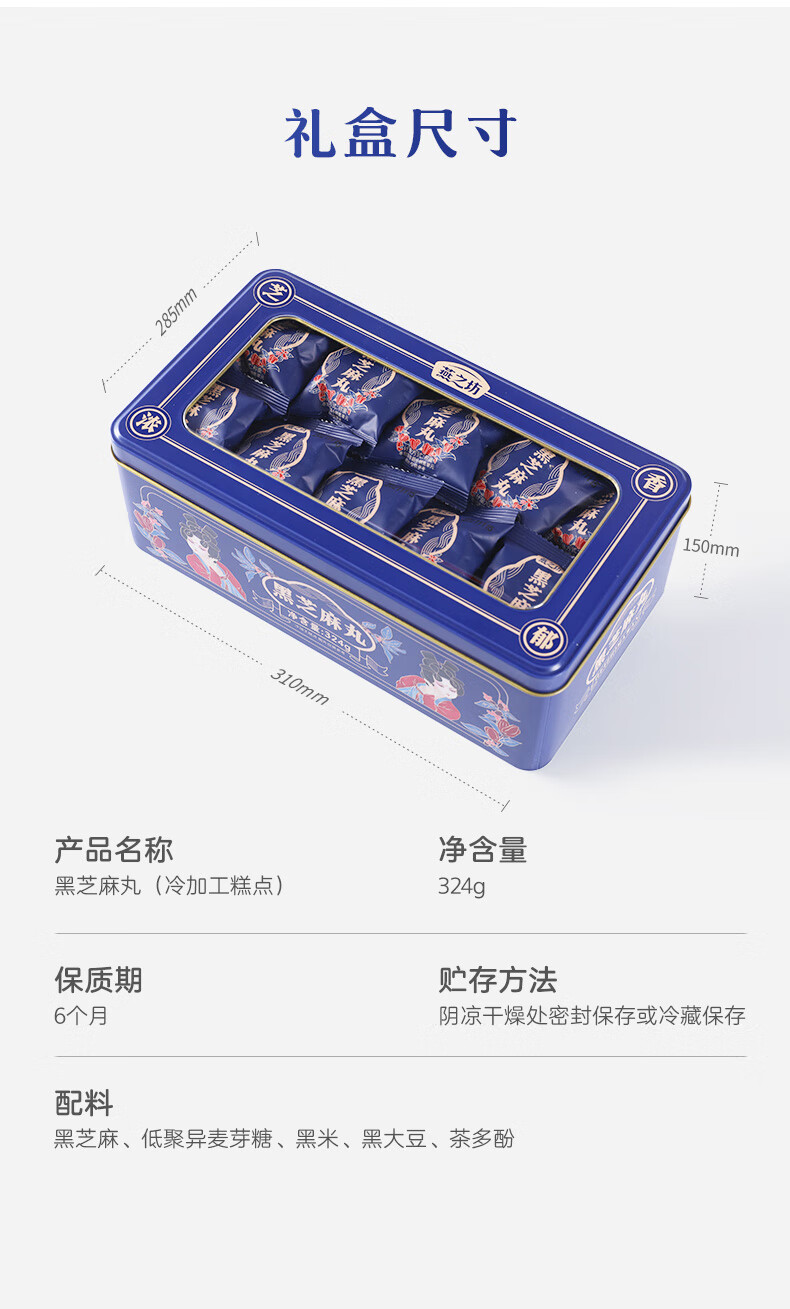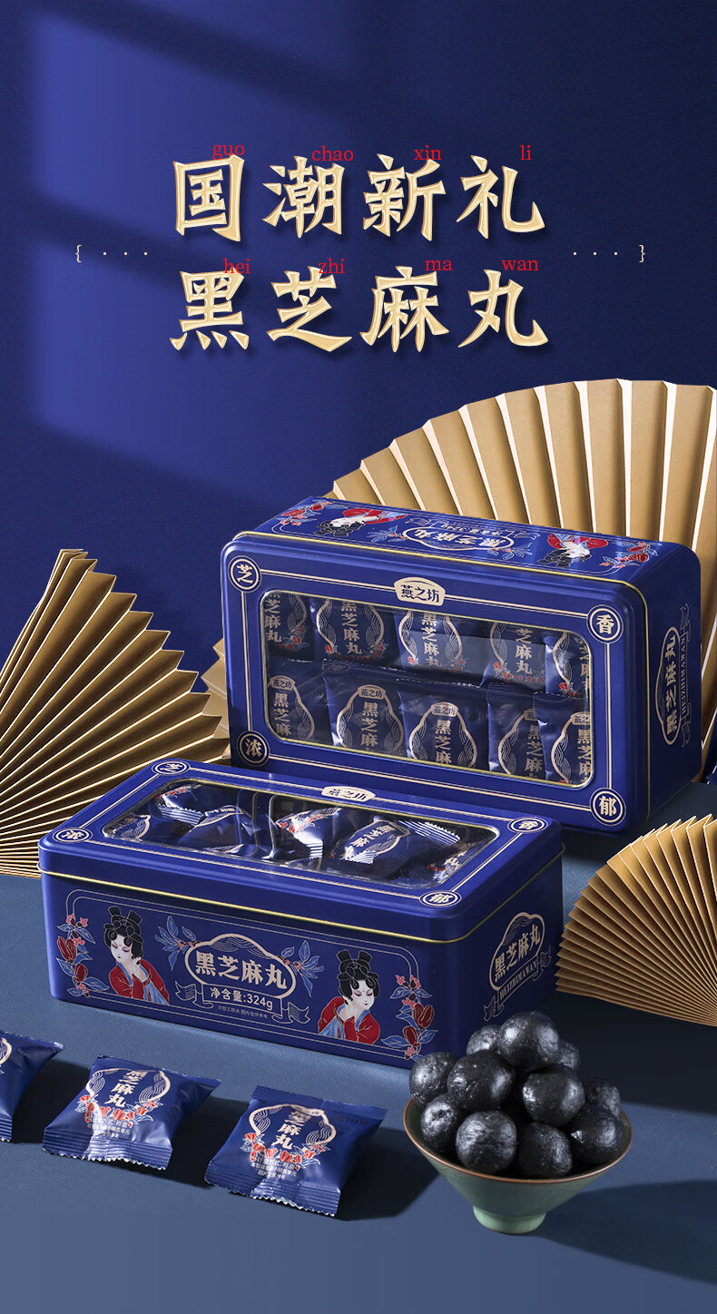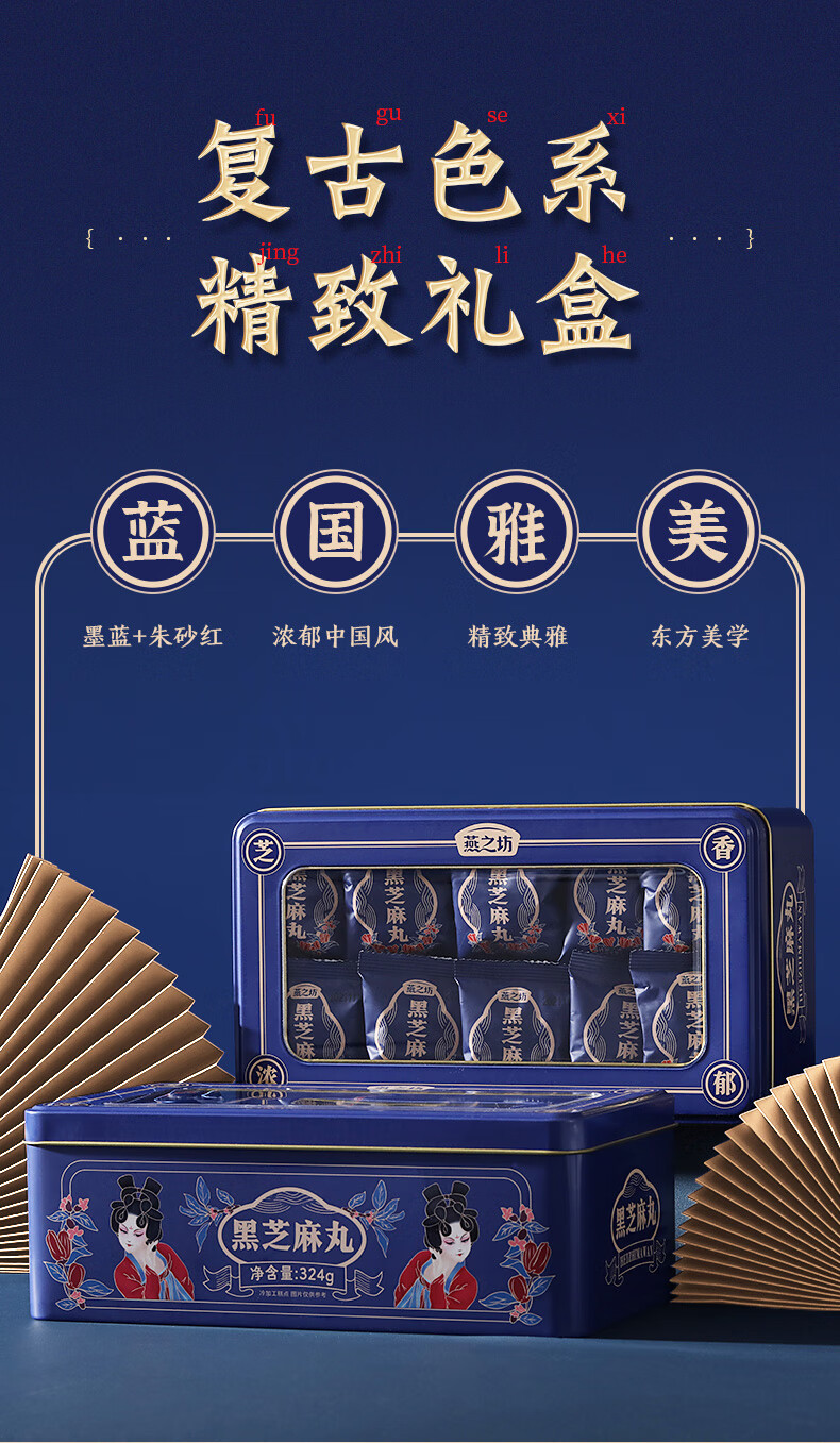 燕之坊黑芝麻丸糕点芝麻球休闲零食独立包装黑芝麻丸铁盒礼盒 324g