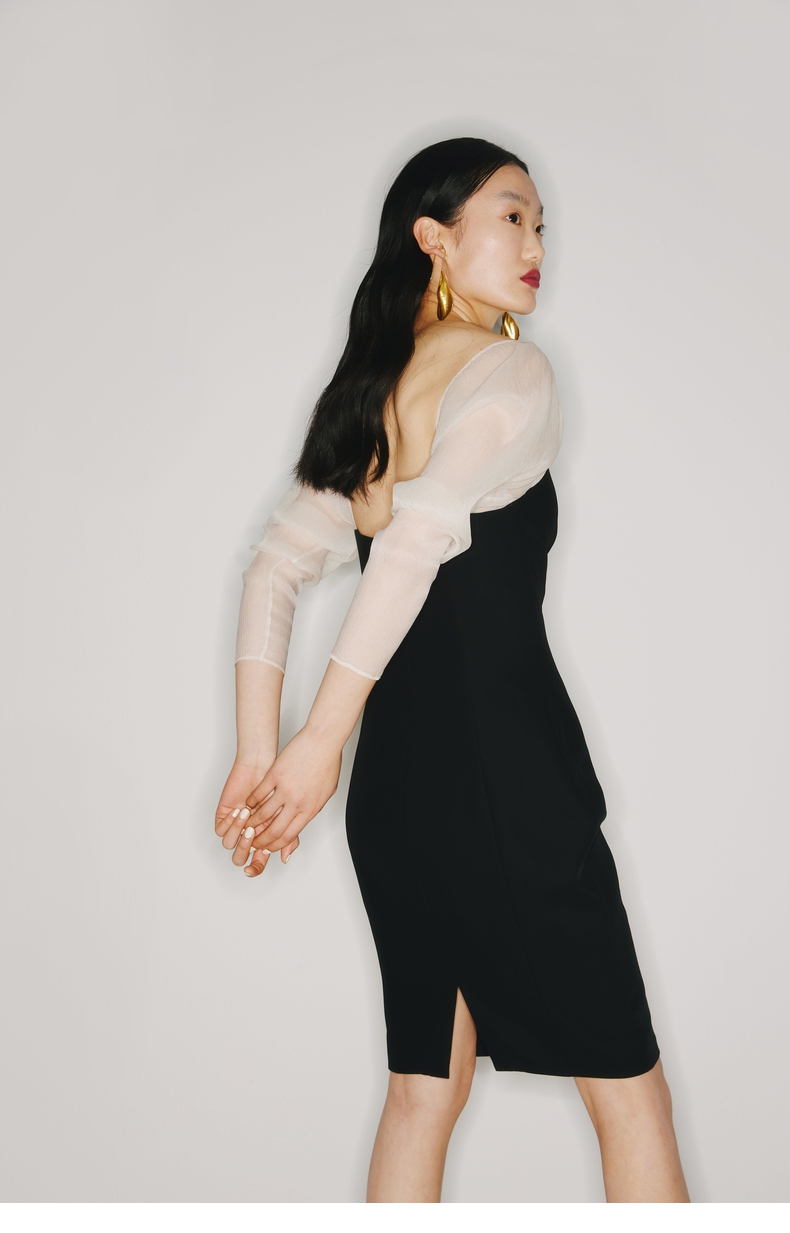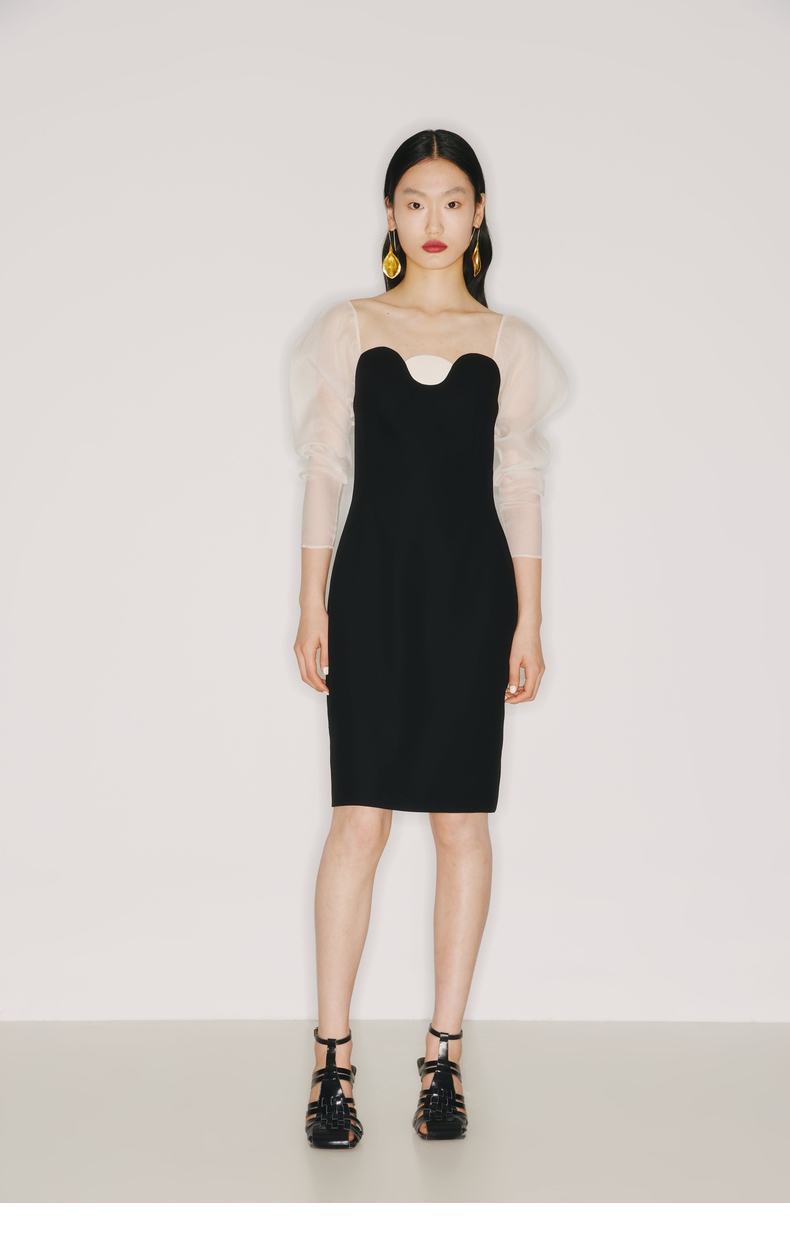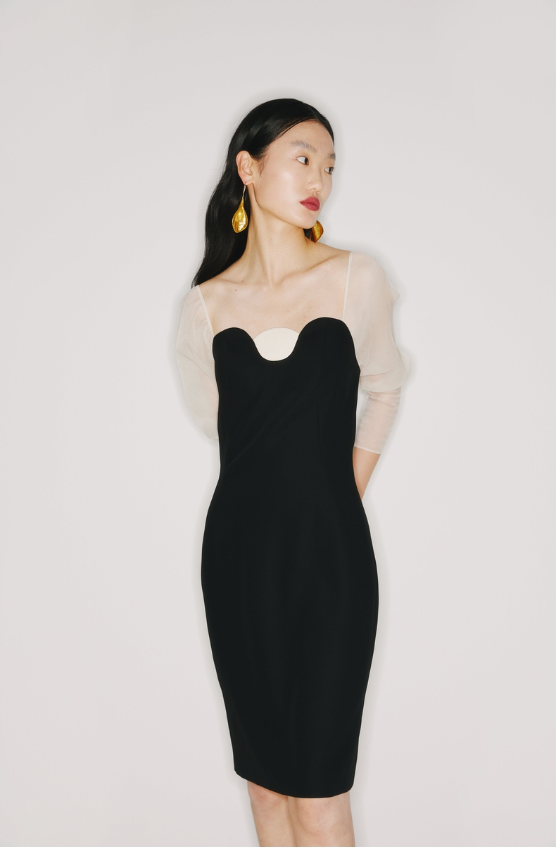 【日出海面】圆半初升领口设计象牙白薄纱拼接黑色修身连衣裙/22000025