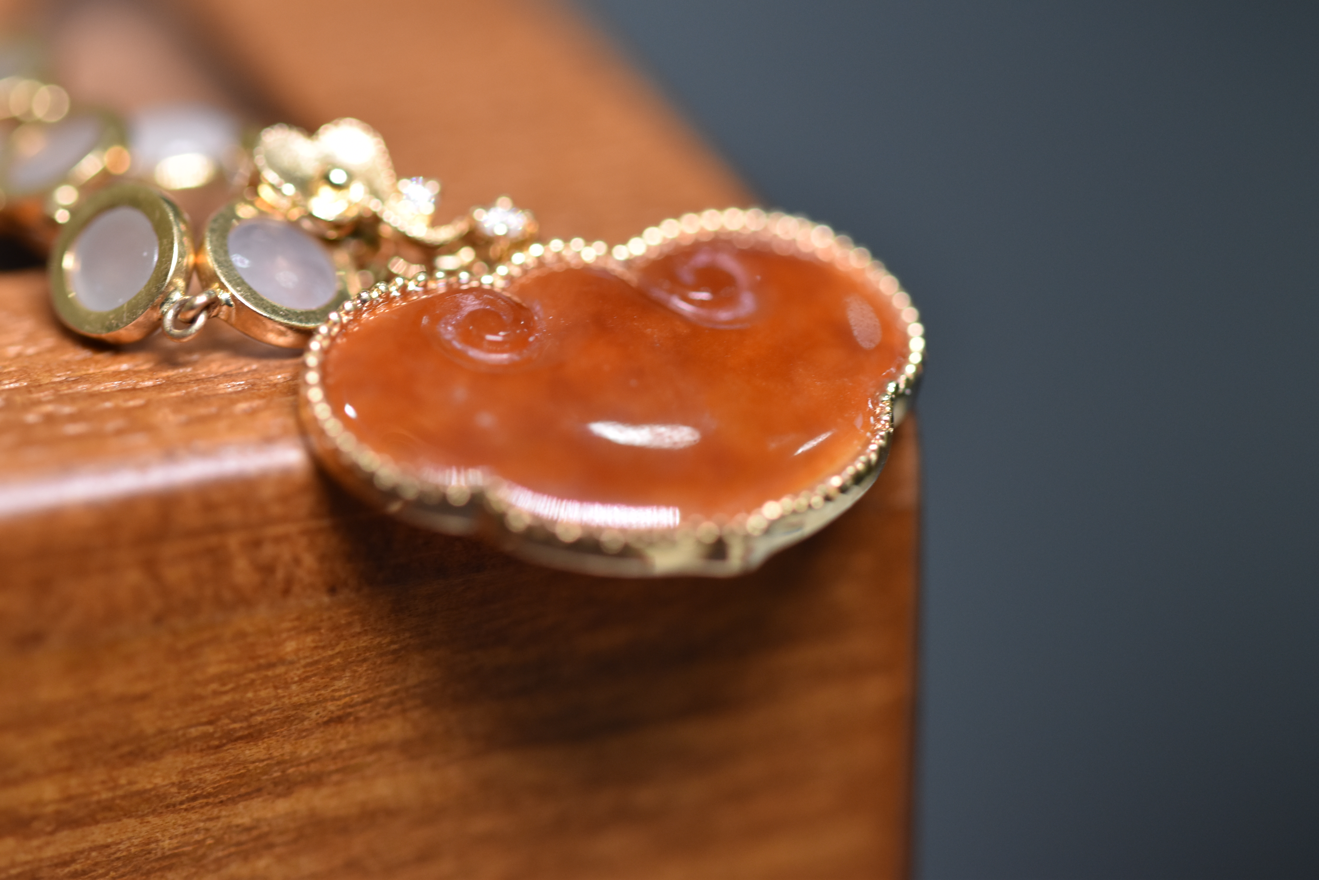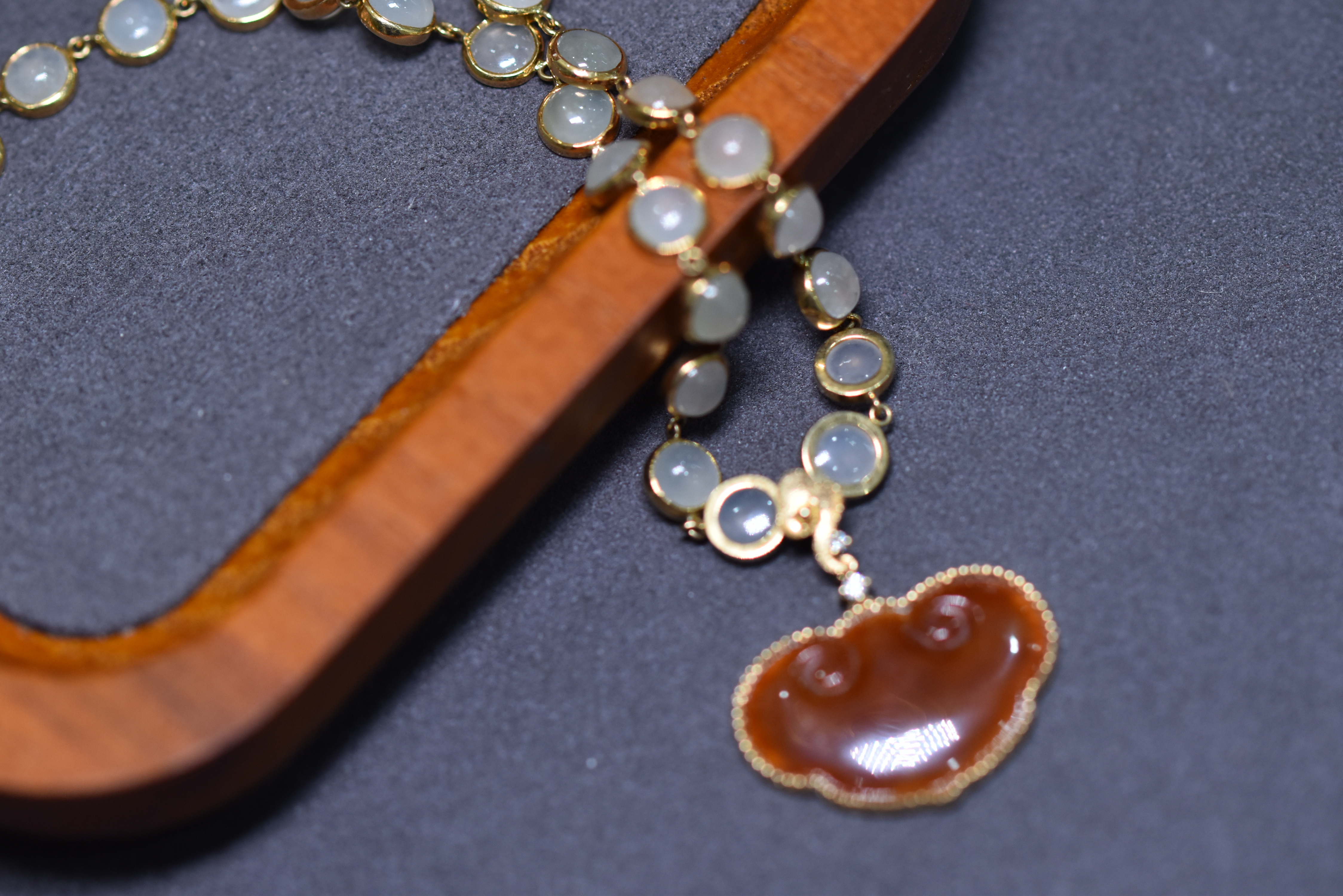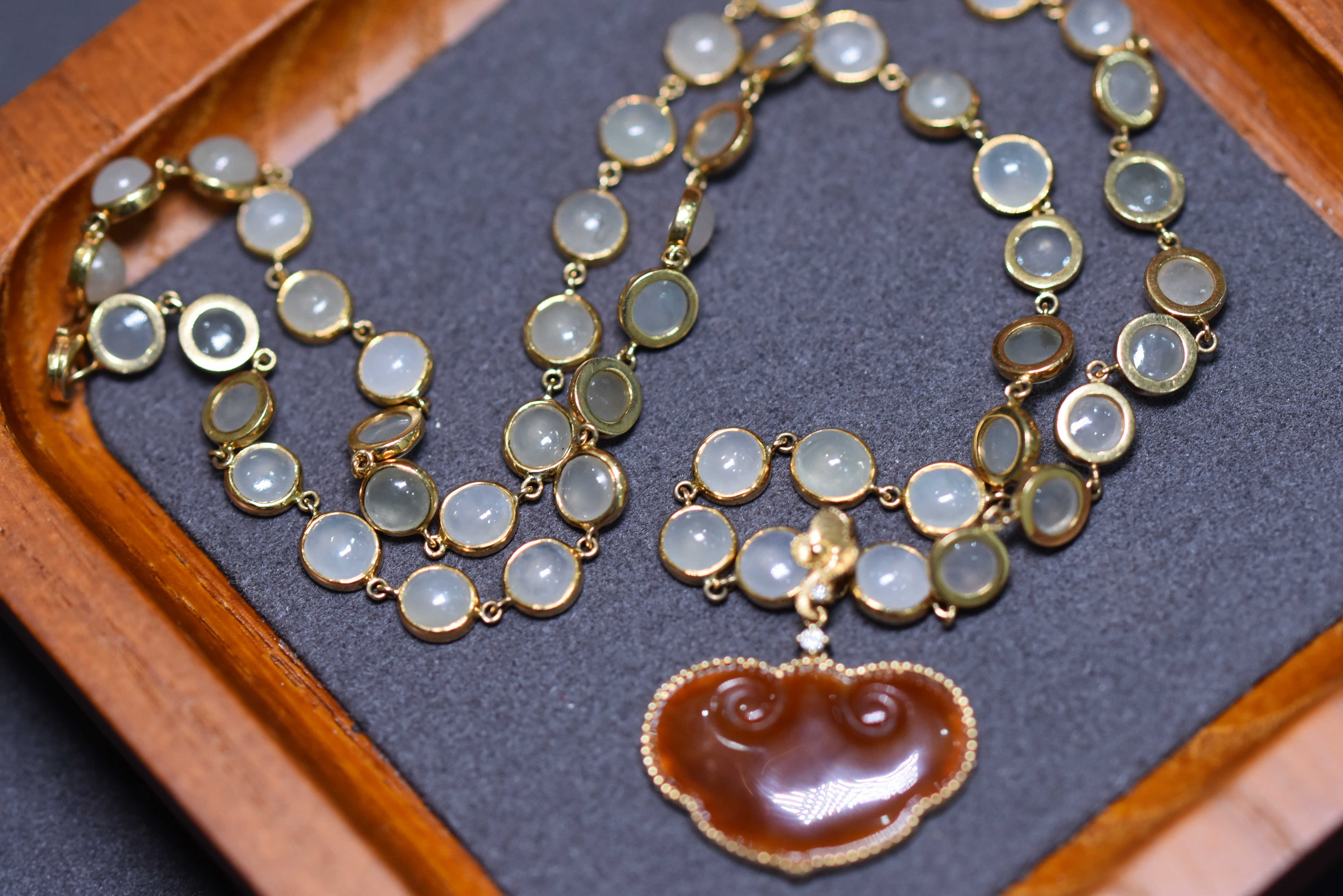 使用了50枚白翡翠圆蛋镶嵌18K黄金连缀而成,搭配红翡翠如意祥云吊坠,项链华丽唯美,如一个个连环彼此连接,连起如意与幸福。