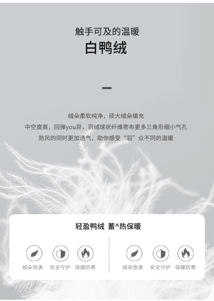 填充物:90%白鸭绒10%羽片(充绒量180g左右)