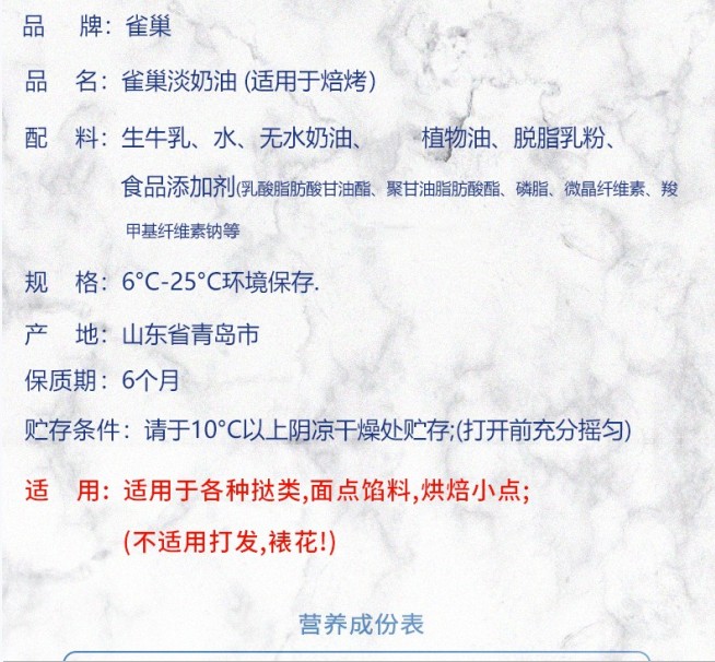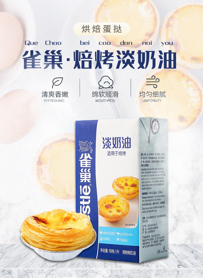 不能打发1L 雀巢【焙烤】淡奶油 蛋挞液布丁液原料 不能用于打发裱花