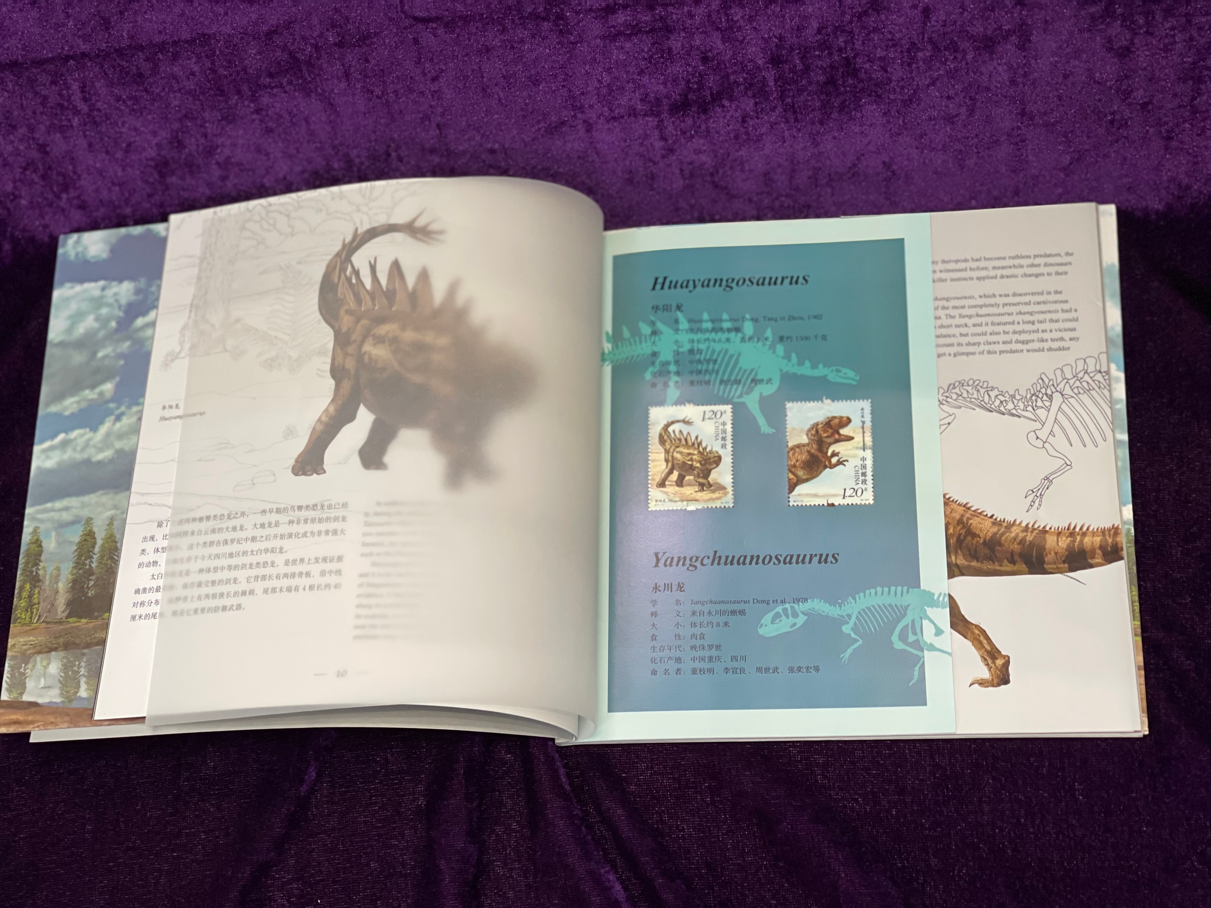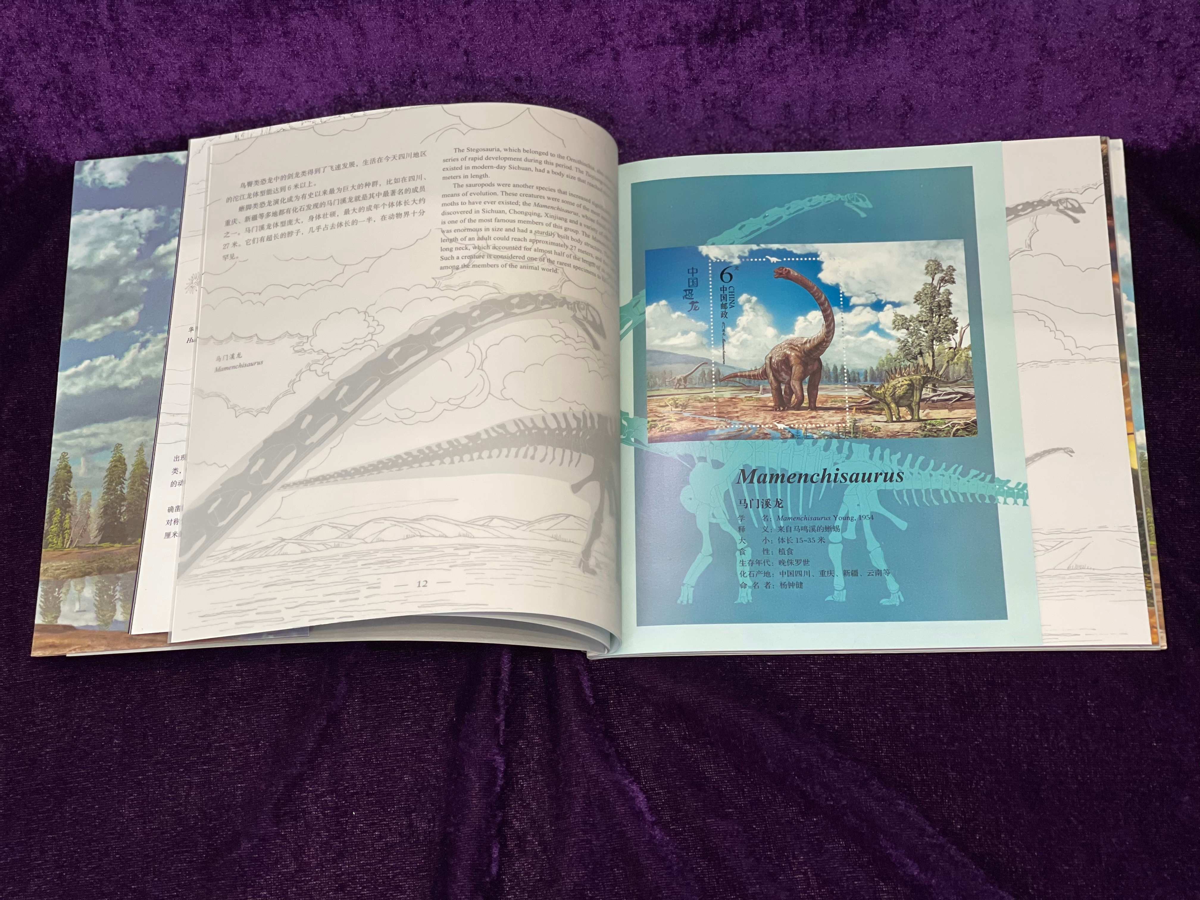 本票册包含三大篇章,分别为恐龙自然演化史、恐龙物种详细介绍以及中国恐龙研究历史。产品共有48页,介绍内容涉及16个省市的30余只恐龙,由赵闯、杨杨团队设计,内含《中国恐龙》套票、小型张。