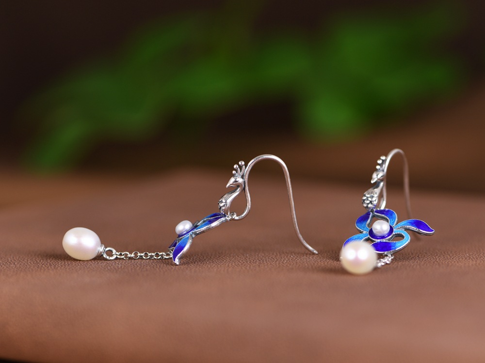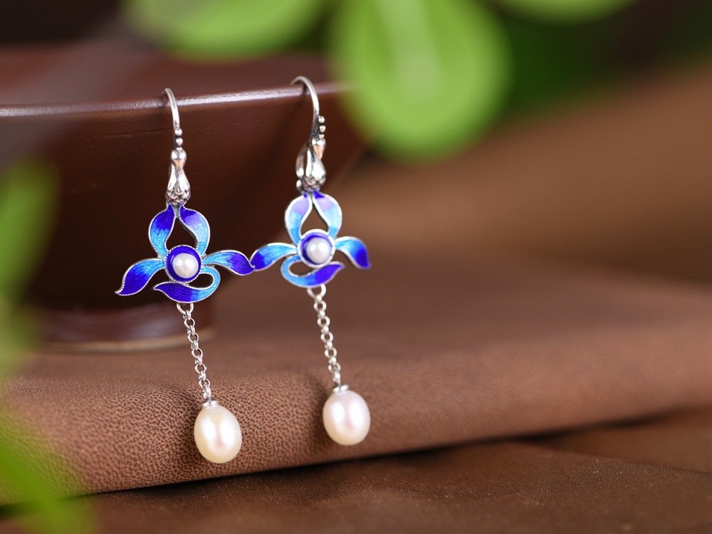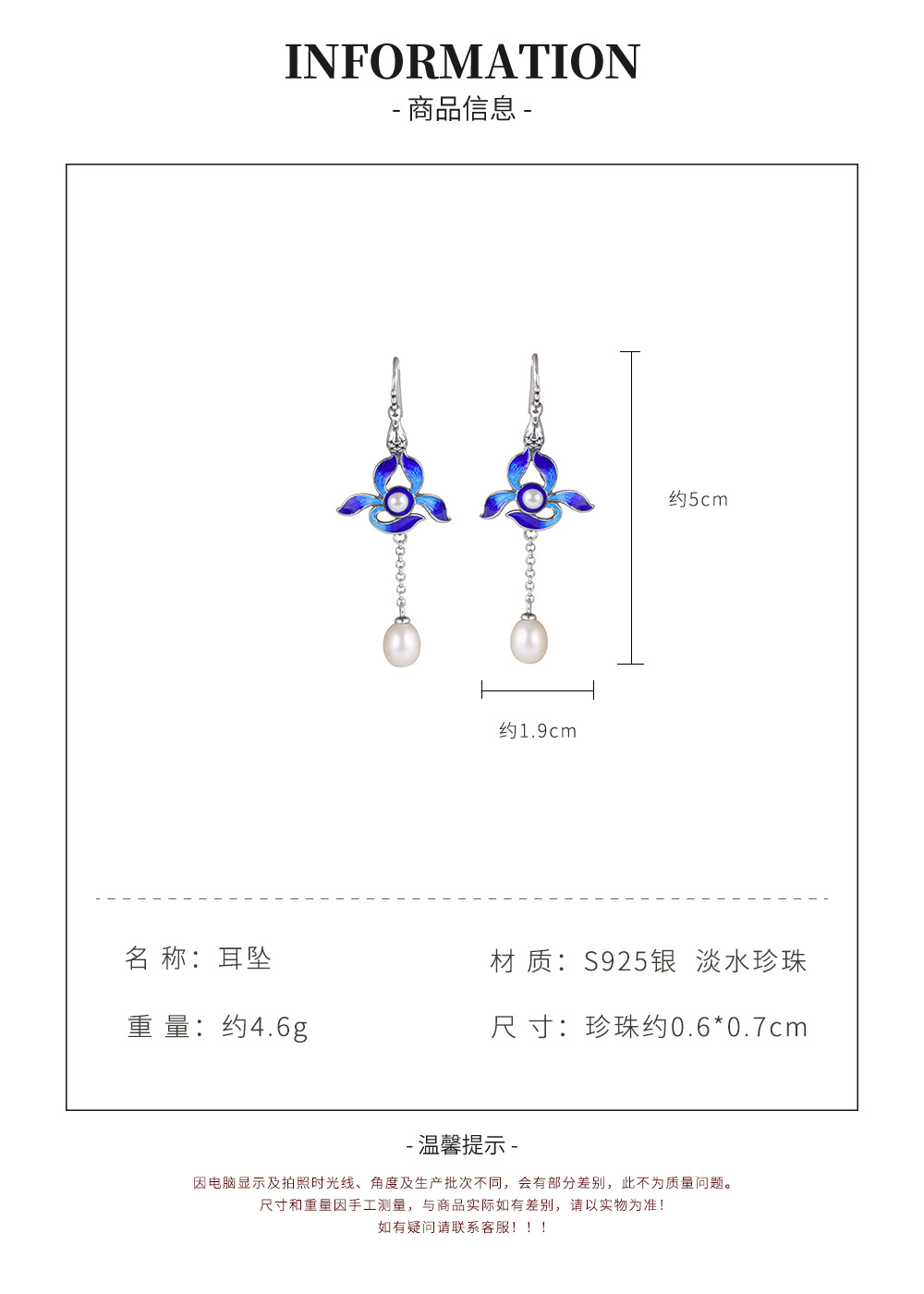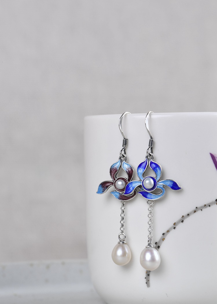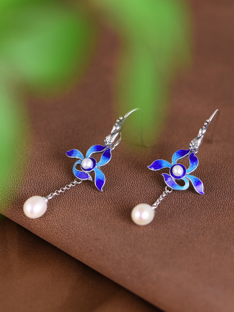 【寒霜莲粹】S925银复古银景泰蓝花镶嵌珍珠耳坠【SCH-TRS31525】