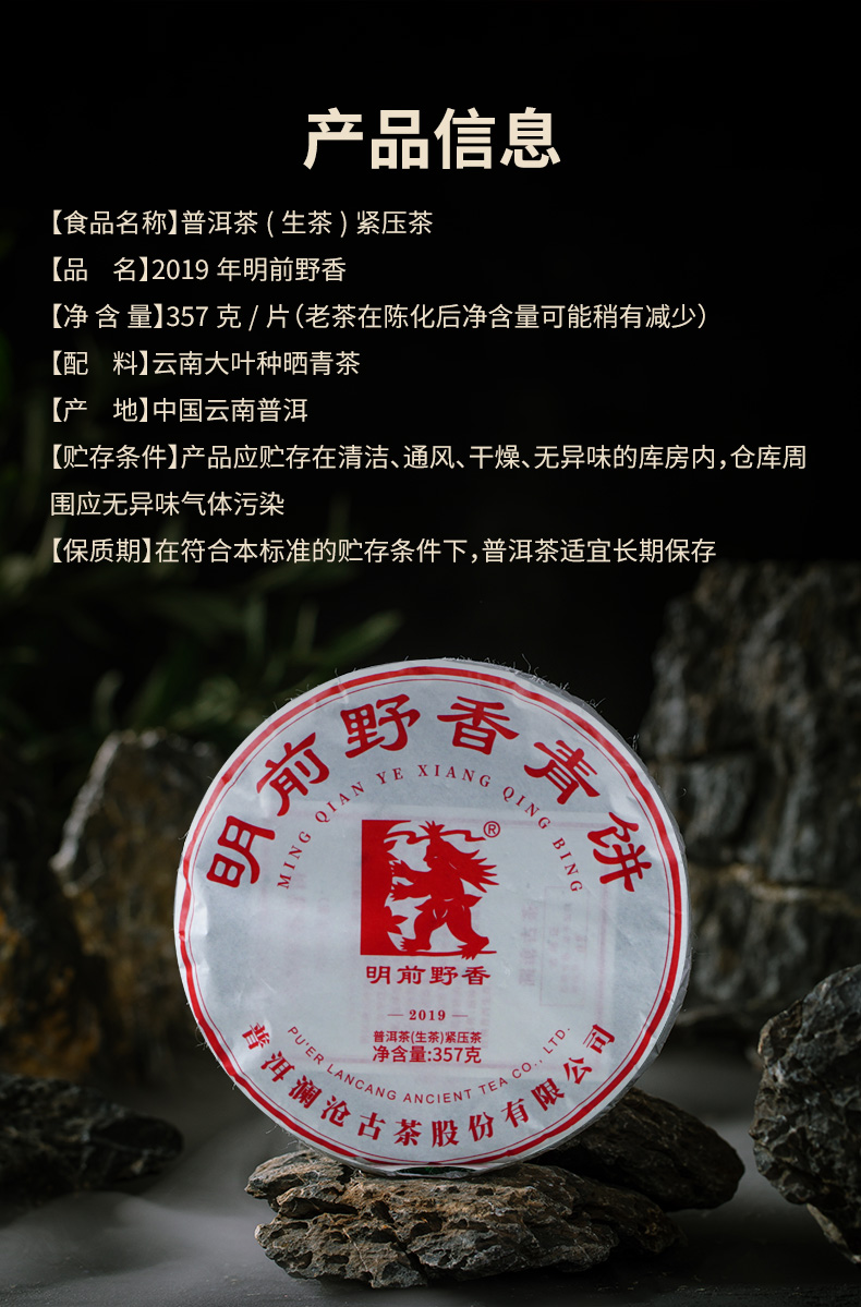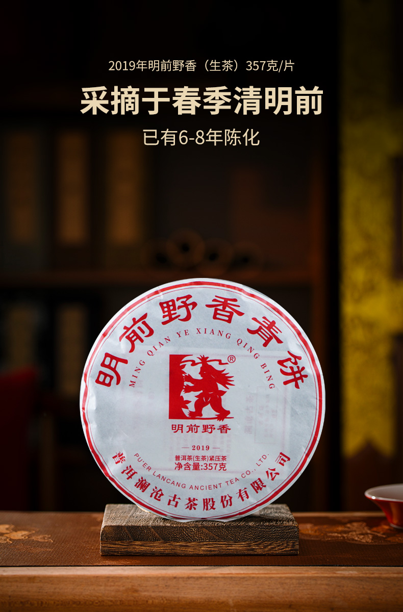 澜沧古茶2019年明前野香大饼普洱生茶七子茶饼357g