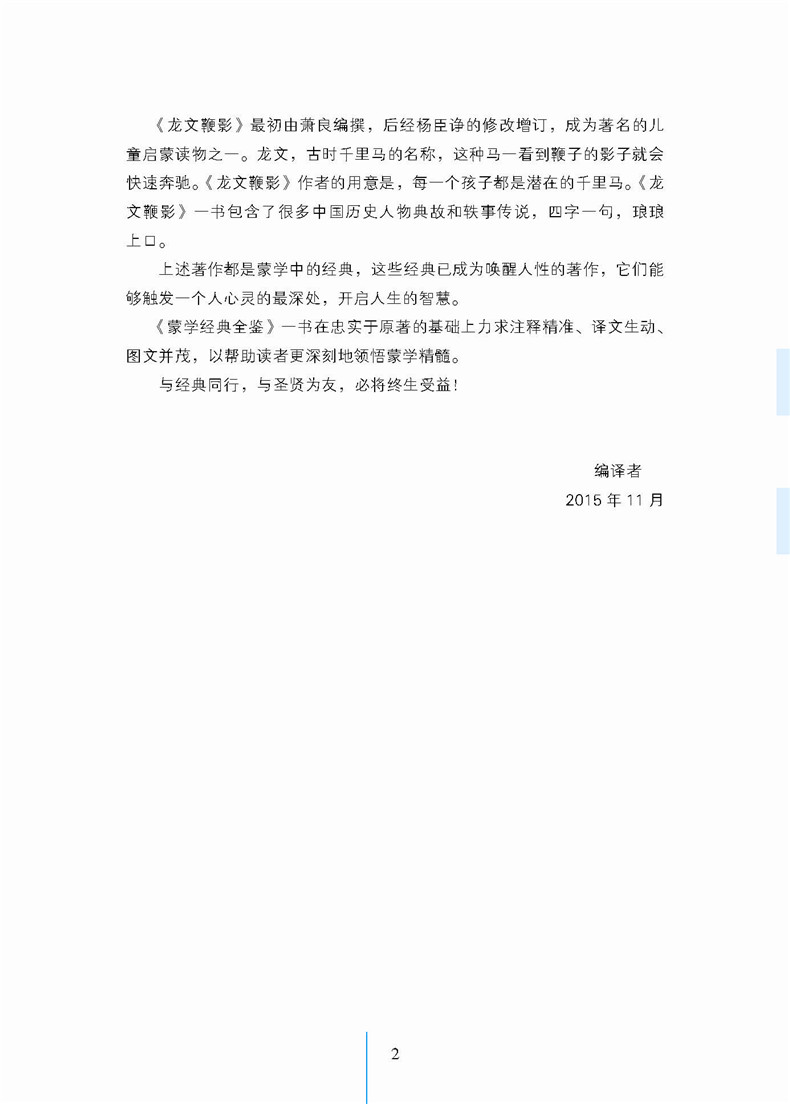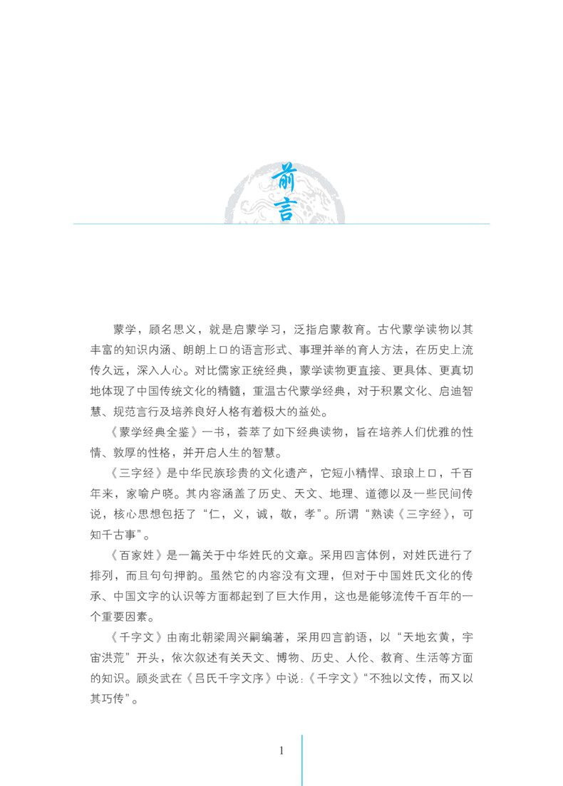 所谓蒙学,即中国传统文化的启蒙教育。对比儒家正统经典,蒙学读物更直接、更具体、更真切地体现了中国传统文化的精髓。《蒙学经典全鉴》收录的《三字经》《百家姓》《千字文》《龙文鞭影》,均被誉为蒙学中的经典,书中许多名言警句脍炙人口、代代相传。重温传统蒙学经典,对于积累文化、启迪智慧、规范言行和培养良好人格有着极大的益处。与经典同行,与圣贤为友,必将终生受益!