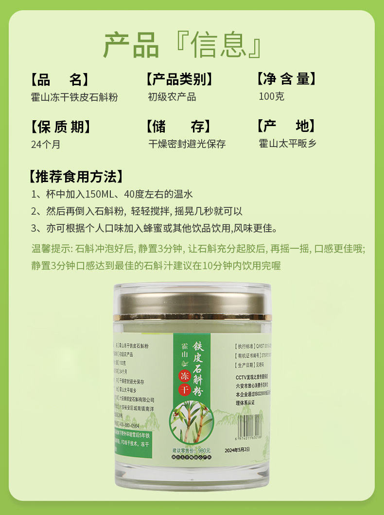 【徽真斛 霍山冻干铁皮石斛粉】专利技术营养好吸收 100g 下单就送木勺一个购买三罐再送精美摇摇杯