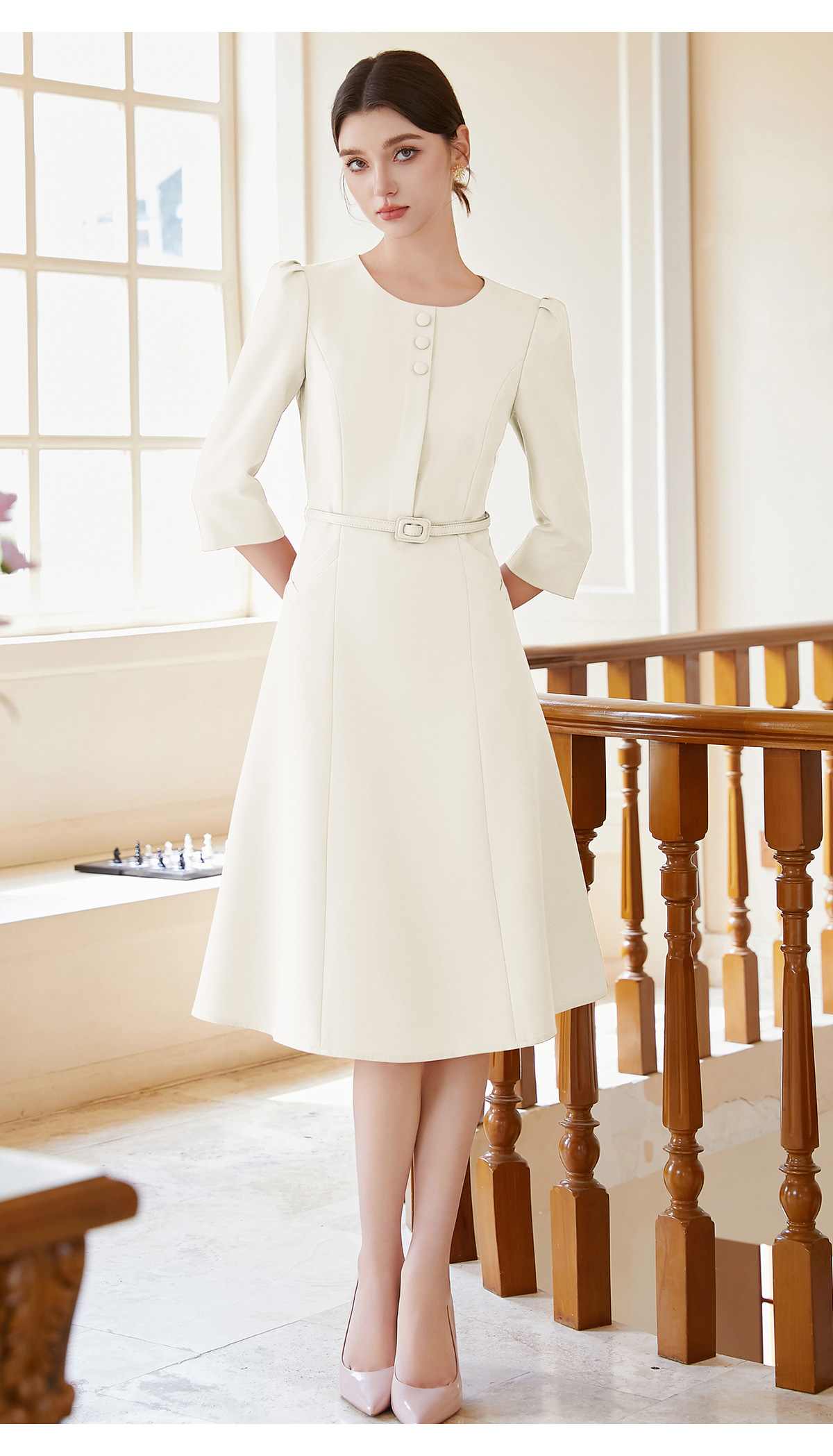 IWY/米白色上班族通勤连衣裙秋装女圆领西装裙七分袖职业装工作服单件Q1173