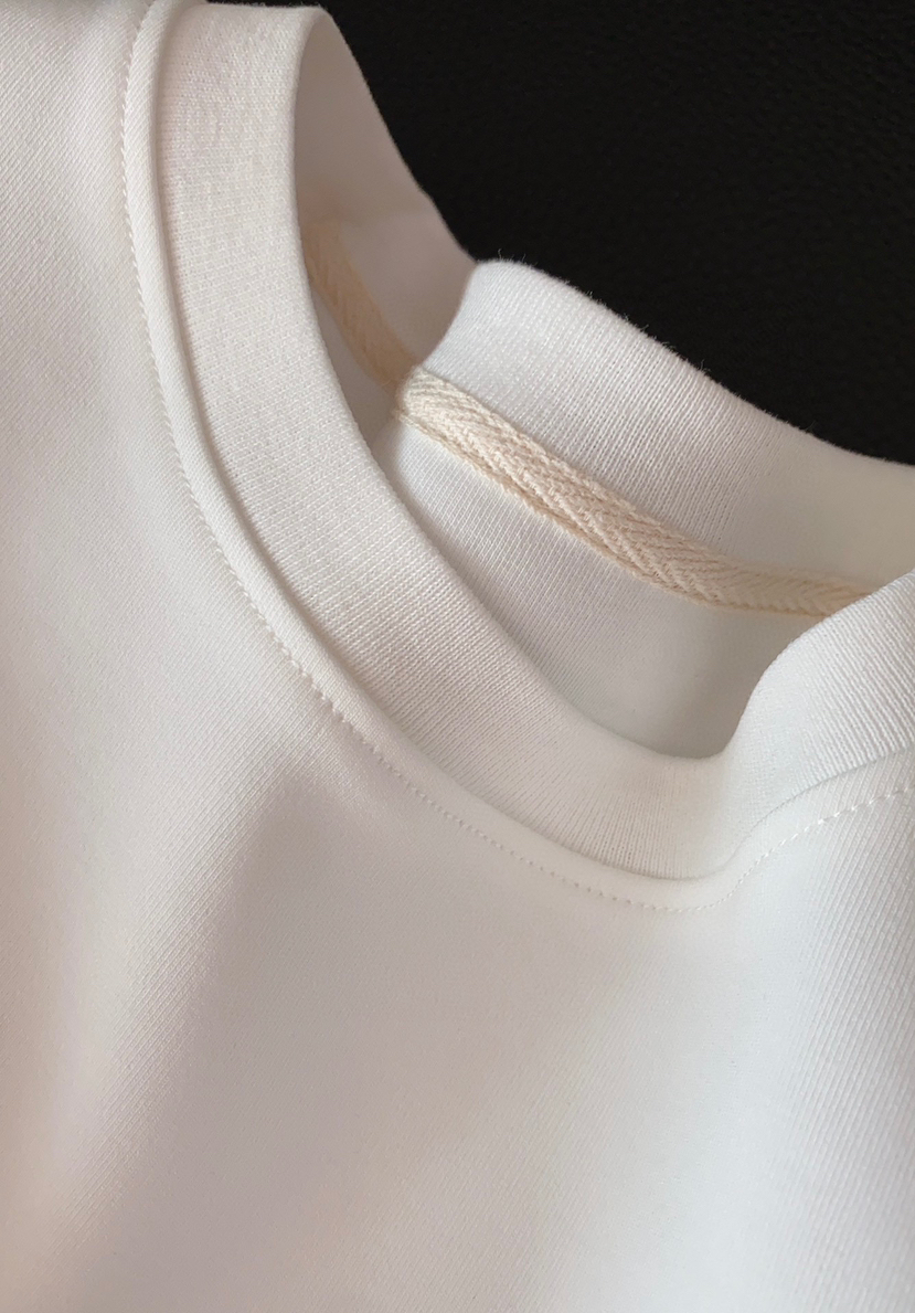 这个圆领,不高一分,不低一寸,螺纹宽度,领口高度,恰到好处,而且后领还有加固,艺术感的made in earth,极简,轻松,高级。