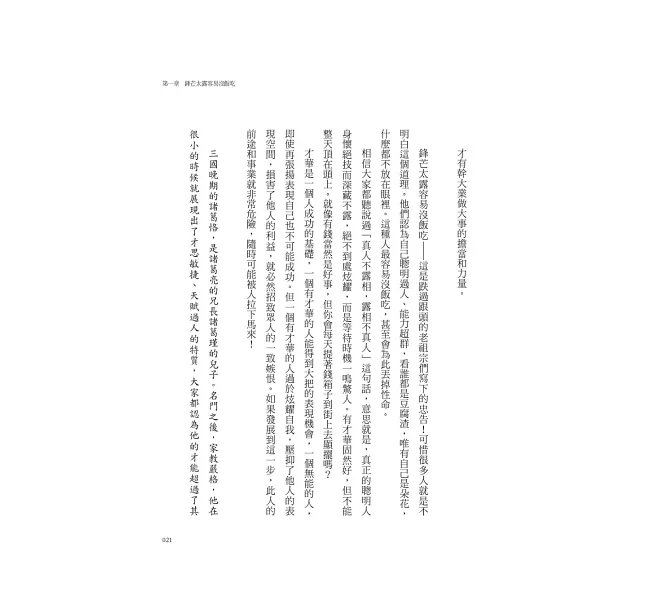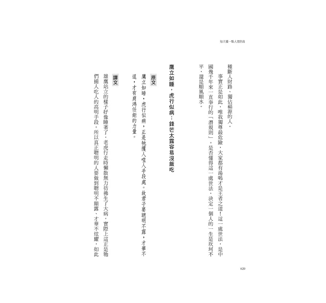 本書是以經典古籍《菜根譚》為基礎,將千年智慧與現今實際狀況相結合,涵蓋原文的精義,並搭配解讀,從當下各類處世、人際、家庭、職場等面向切入,向讀者揭示人情世故背後的本質與內在規律,以及因應的策略,例如: