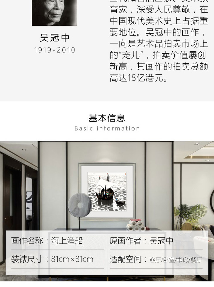 吴冠中综合版画《海上渔船》装裱尺寸:81cm×81cm
