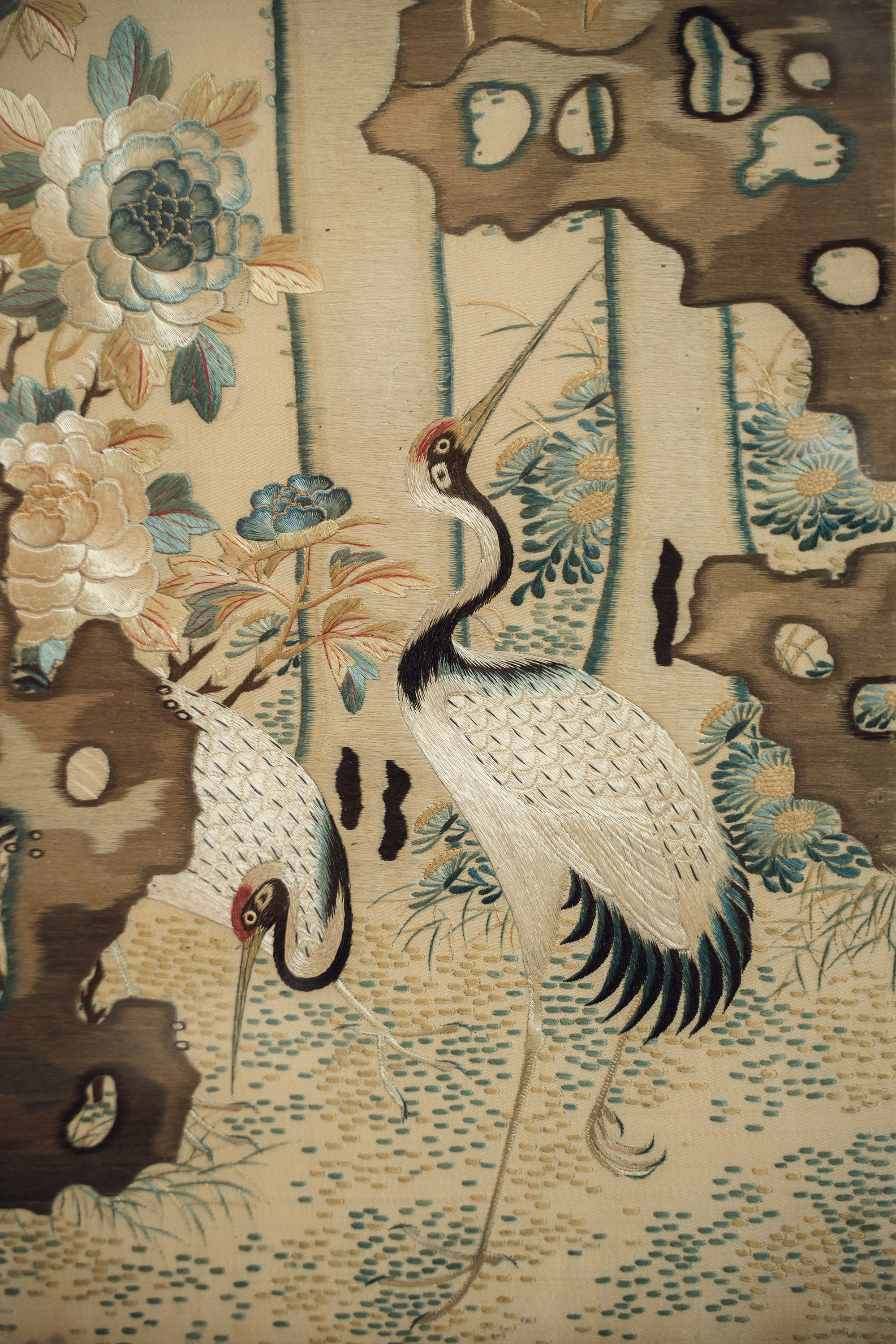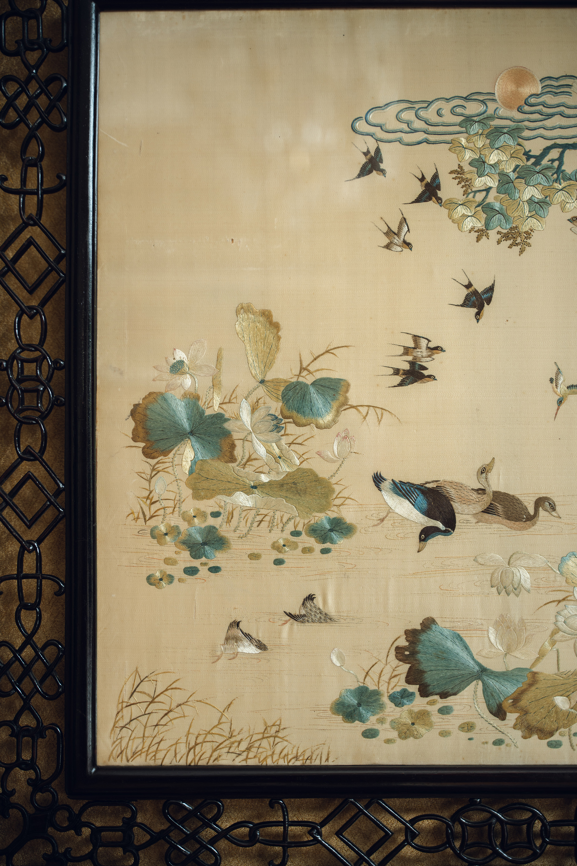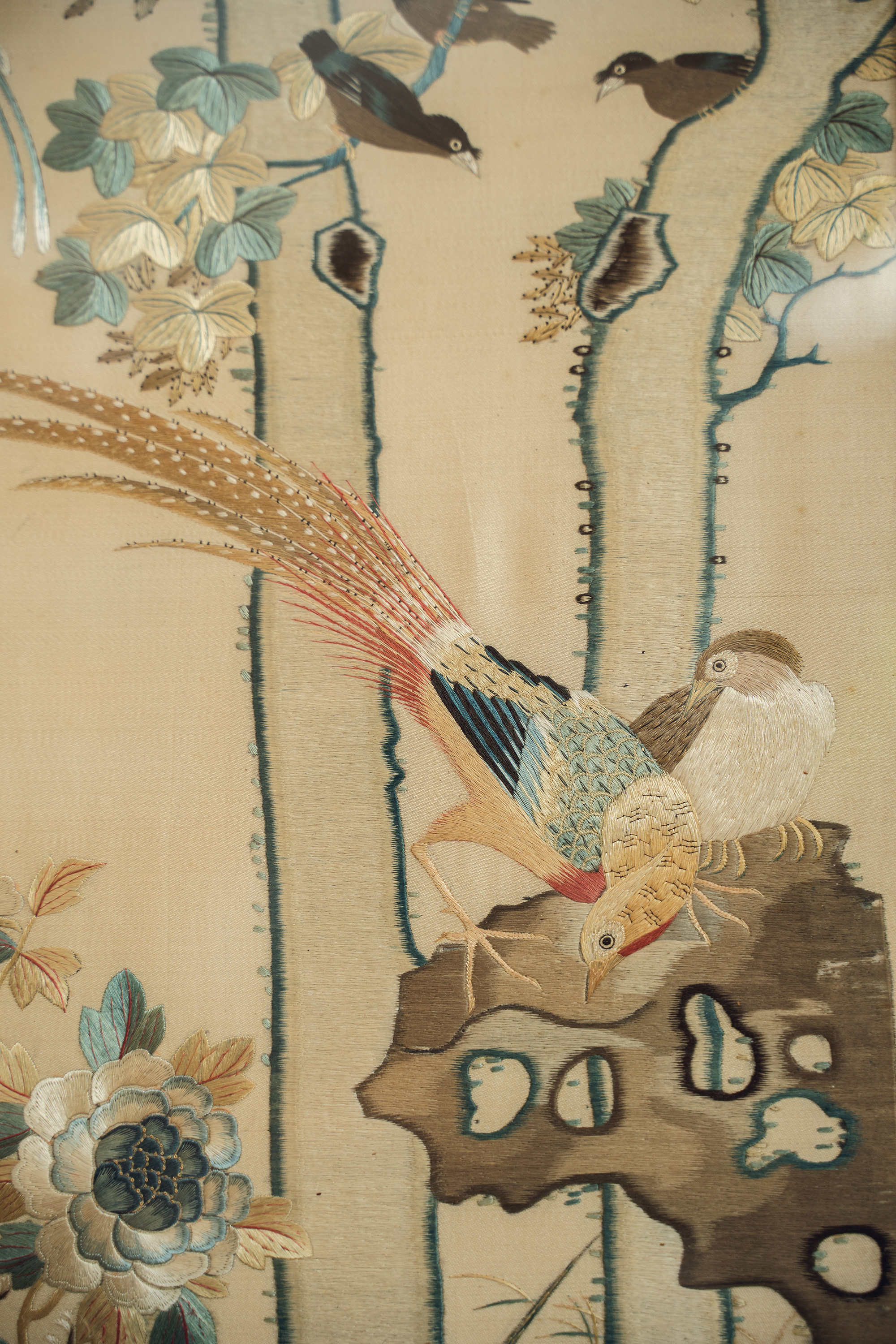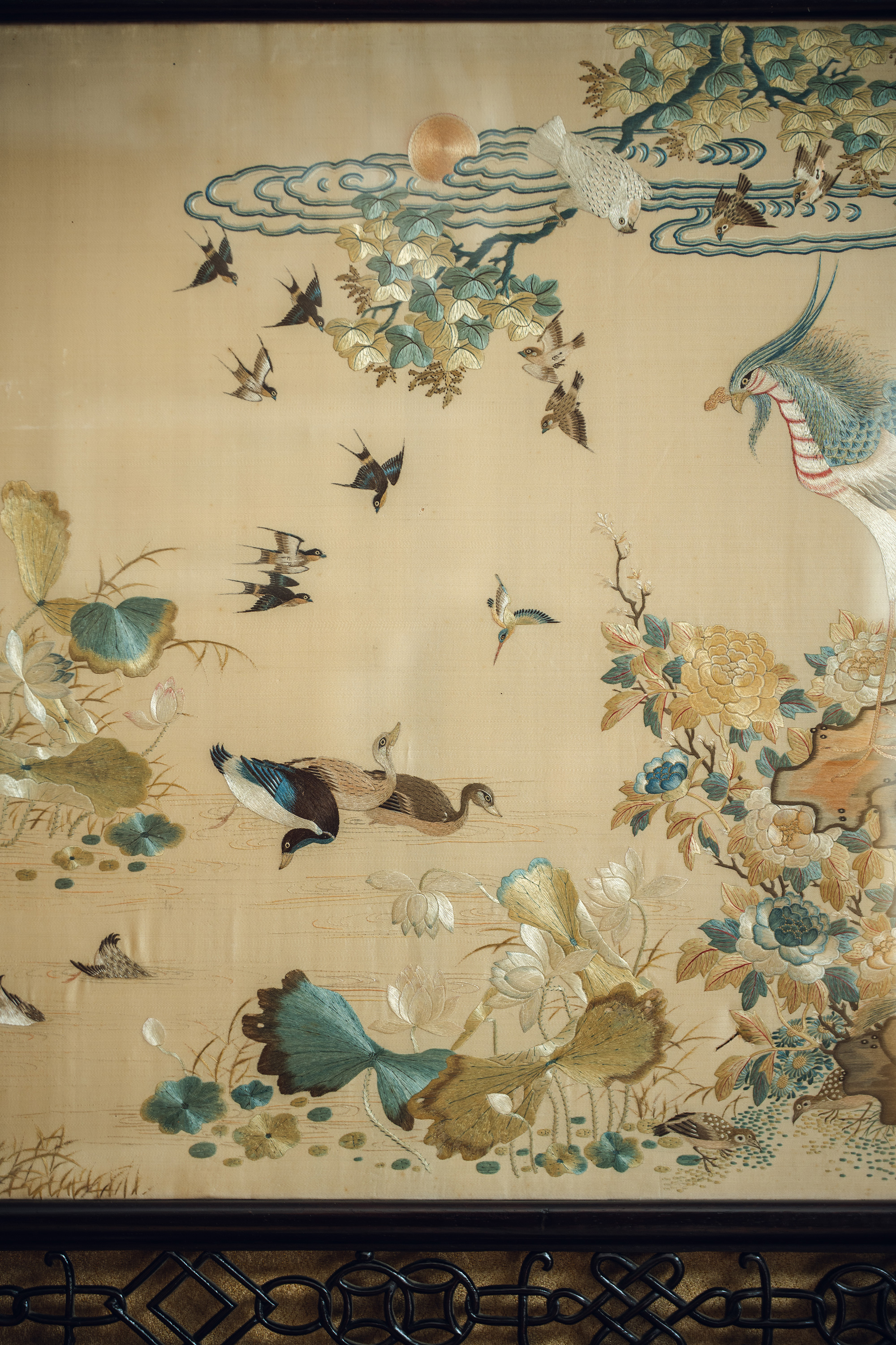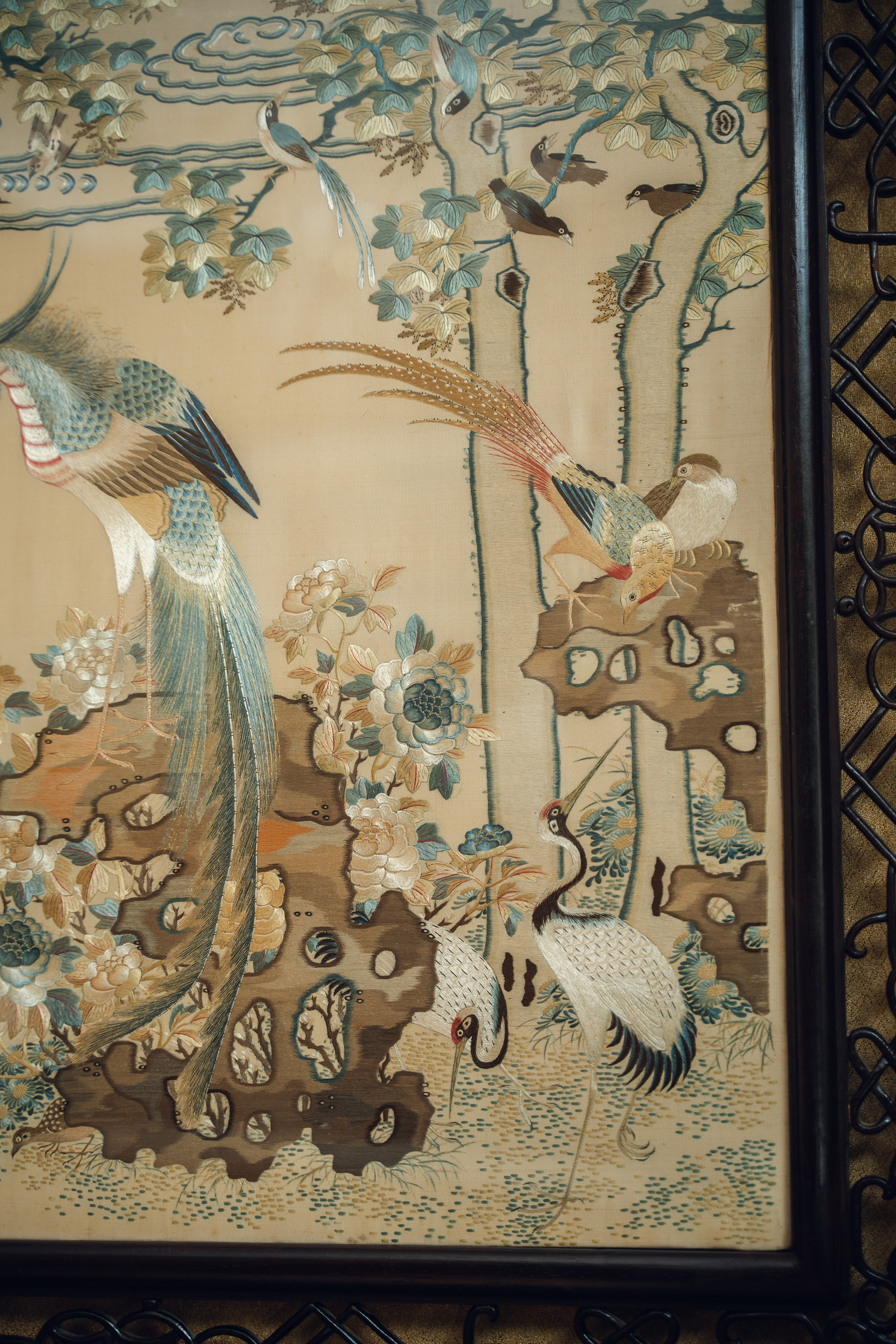 19世纪末中国清代出品硬木镂雕边框装饰「奇石瑞禽」传统东方花鸟主题粤绣挂画