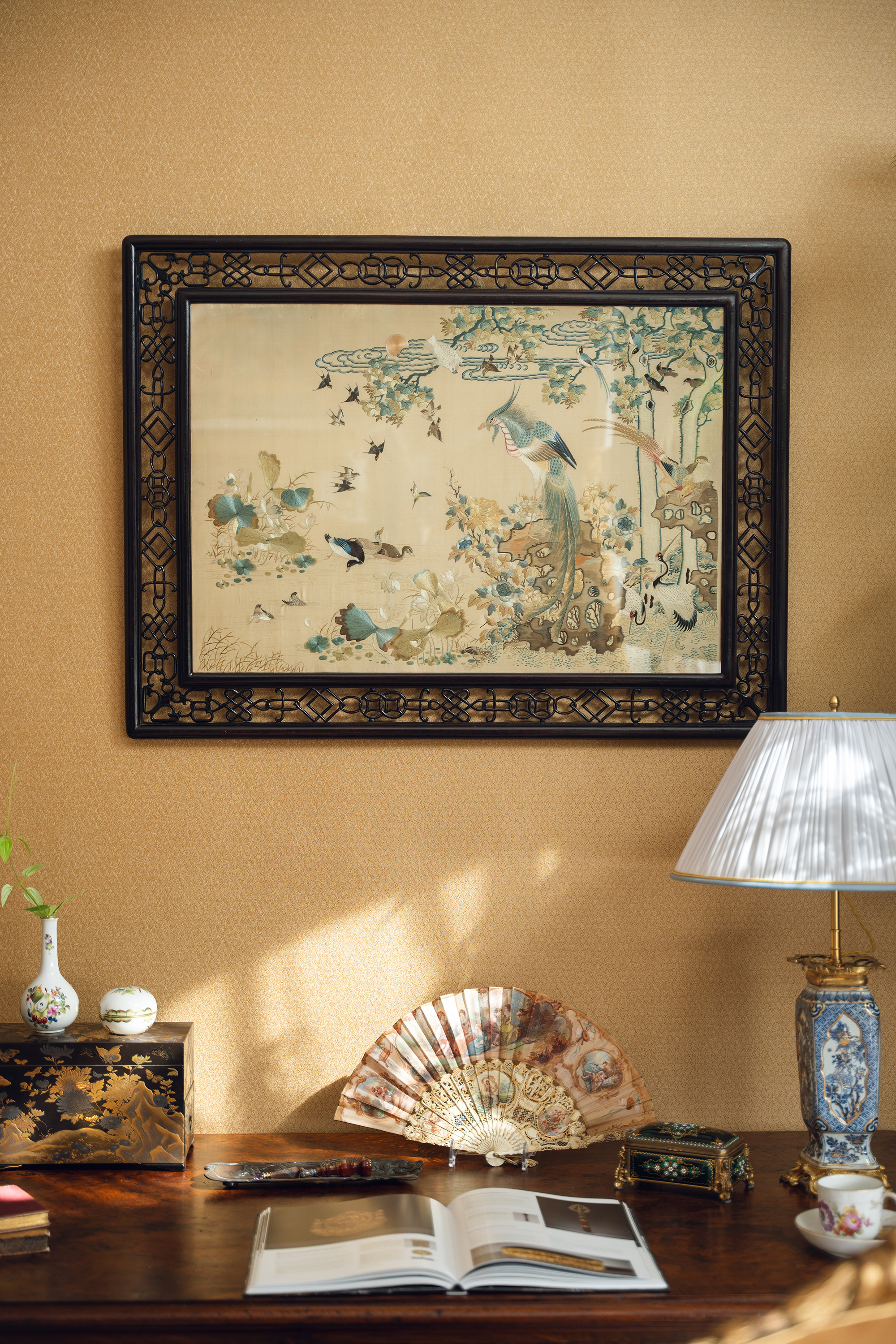 【已售】独角鹿西洋古董19世纪末中国清代出品硬木镂雕边框装饰「奇石瑞禽」传统东方花鸟主题粤绣挂画
