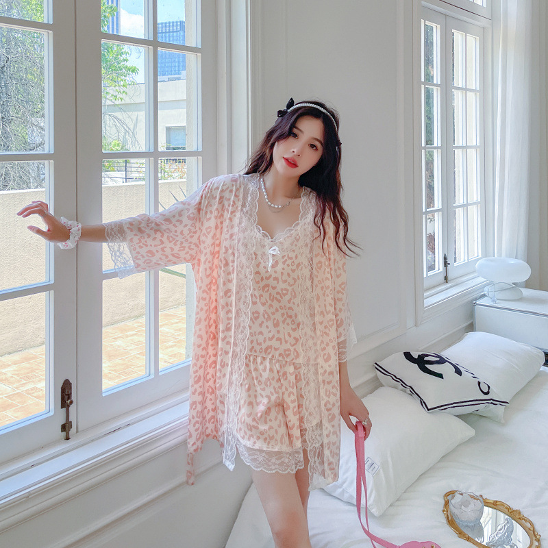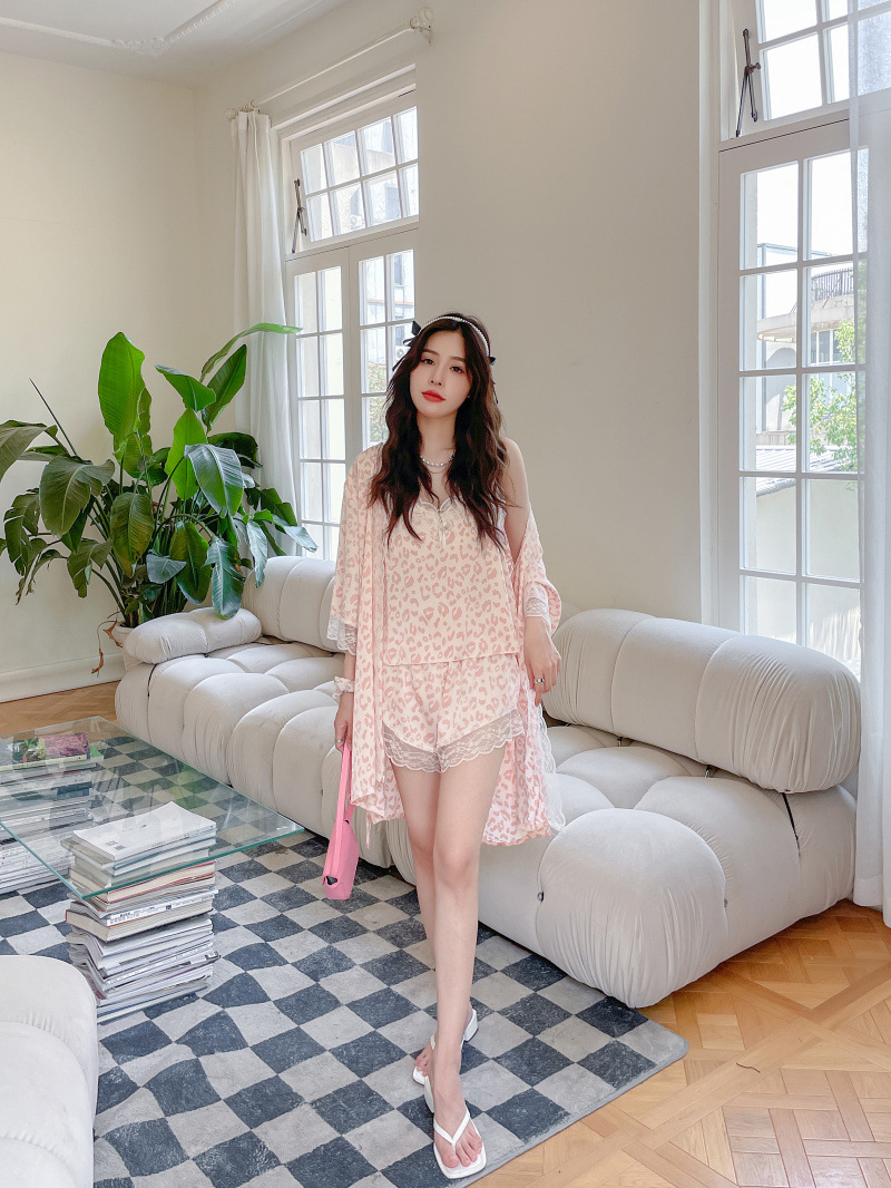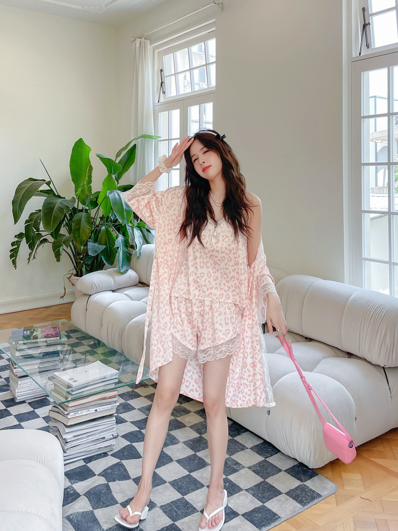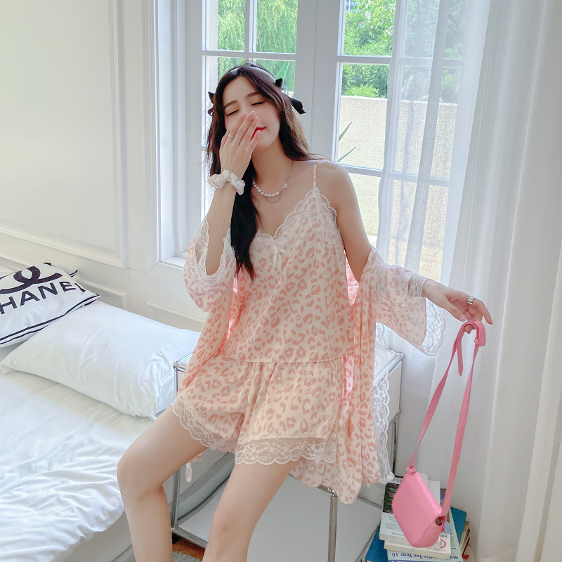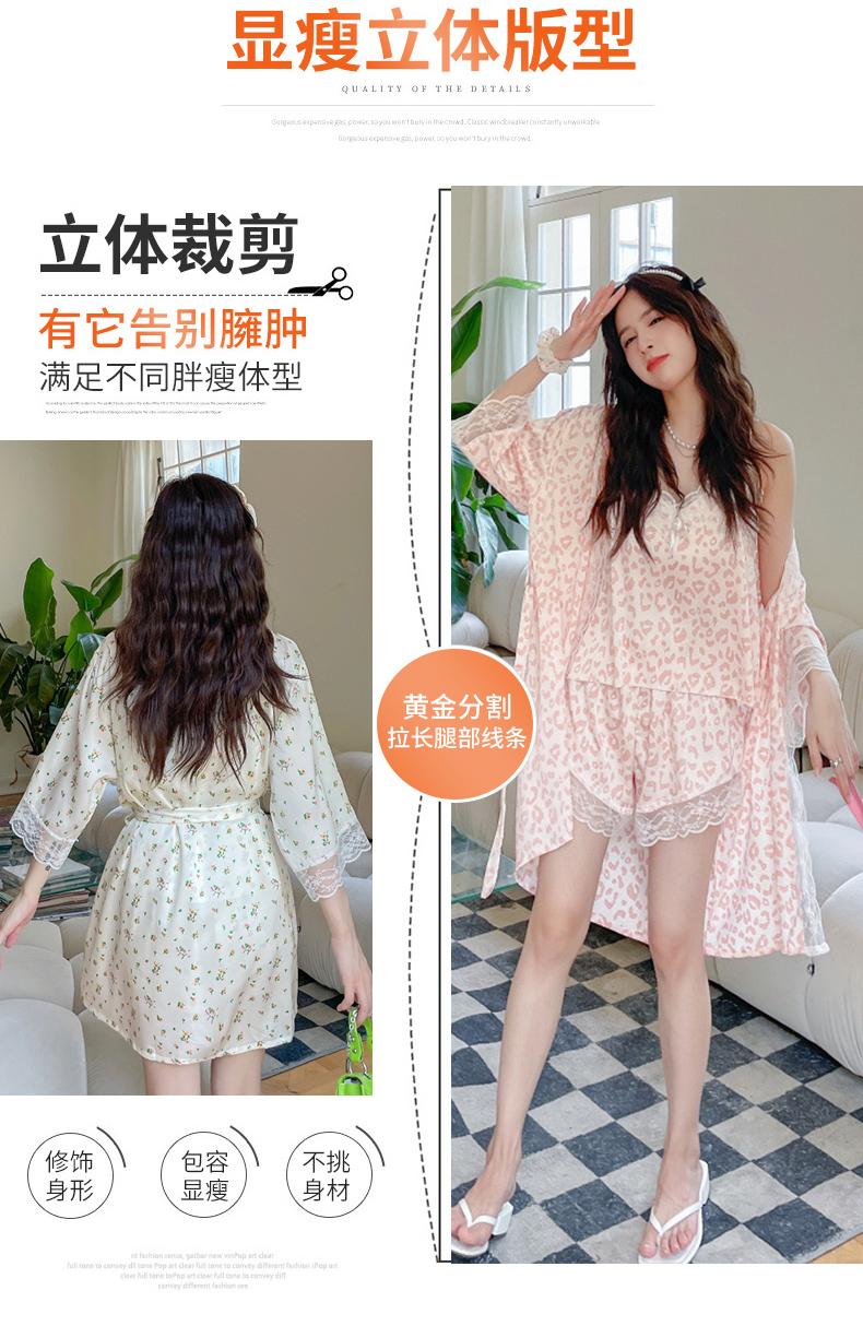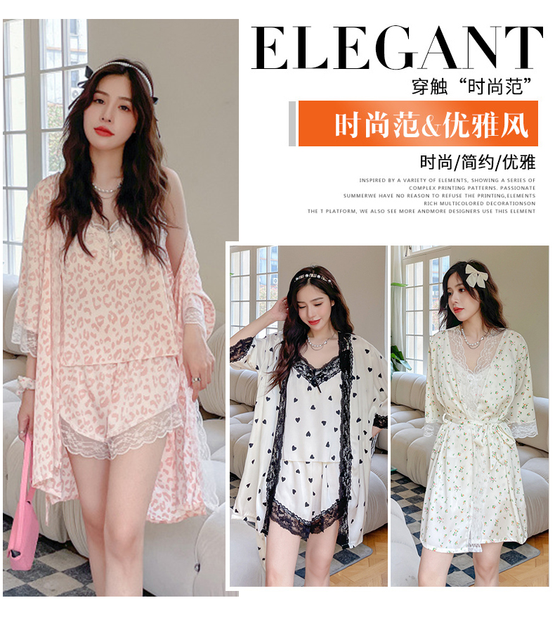 新款夏季冰雪丝睡衣女性感吊带短裤外袍薄款甜美三件套 QYSY666