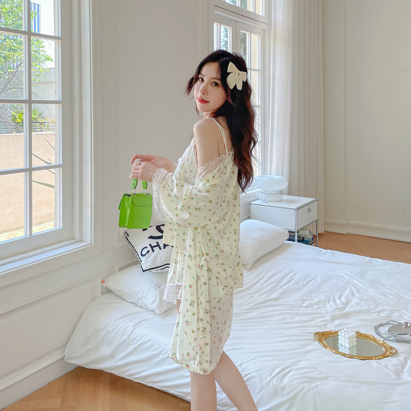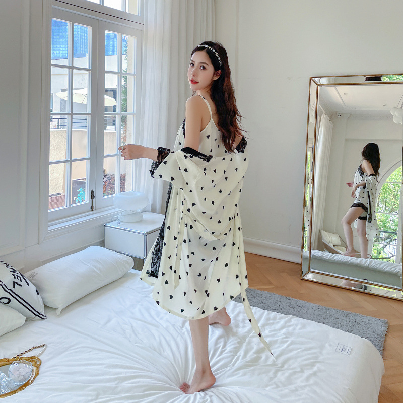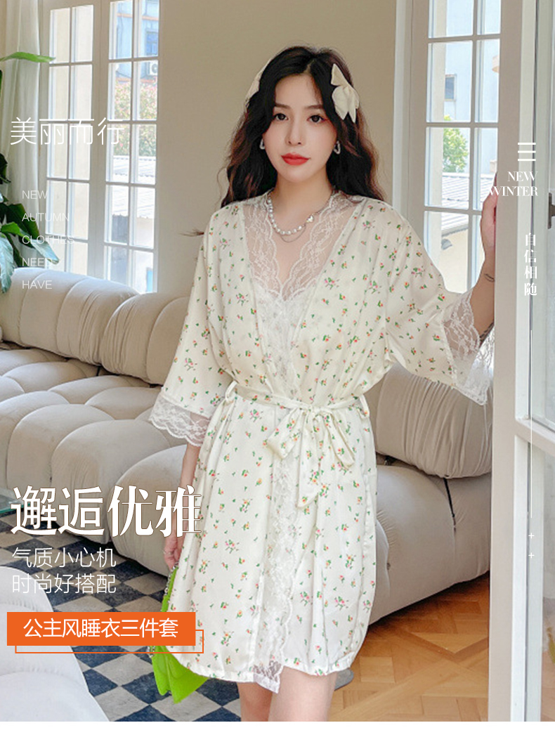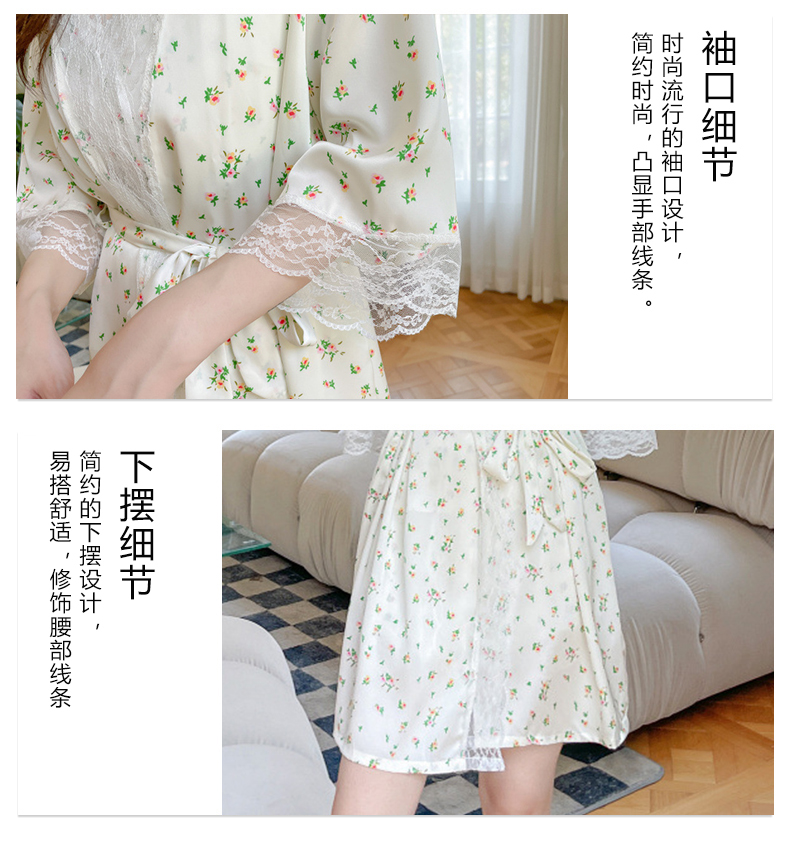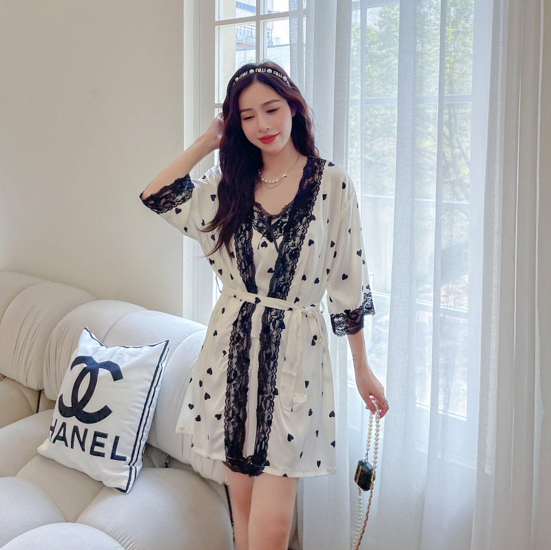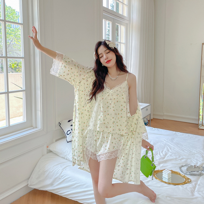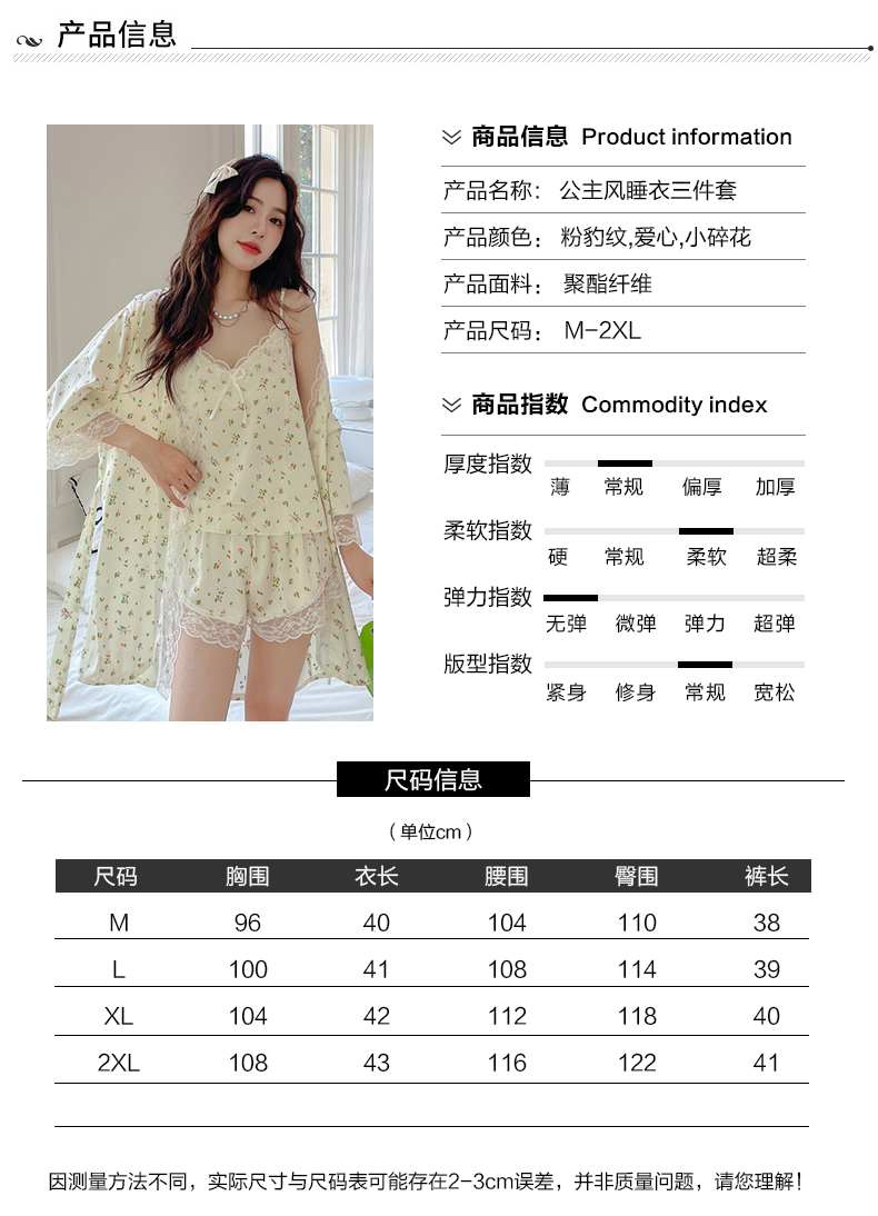新款夏季冰雪丝睡衣女性感吊带短裤外袍薄款甜美三件套 QYSY666