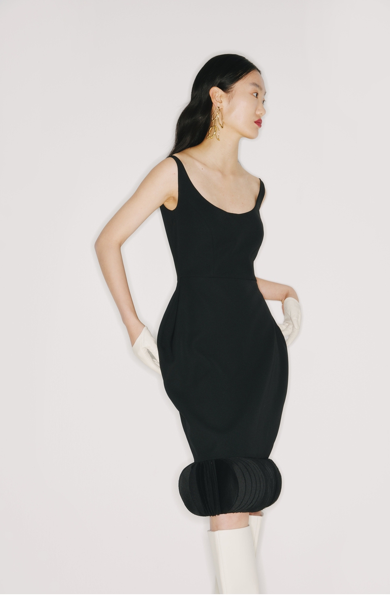 【圆半】裙摆立体裁片拼接圆弧领黑色收腰设计连衣裙/2200001