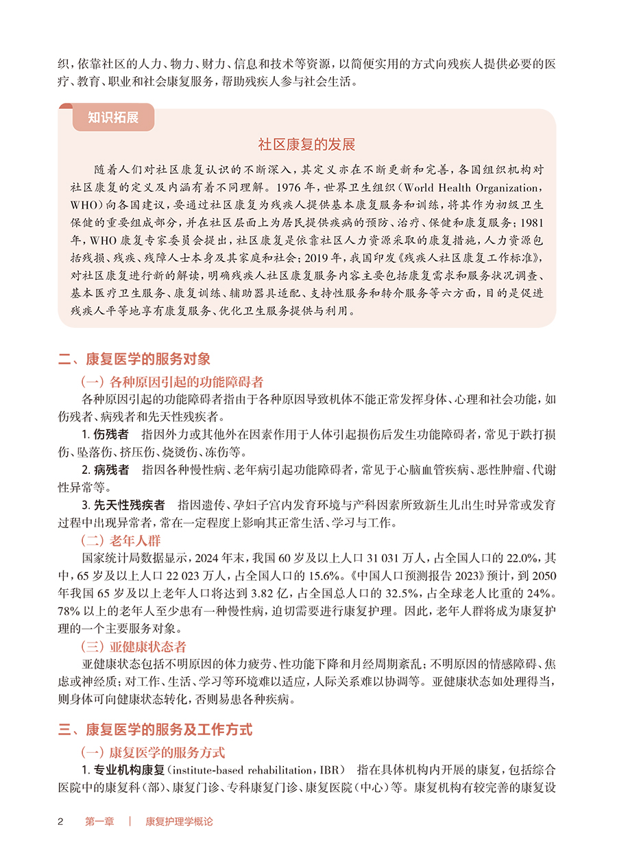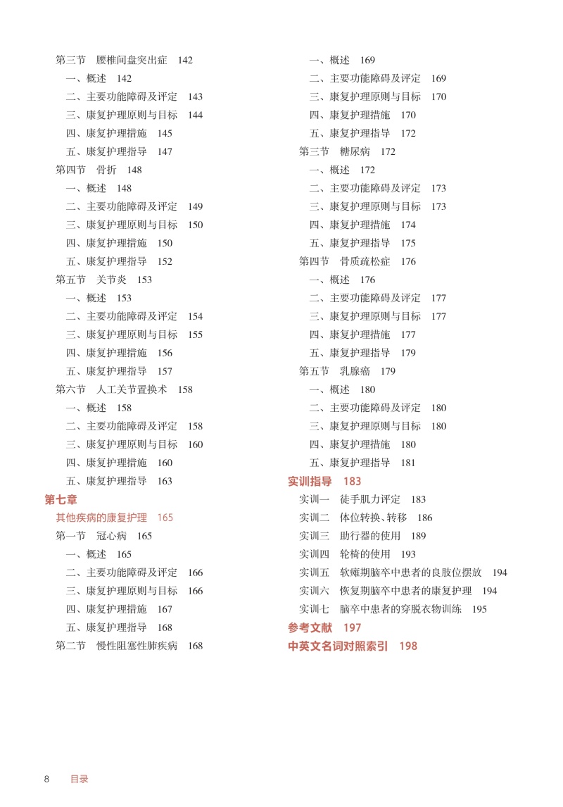 本教材为高等职业教育专科护理类专业“十四五”规划教材、国家卫生健康委员会“十四五”规划教材之一。本教材以“康复护理评定、康复治疗基本技术、康复护理基本技术、各系统常见疾病的康复护理”为基本编写框架,每节设有情境导入并提出问题,书后设置相应的实训指导,使学生更好掌握康复护理技能,以培养应用型人才。主要内容包括:①了解康复护理基本概念、模式和相关知识理论;②掌握康复护理评定方法、康复护理基本技术;③熟悉康复治疗基本技术;④掌握脑卒中、脊髓损伤、脑性瘫痪、阿尔茨海默病、颈肩腰腿痛、糖尿病病人的康复护理;⑤熟悉颅脑损伤、帕金森病、骨折、冠心病、慢性阻塞性肺疾病病人的康复护理;⑥了解人工关节置换术、关节炎病人的康复护理;⑦正确运用康复技巧,协助迟缓期偏瘫病人进行康复的能力;⑧具有保护病人安全、尊重病人的意识。